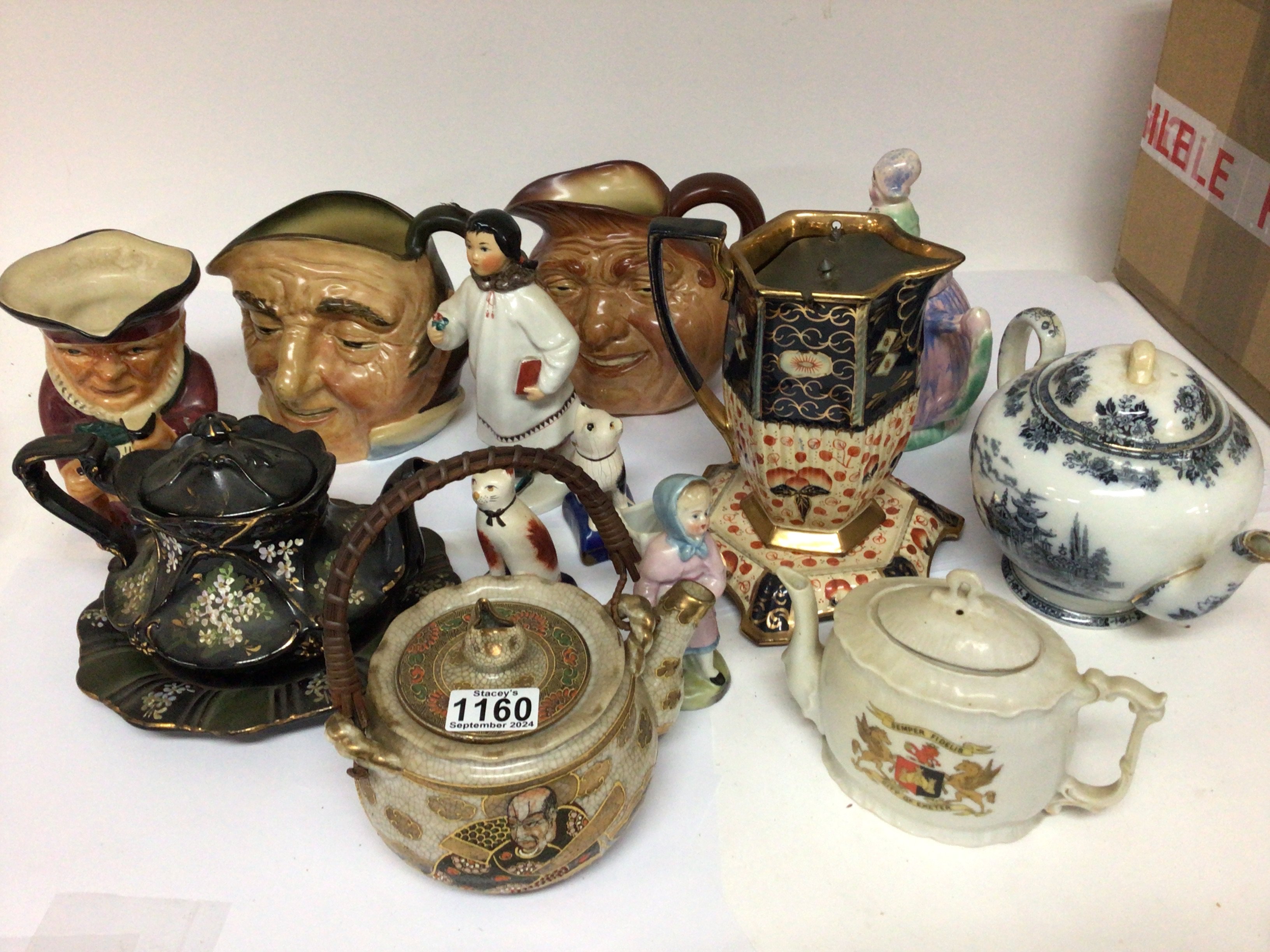 A collection of ceramics a Russian figure Doulton caricature jugs tea pots and other ornaments.