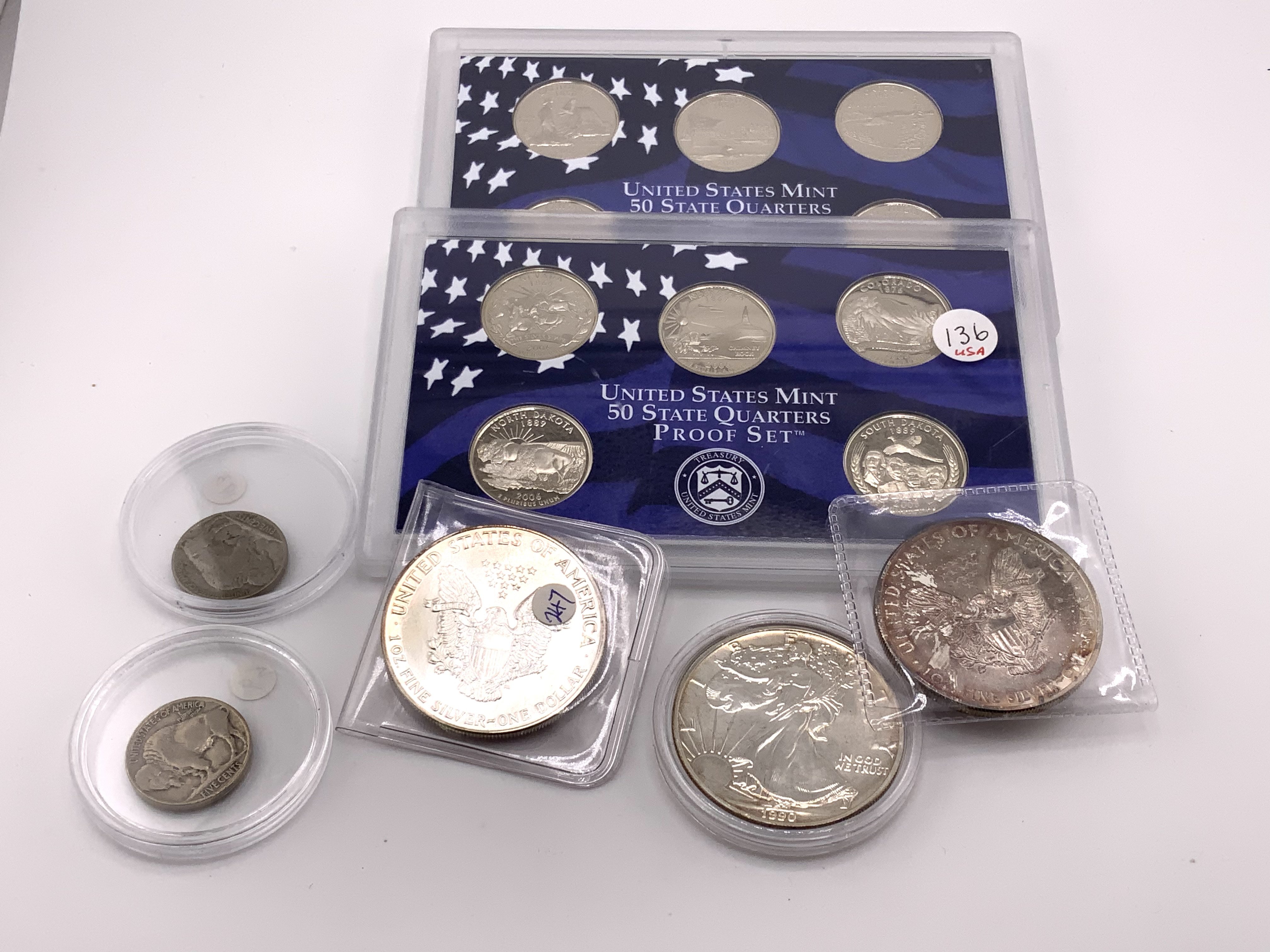 A collection of American coinage to include 3 fine silver 1OZ dollars, 2 Buffalo nickels, 2 cased sets of quarters. (B)