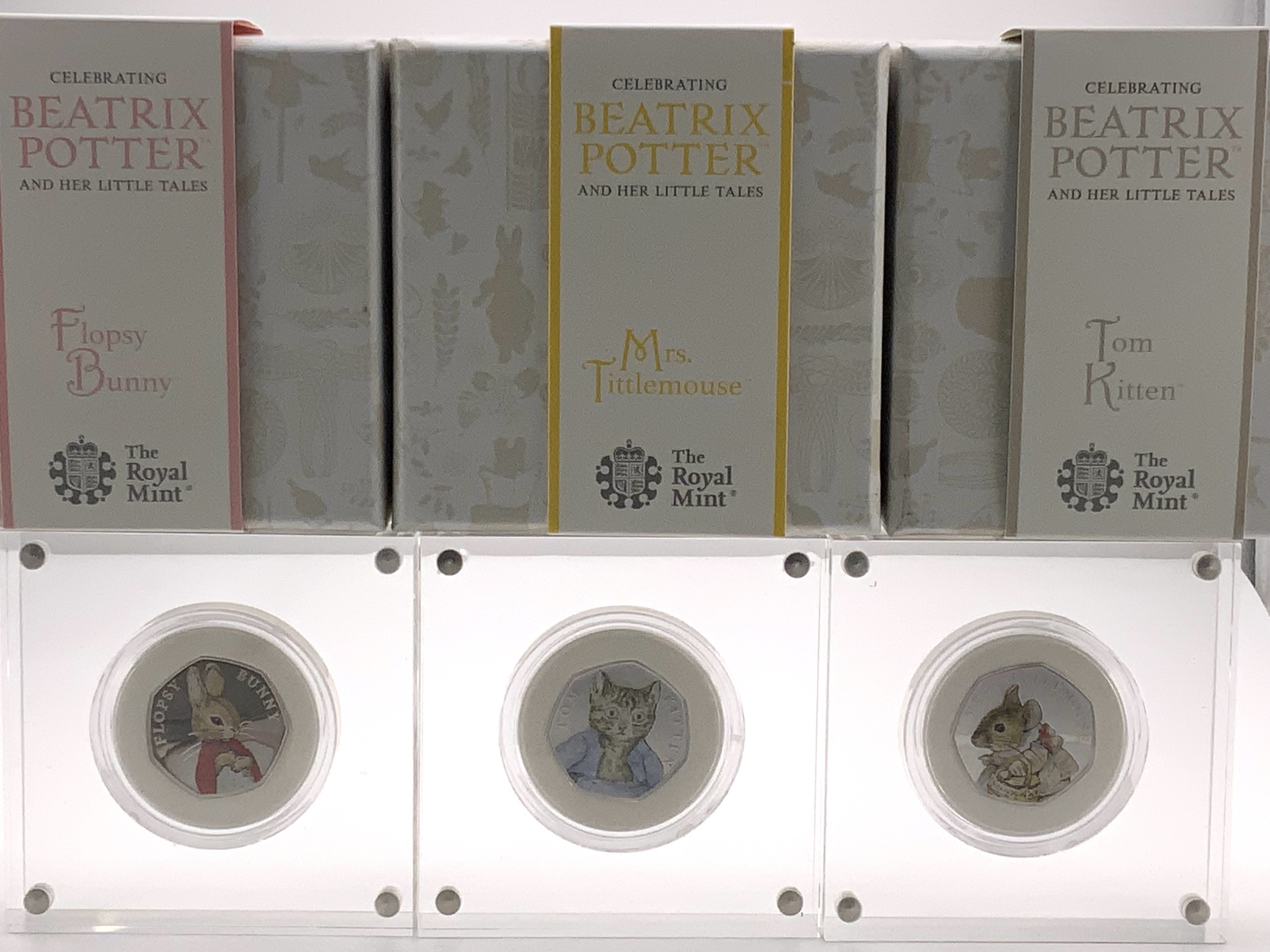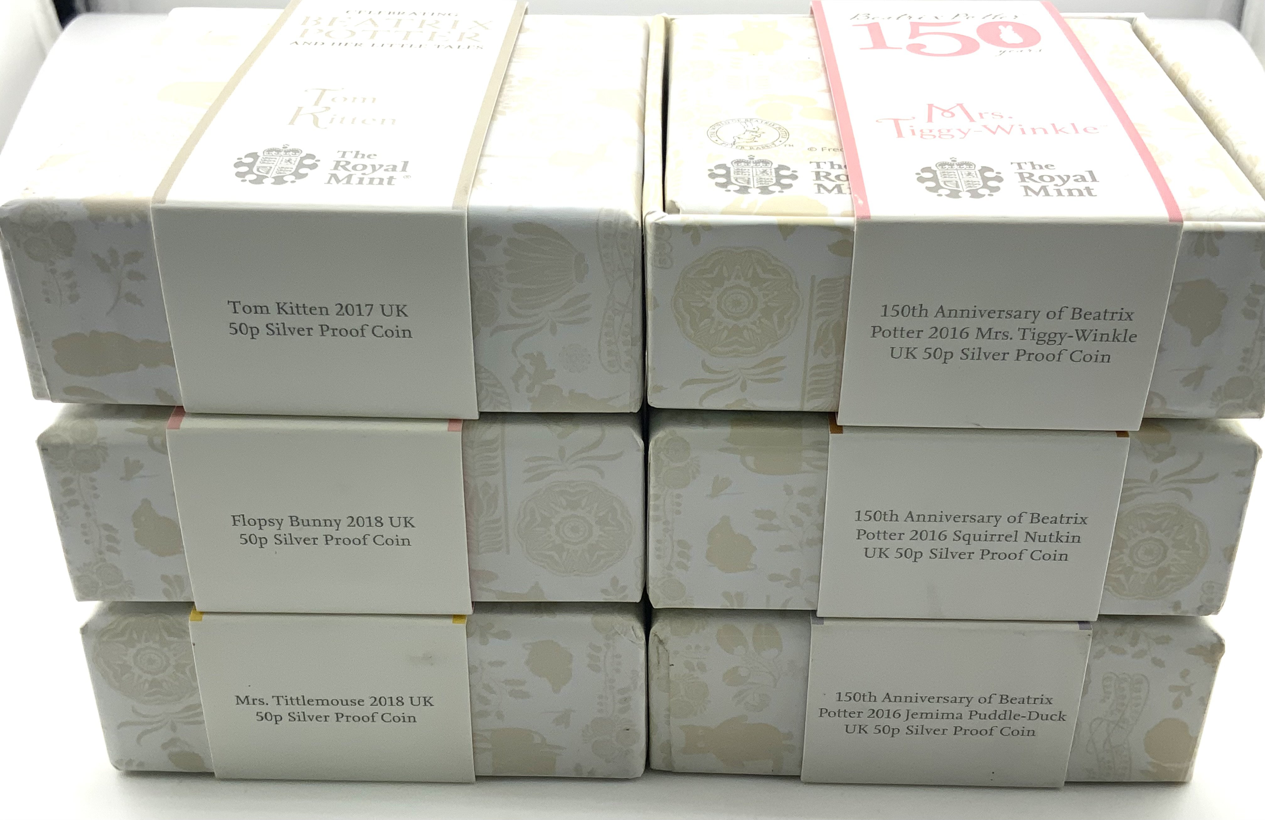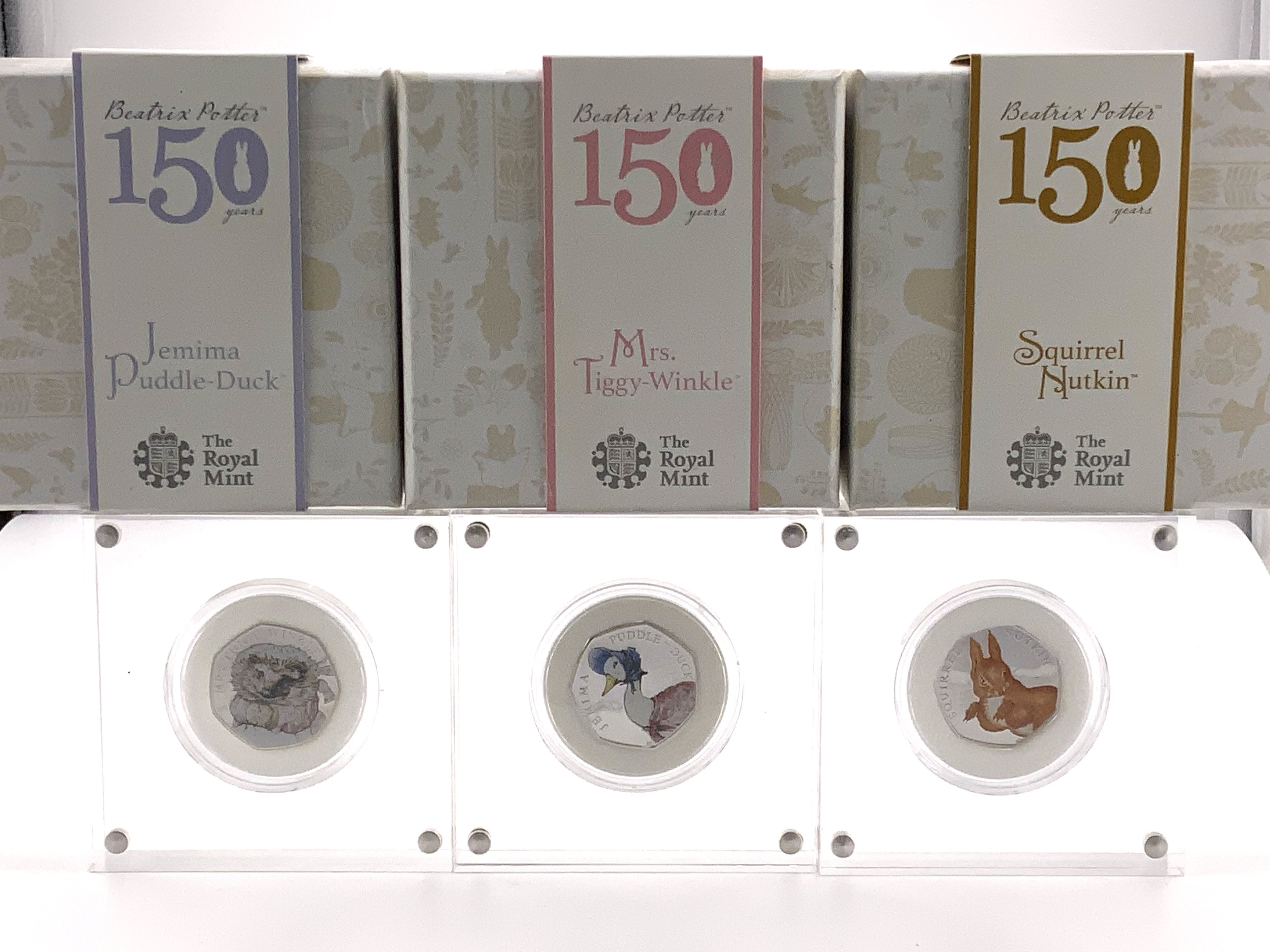 3 cased 150th Anniversary of Beatrix potter 2016 UK Silver proof coins including Squirrel Nutkin, Mrs Tiggy Winkle, Jemima Puddle Duck, together with later editions 2017 Tom Kitten Silver proof 50p, 2018 Mrs Tittle mouse and Flopsy Bunny silver proof 50p coins. (B)