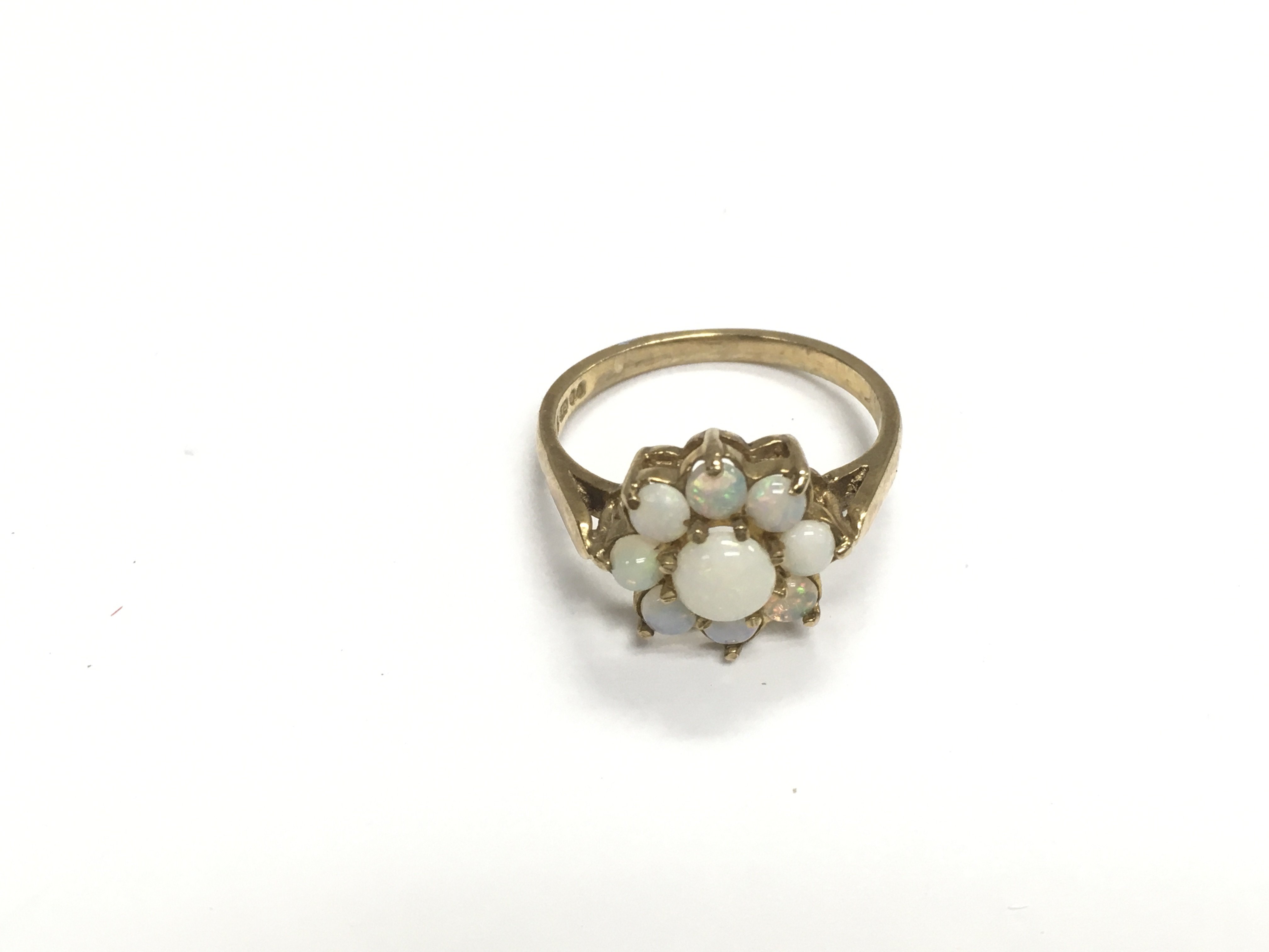 A 9ct gold ring set with opals in the form of a flower head, approx 2.8g and approx size O-P. Shipping category A.
