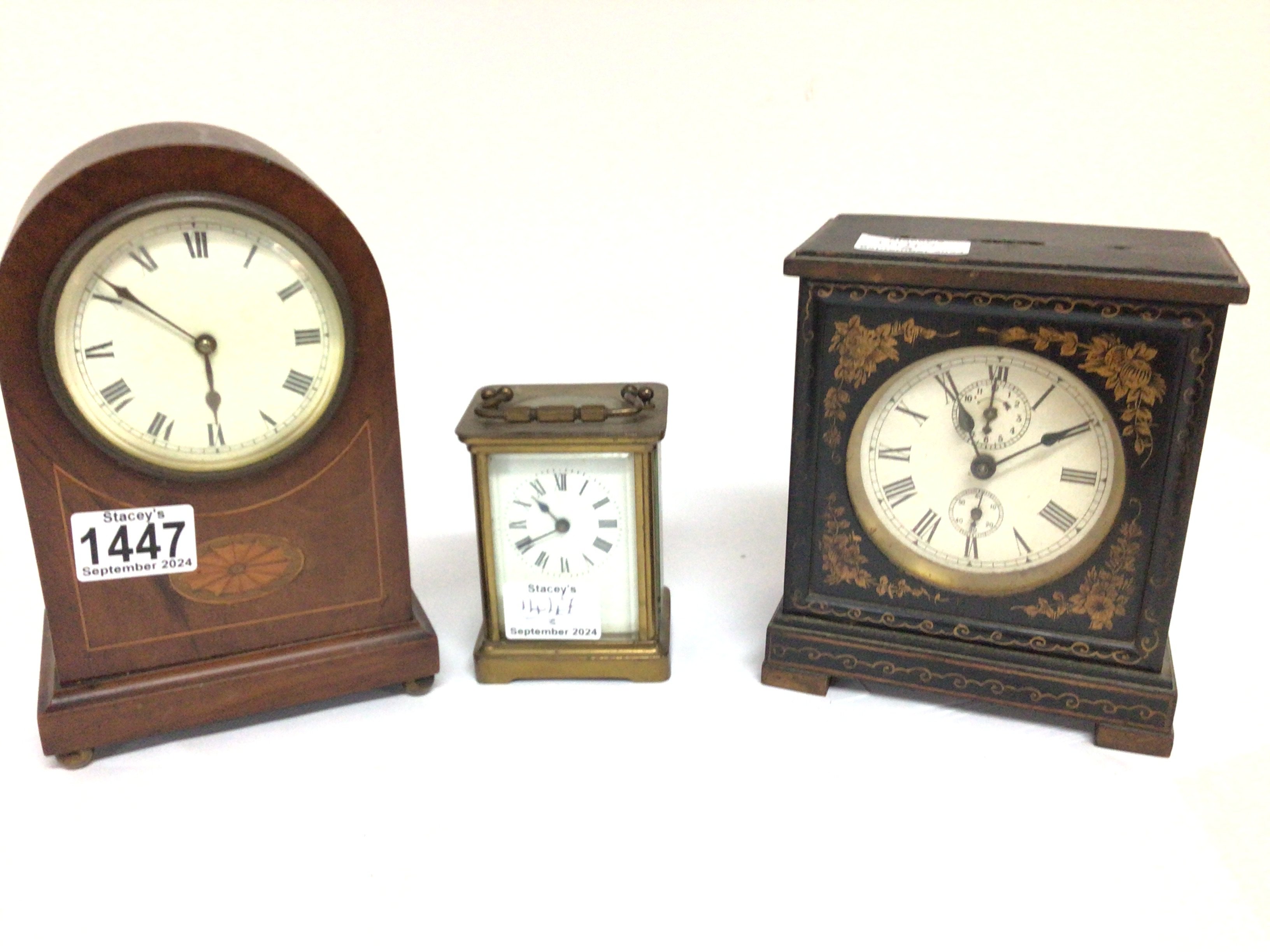 An Edwardian mantel clock a brass carriage clock and a black lacquer clock and one other. (4)