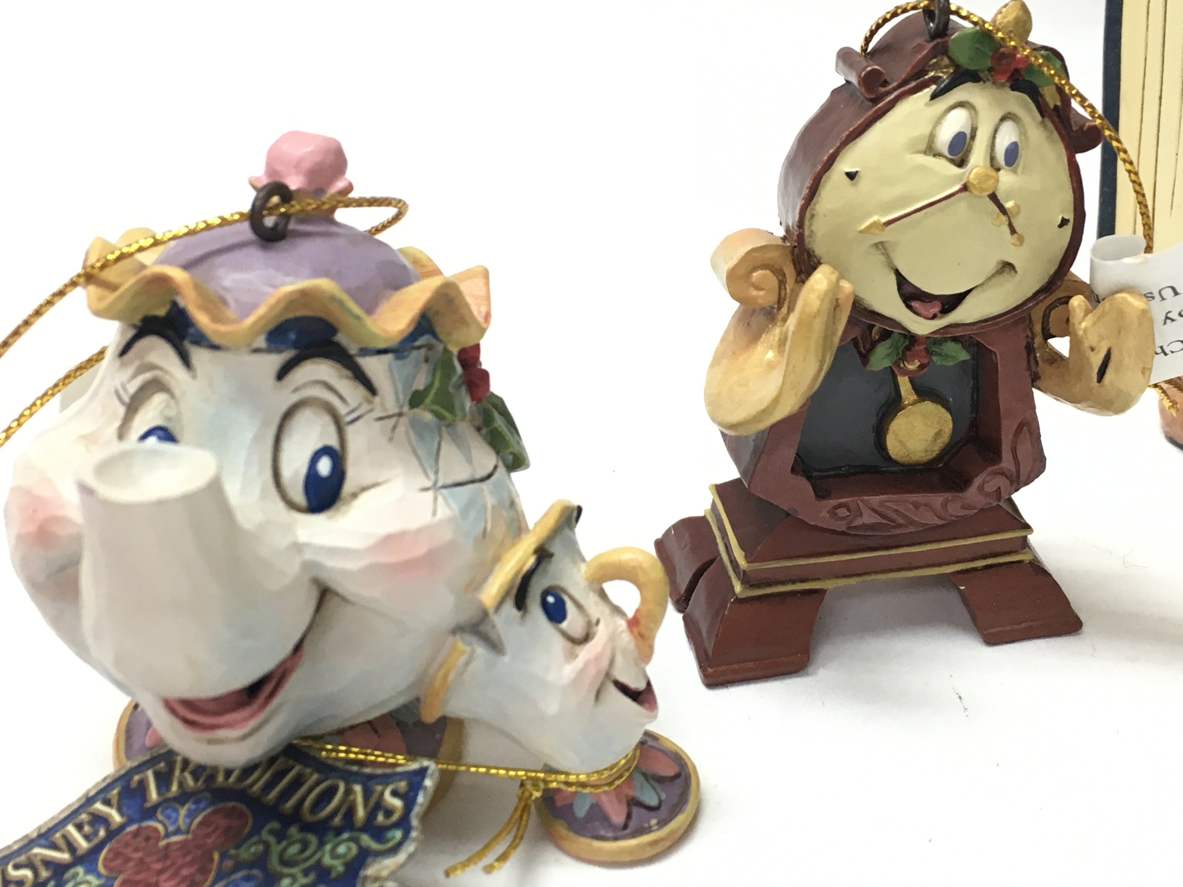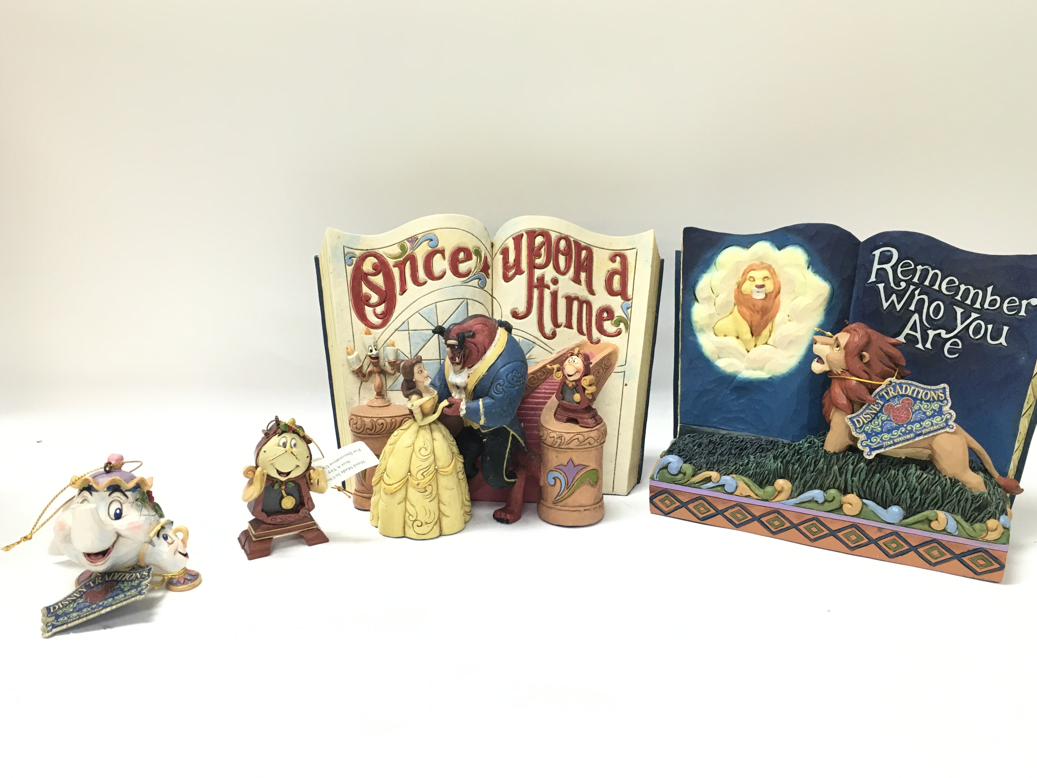 Boxed Disney Traditions Showcase Collection Storybook ceramic figures groups. Figures including 4031483 Love Endures, 6001269 Remember Who You Are, A21429 Cogsworth hanging ornament etc. No obvious damage or restoration This lot cannot be posted