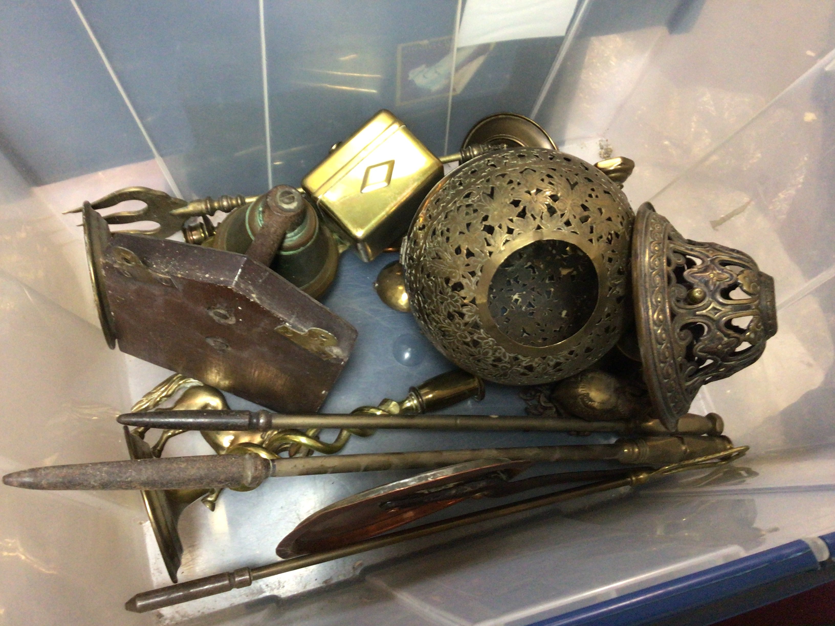 A Victorian copper kettle and stand a brass jardiniere and a quantity of other brass and copper oddments.
