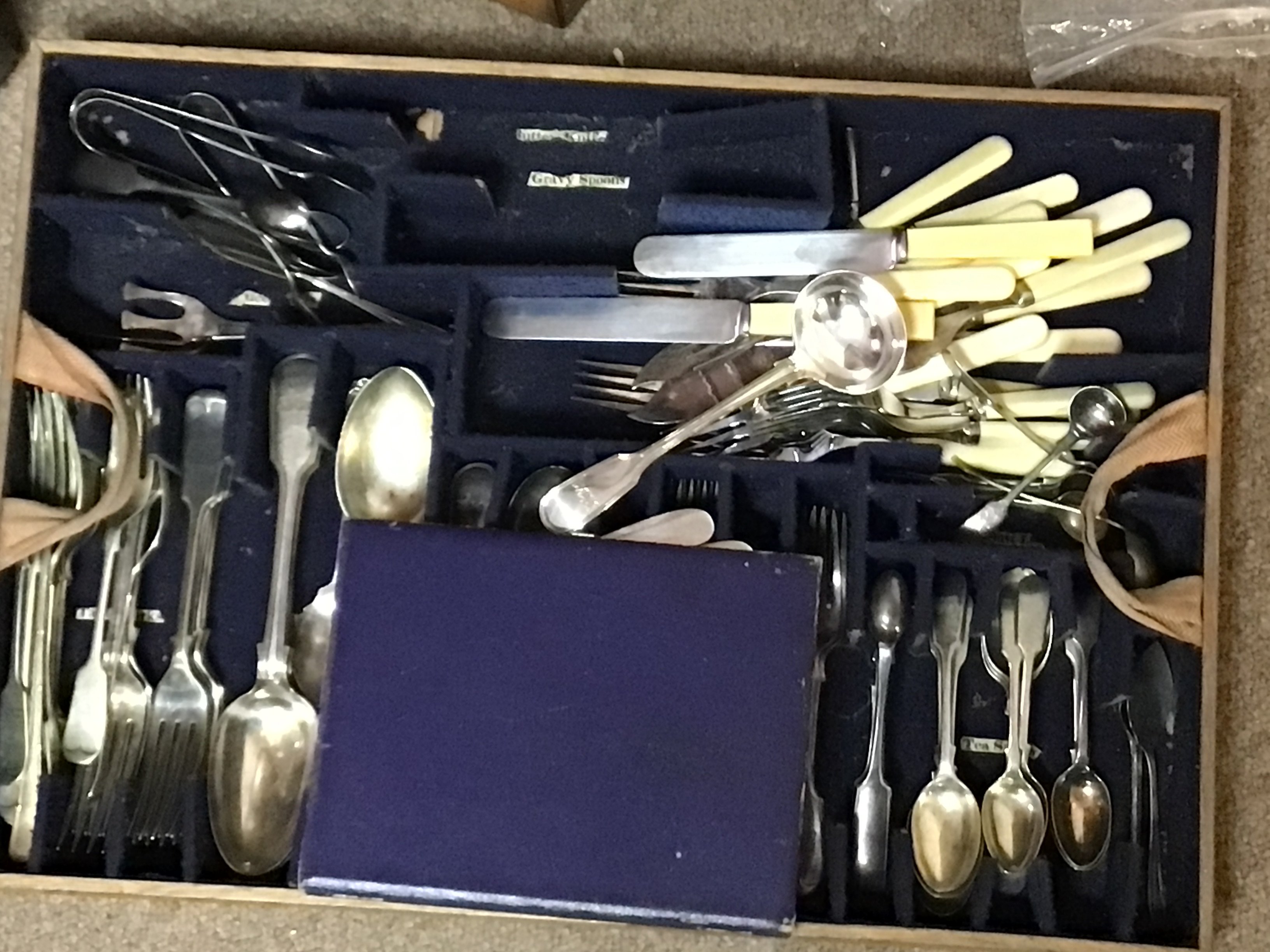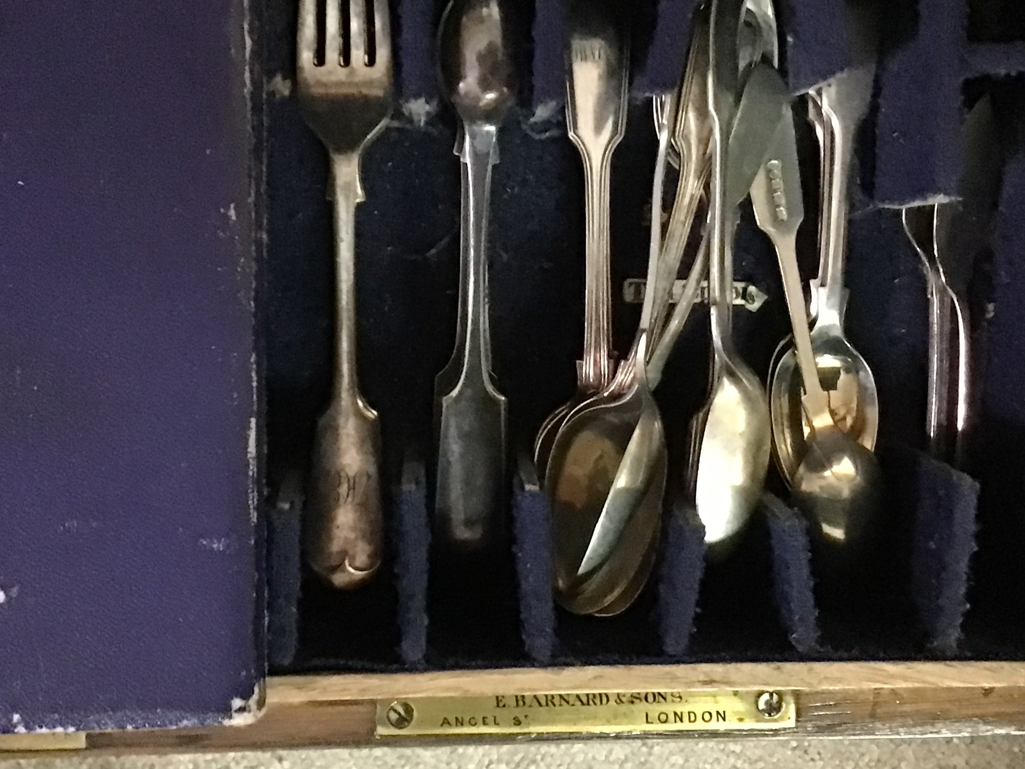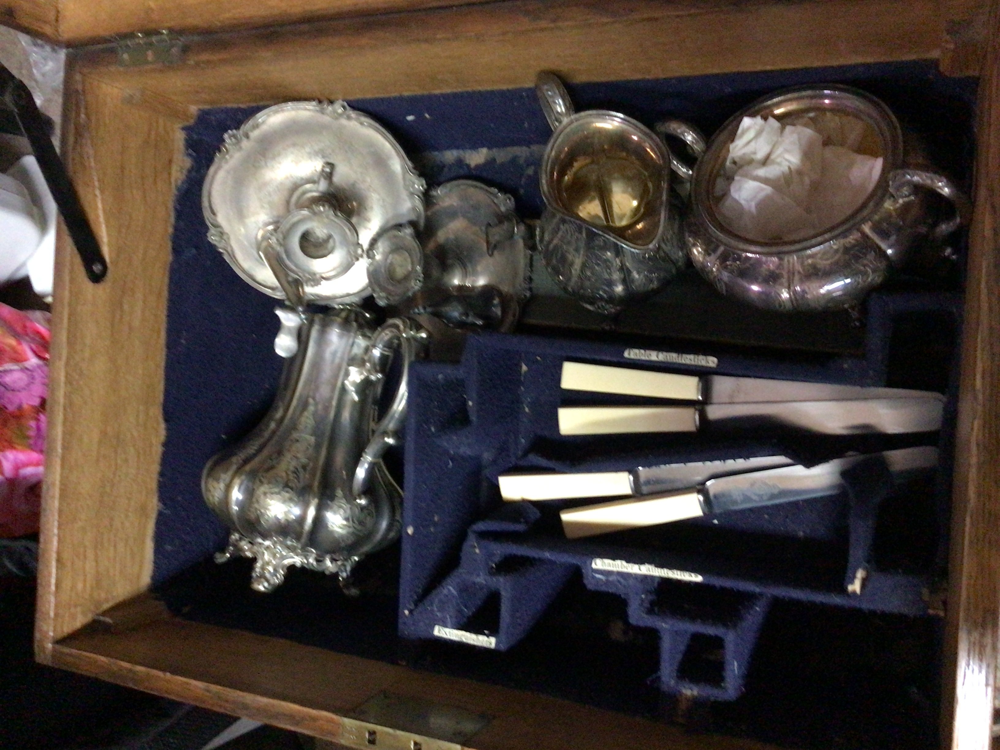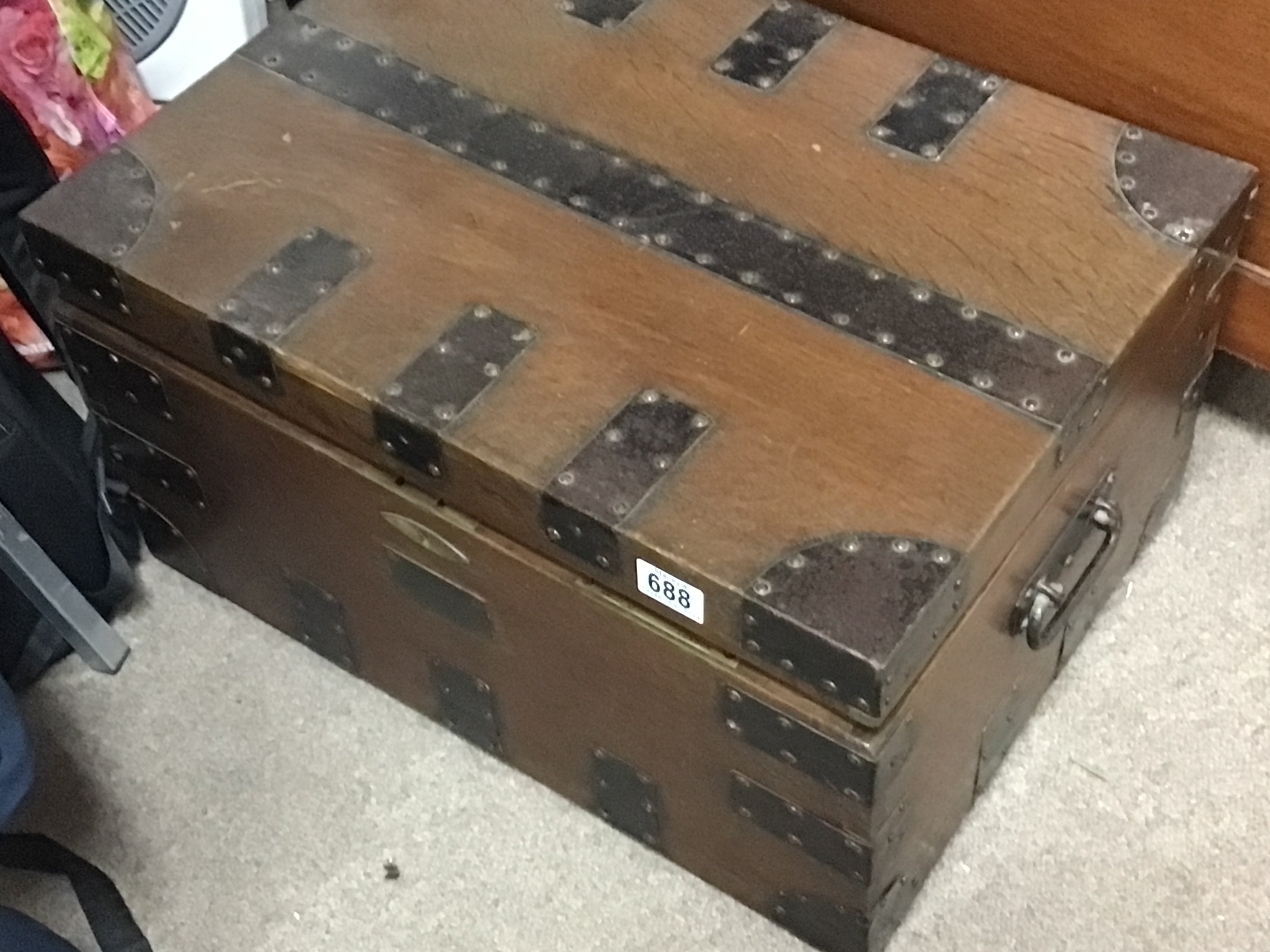 An oak and metal bound strong box with a fitted interior containing silver plated cutlery a pair of chamber sticks with a George III silver candle snuffer and a Victorian tea set.