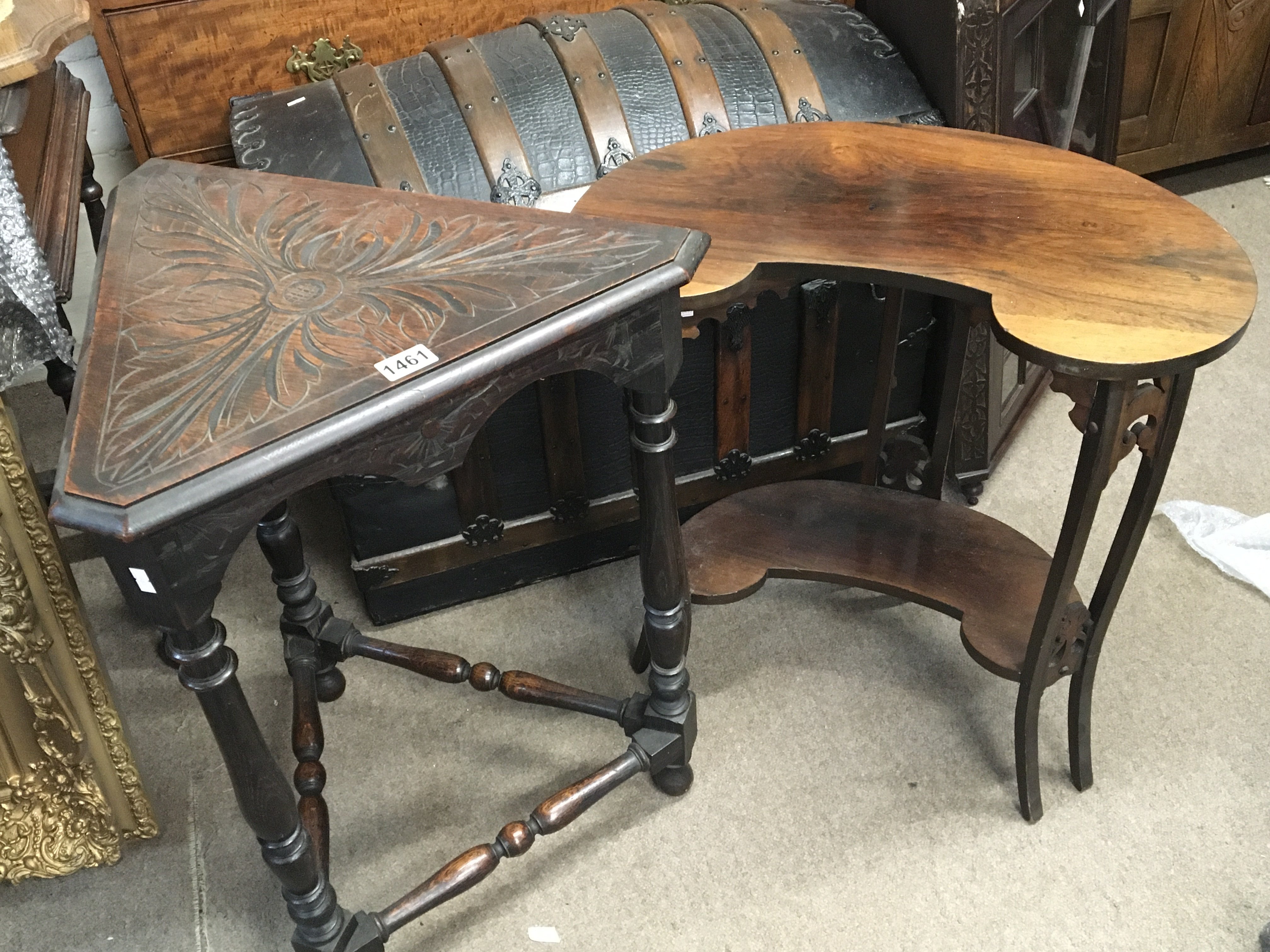 An Edwardian rosewood occasional table with a shaped top on splayed legs United by an under-tier and a carved oak occasional table (2)