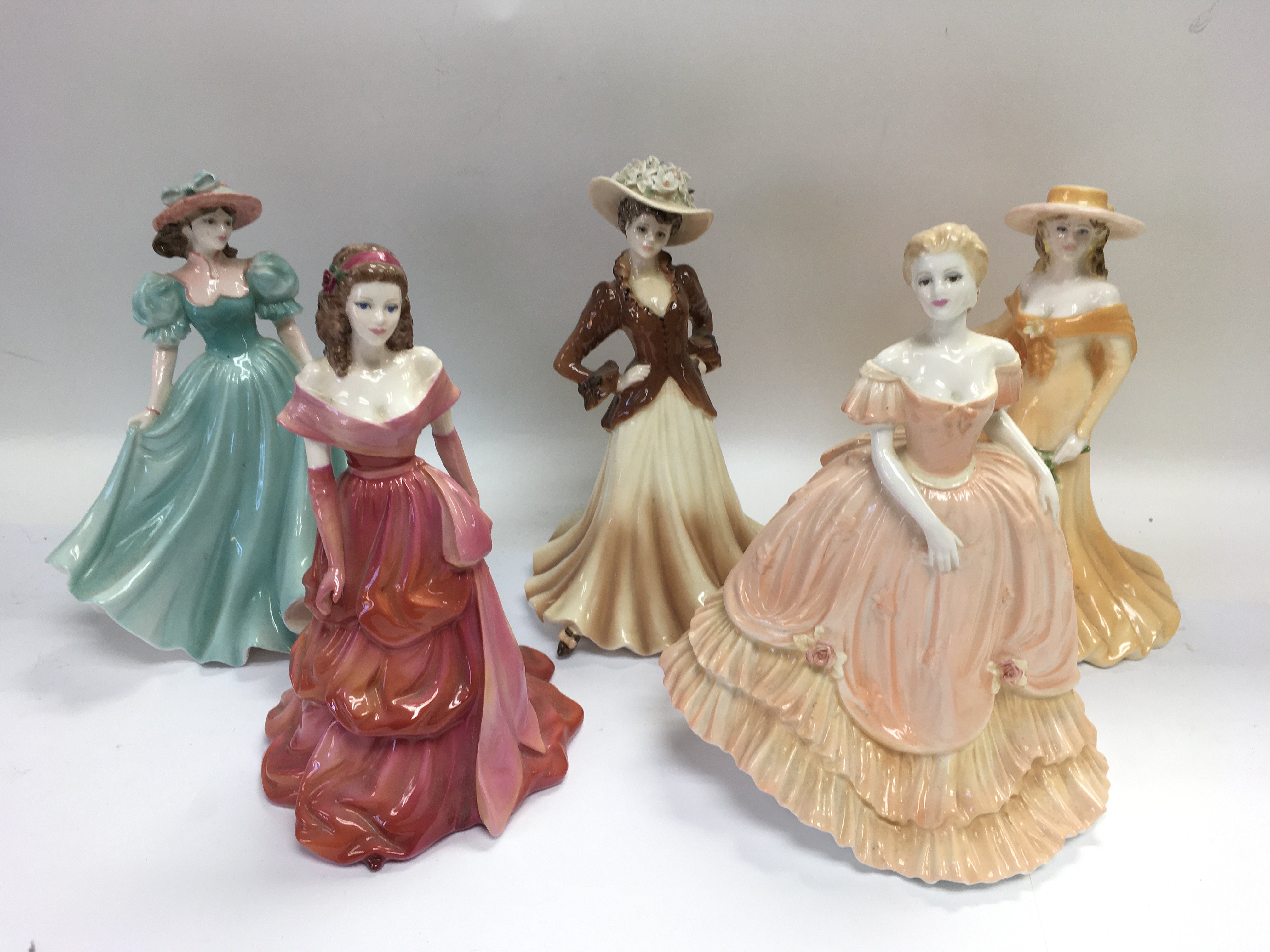 Five Coalport figures of ladies including four with boxes. Shipping category D.