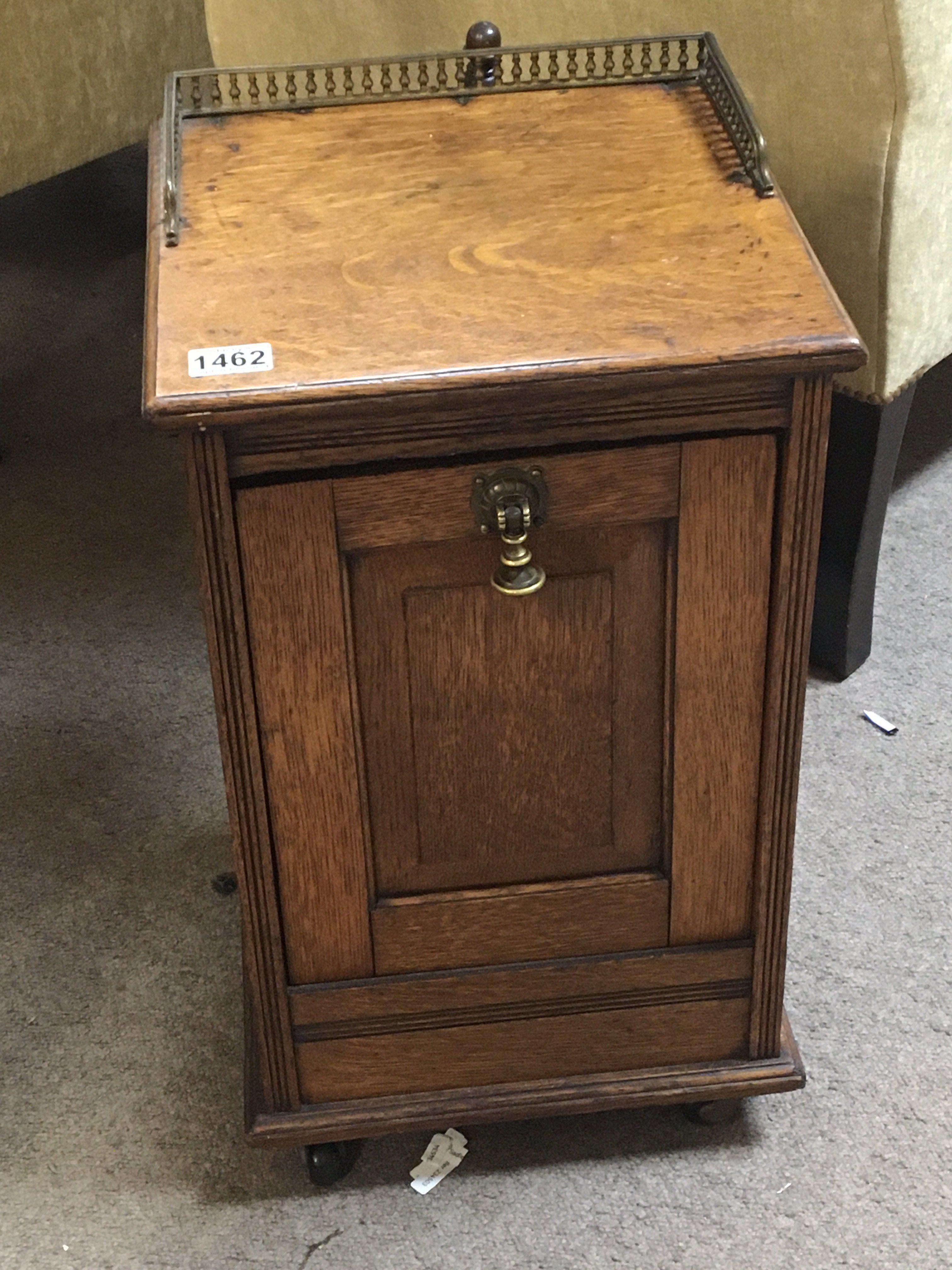 A carved oak coal box with a hinged front brass gallery and shovel.
