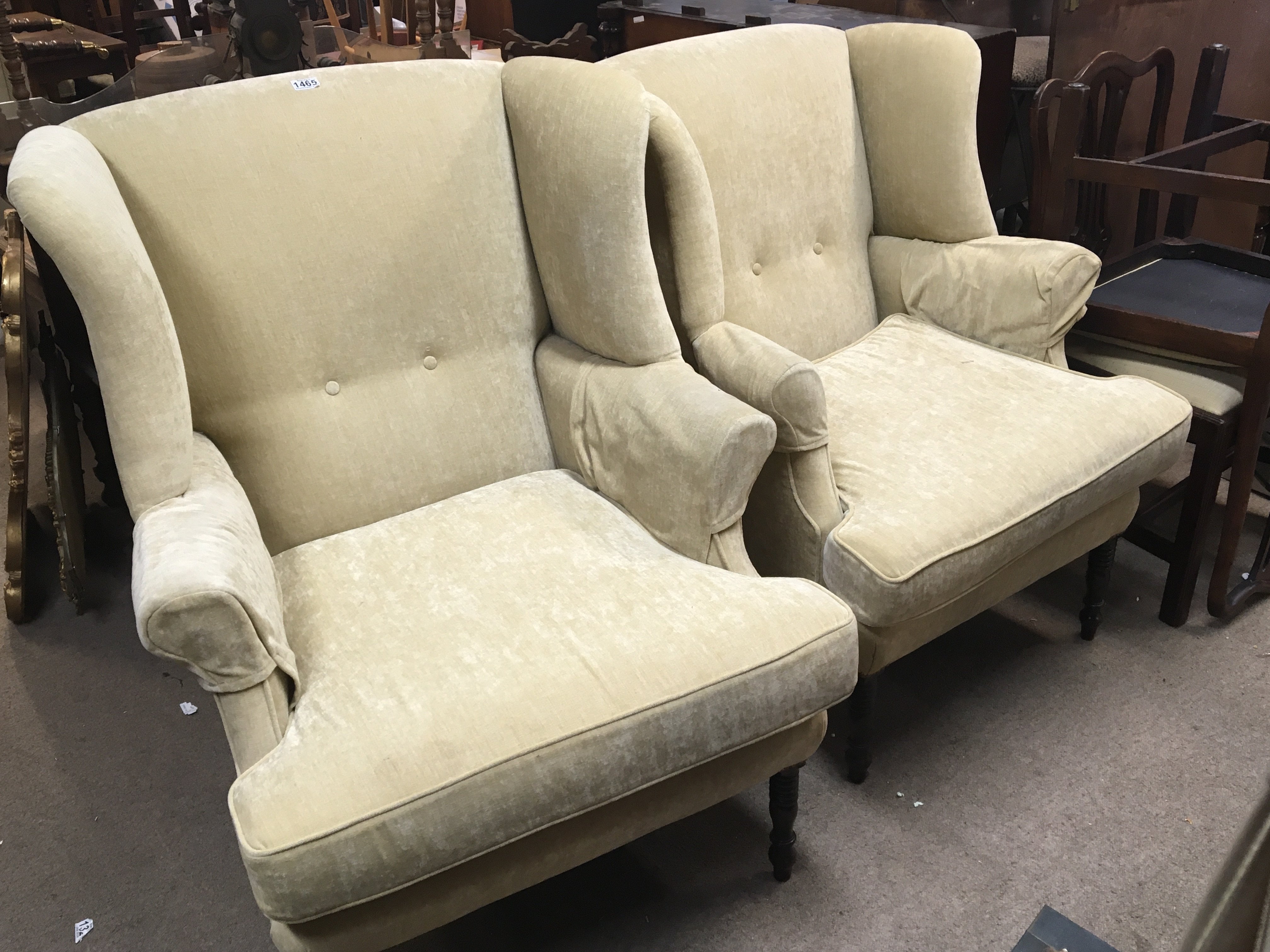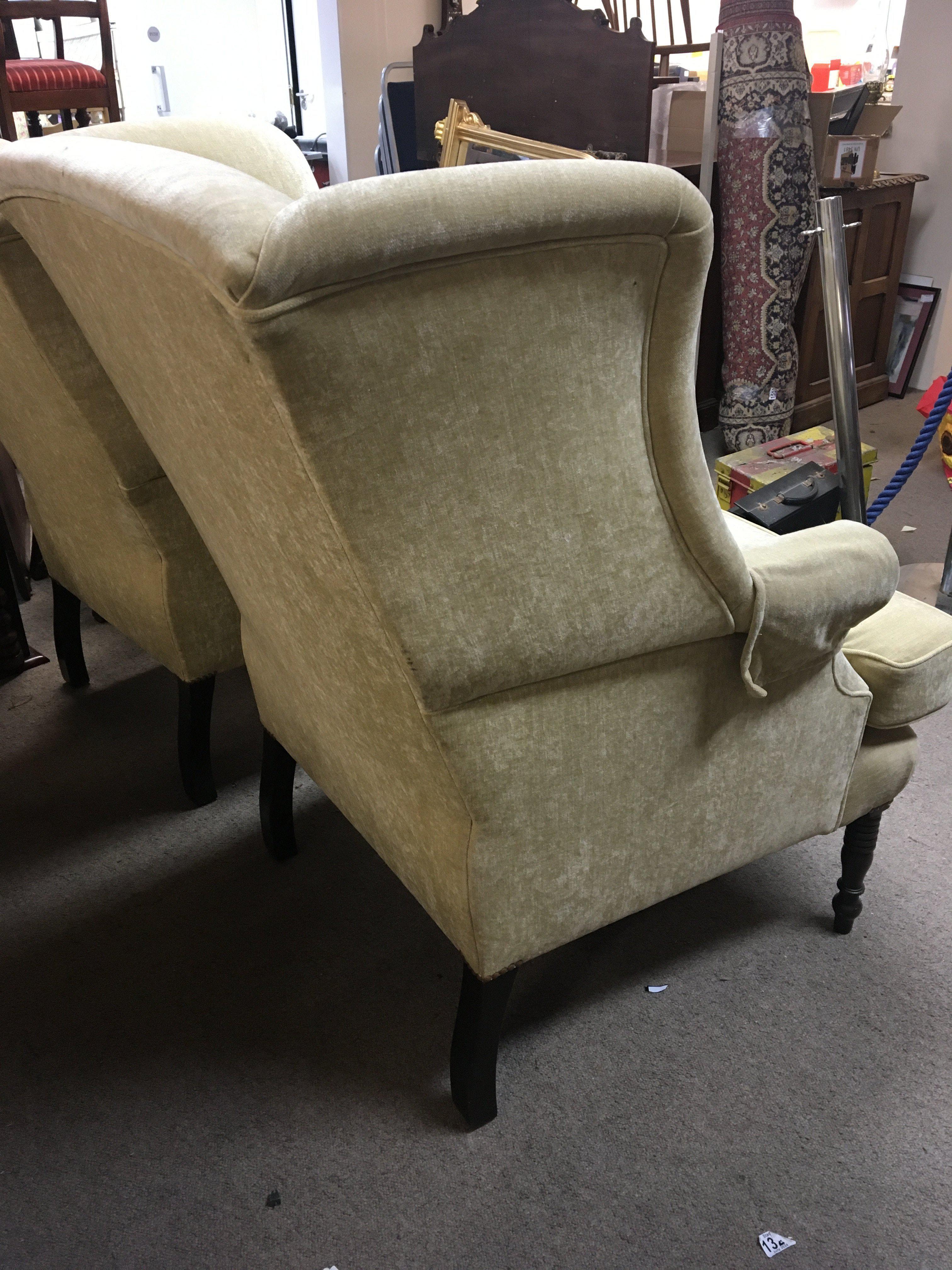A pair of Early 19th century wing arm chairs with turned legs later upholsterd in a lemon Dryalon (2)