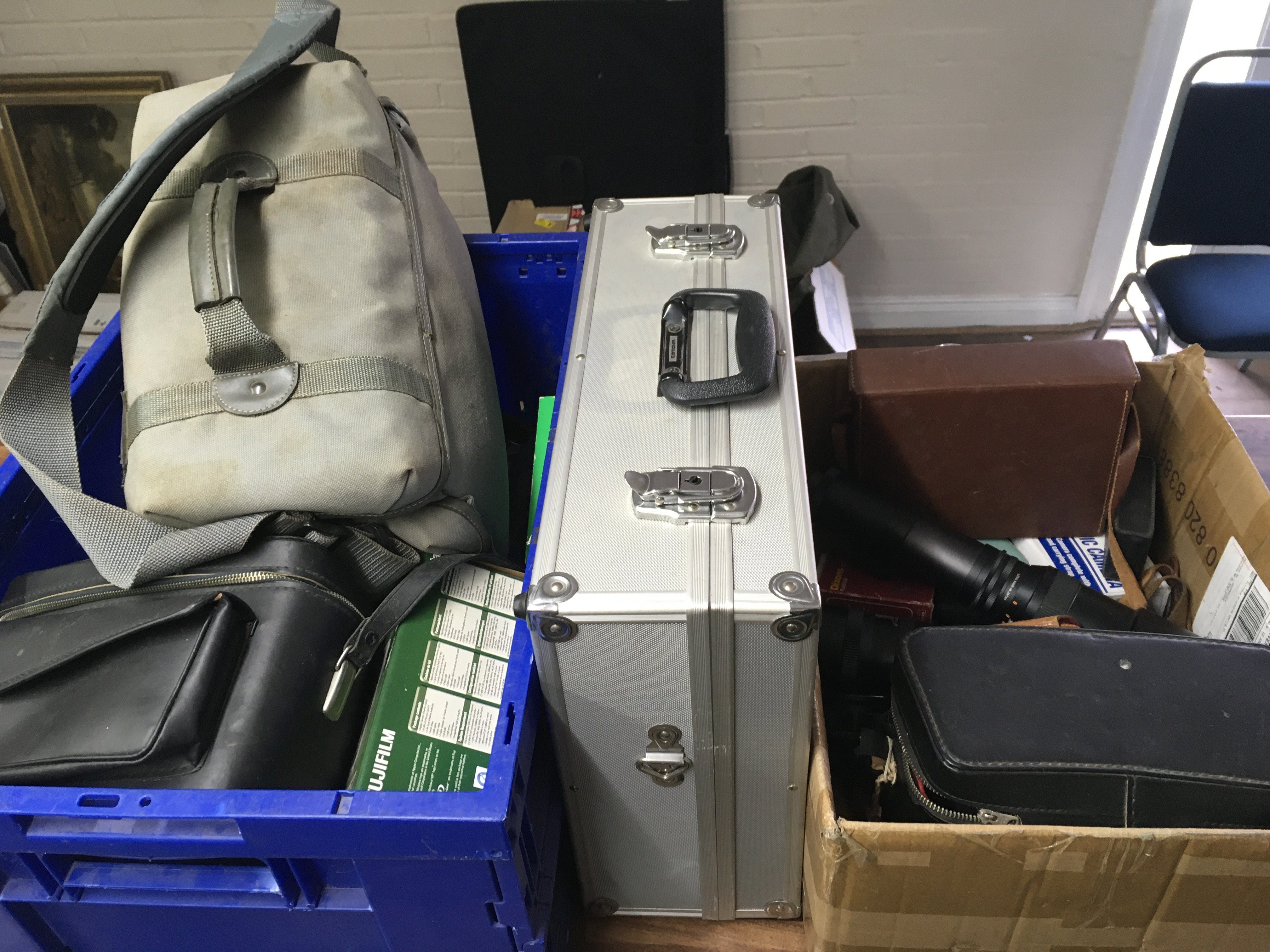 A collection of camera equipment including a Photax 400mm lens, Meopta Admira 8f, 16x50 field 3.5 binoculars etc