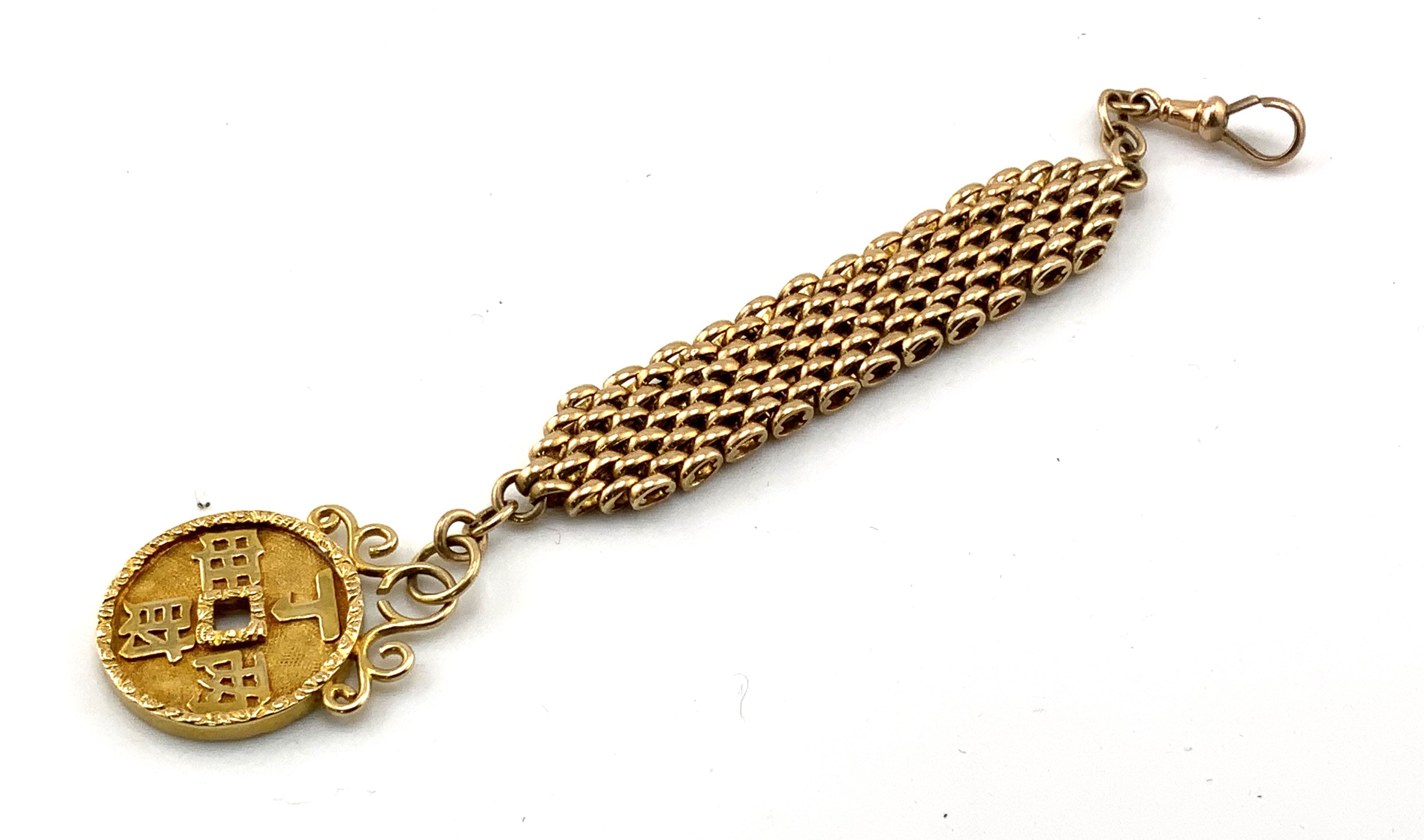 A 15ct gold fob chain with attached Chinese Cash pendant. Total weight 16.95g.