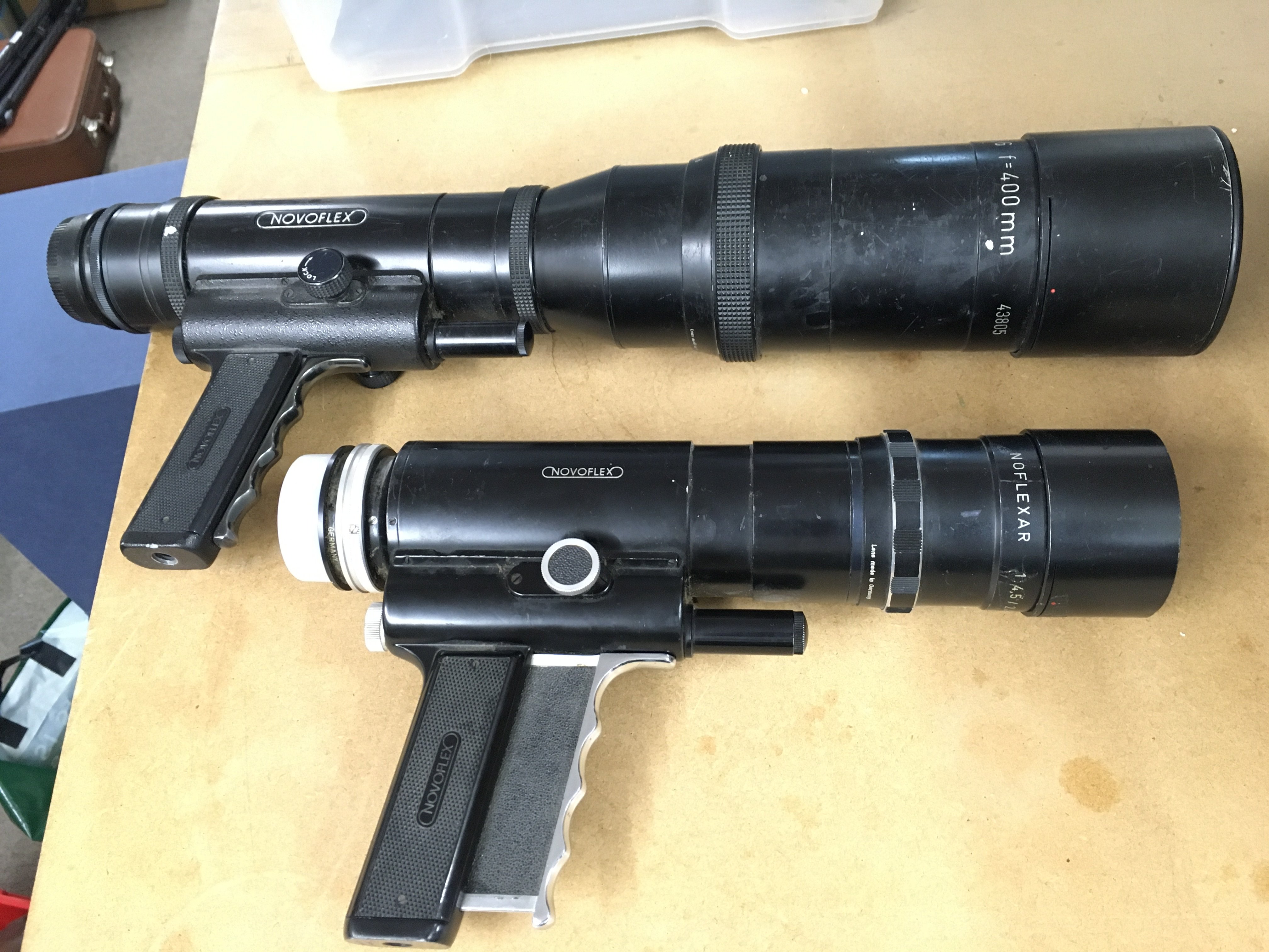 A Novoflex T-Noflexar f:5,6 400mm lens with pistol grip and a Novoflexar f:4,5/240 lens with grip. Postage category C
