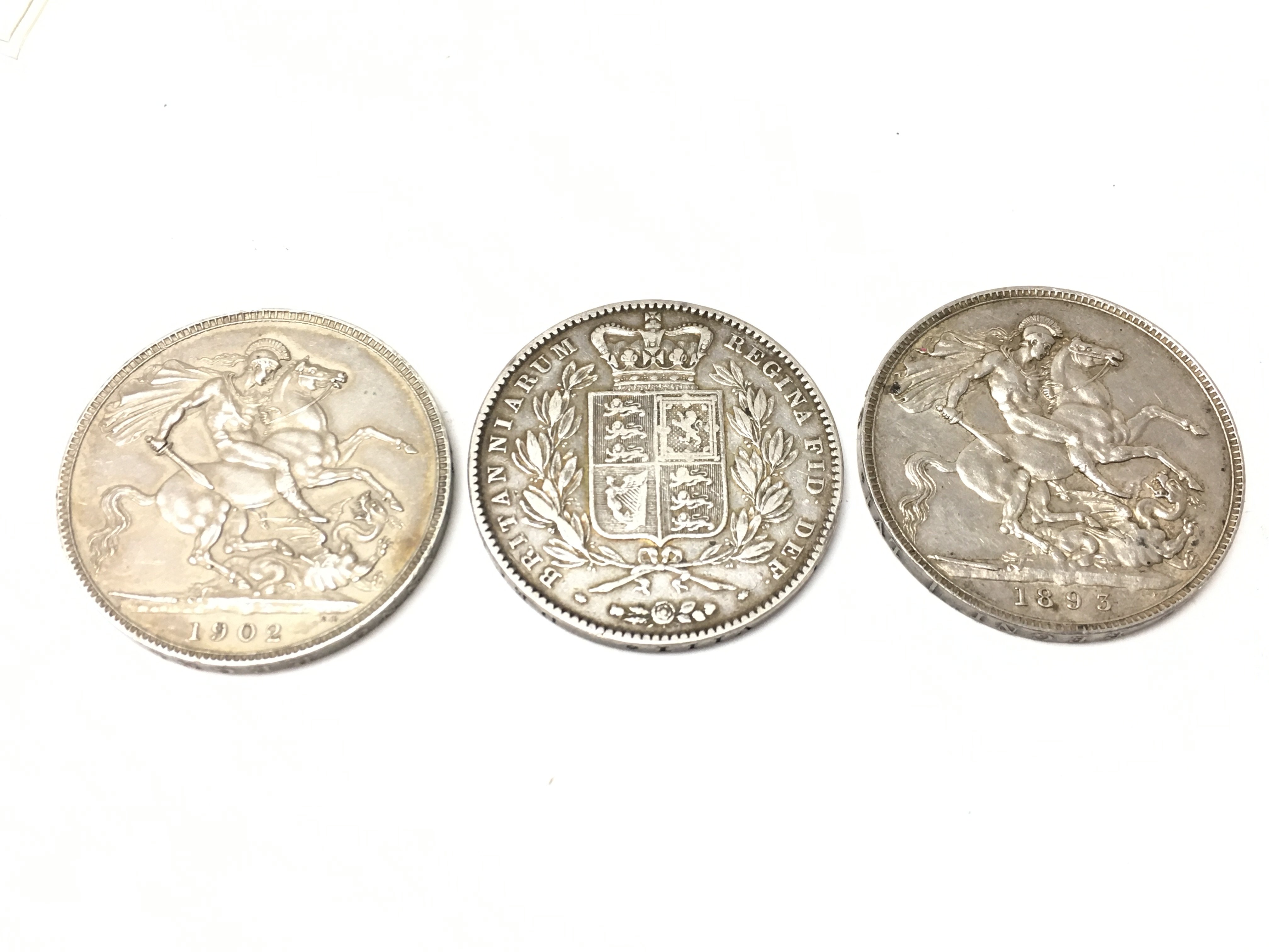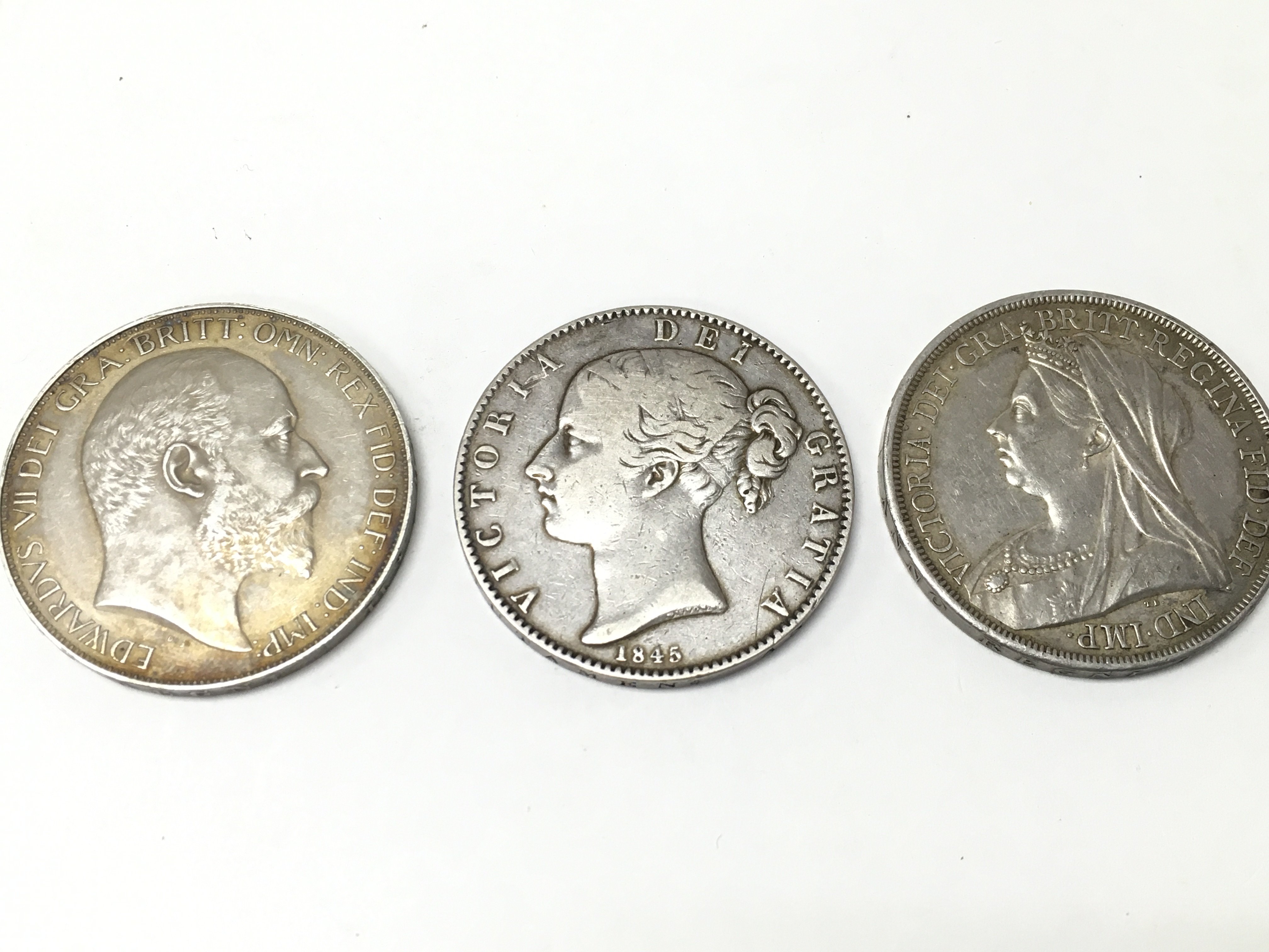 Three silver crowns, 1845 Young Head Victoria, 1893 and 1902. Postage category a