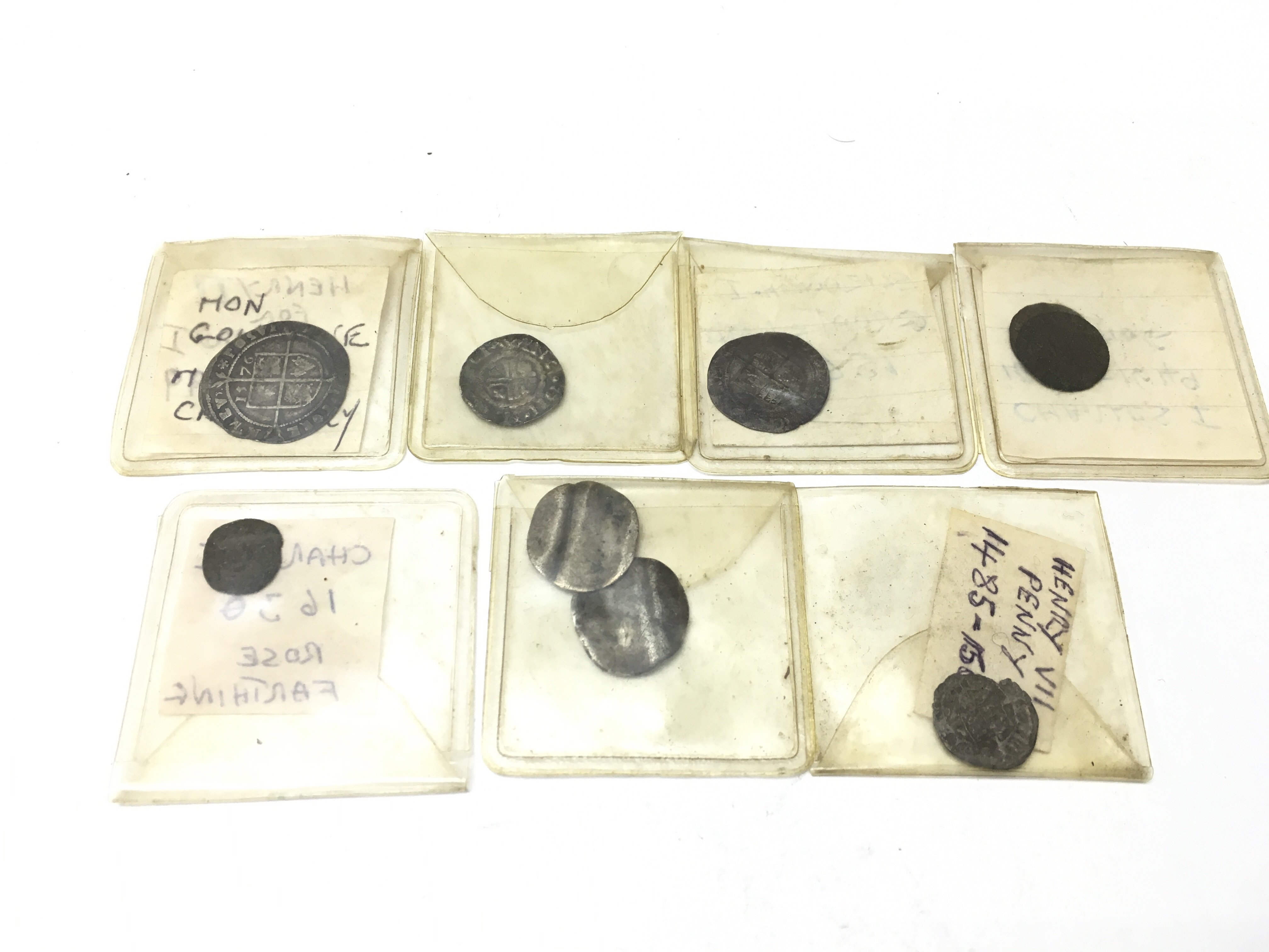 A collection of hammered coins, Elizabeth I 1576, Charles I farthings, Henry Vii penny. Postage category a