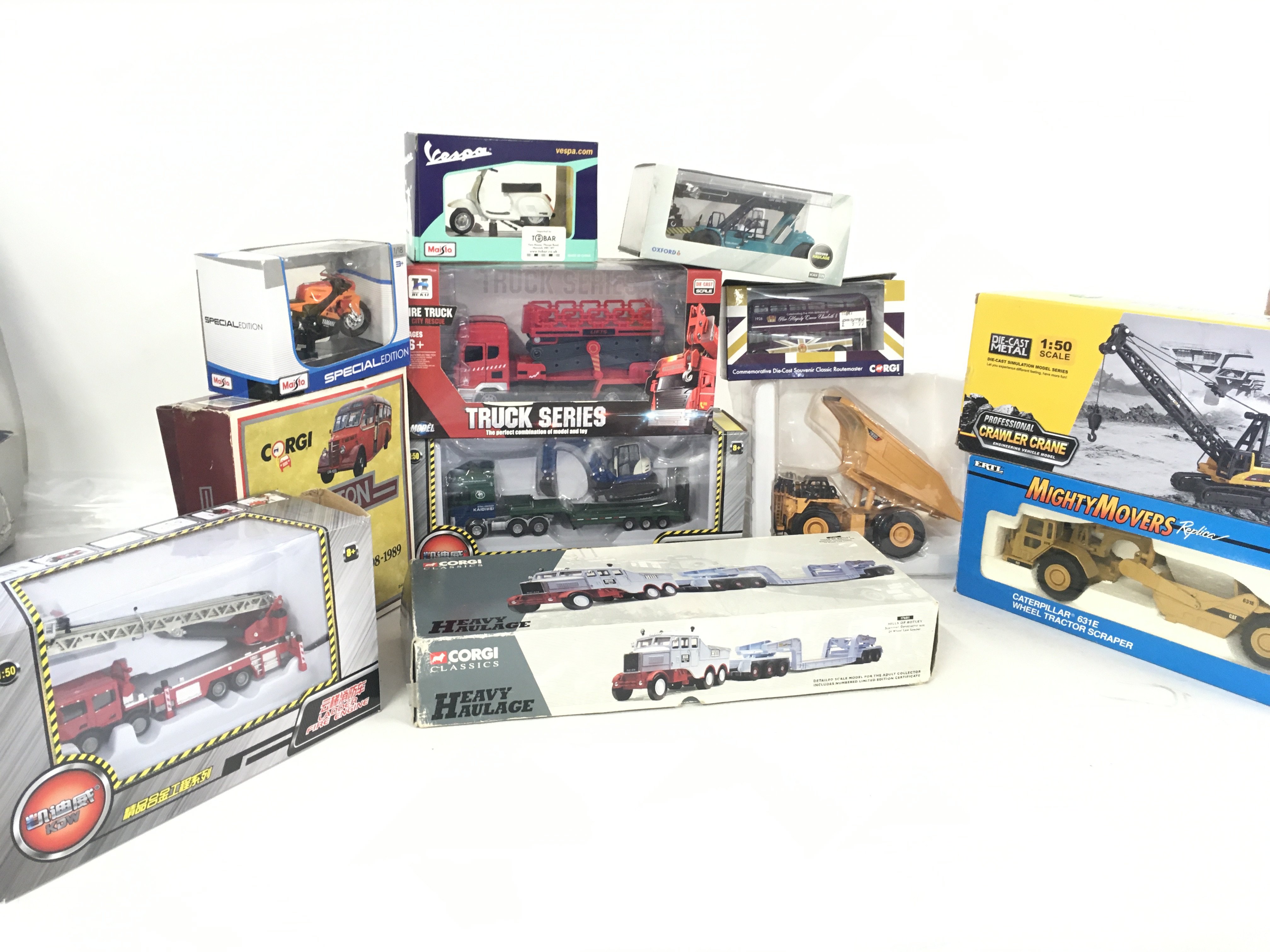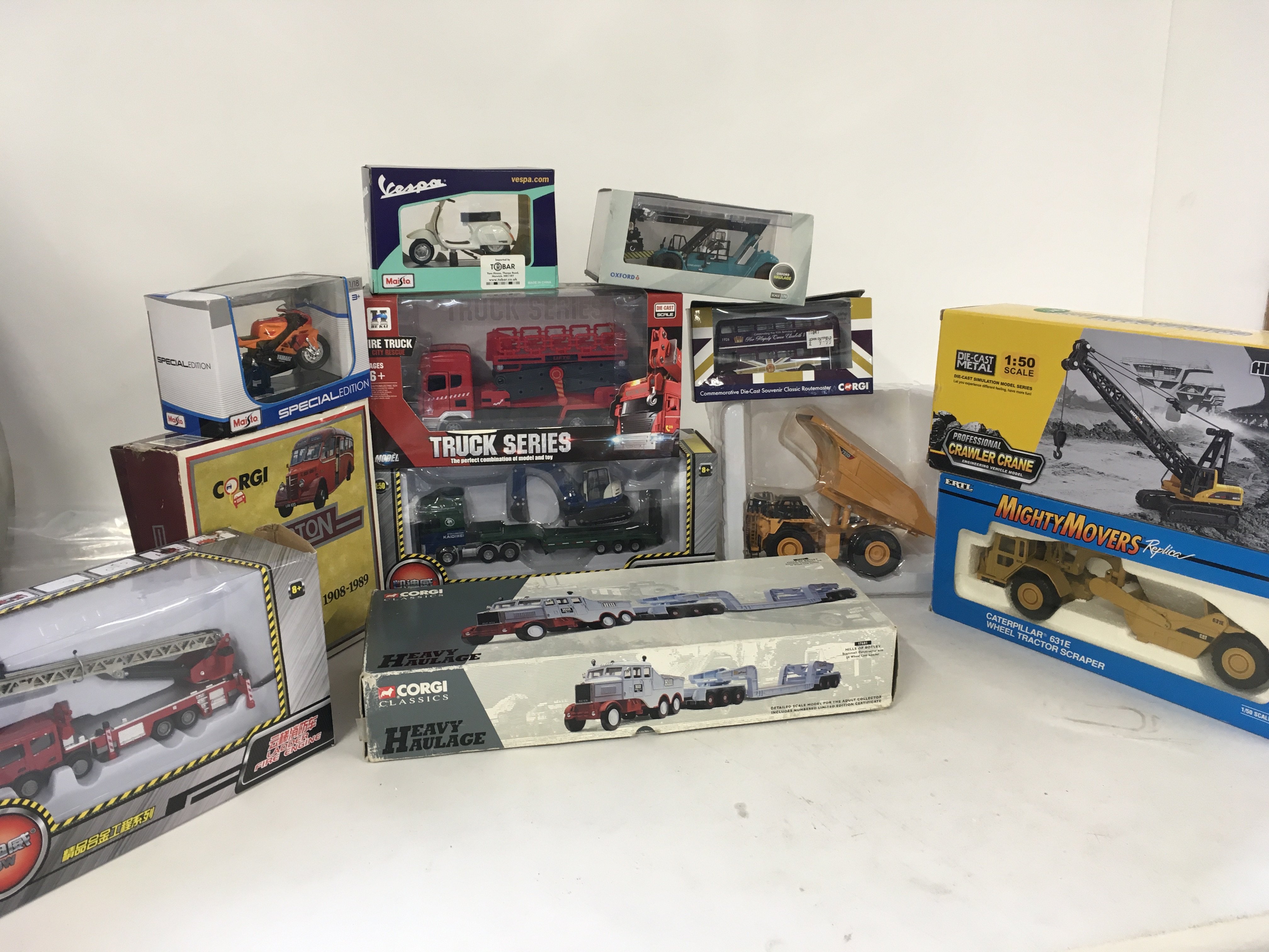 A collection of boxed diecast vehicles by various manufacturers including Corgi..Maidstone..KDW..He-Kai..Hulna etc. comprising construction vehicles..buses and motorcycles.