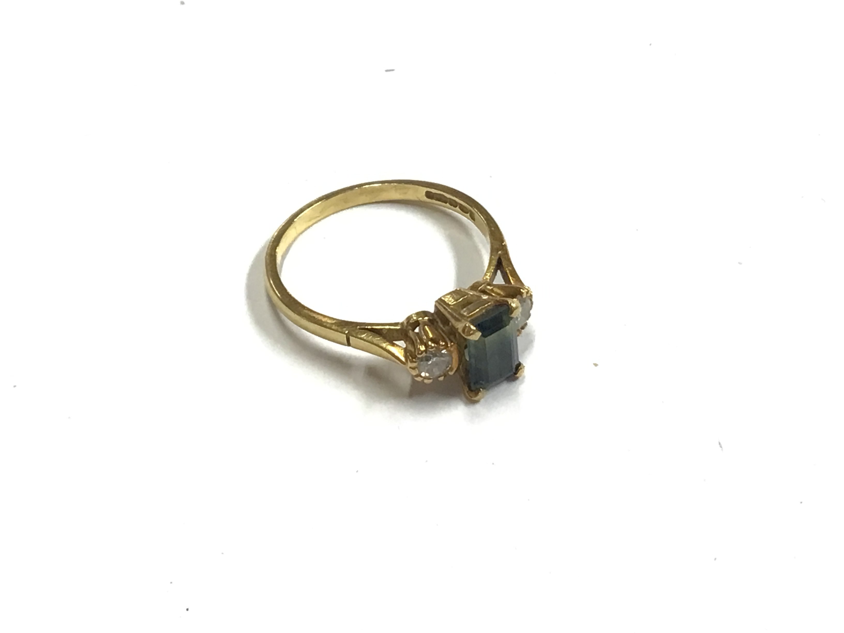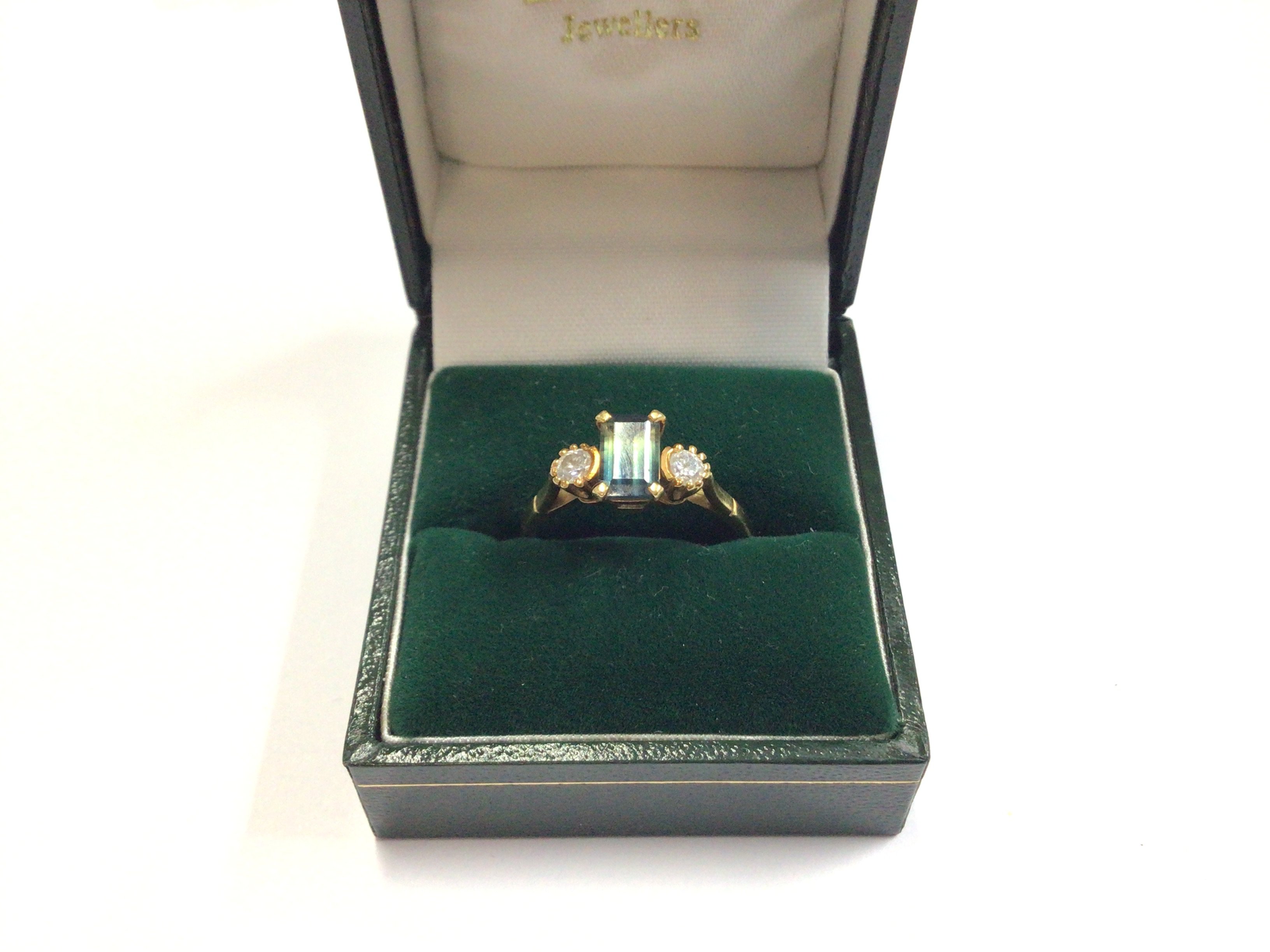An 18ct gold unusual tourmaline ring with flanking diamonds. Approx size R, approx weight 3.86 grams.