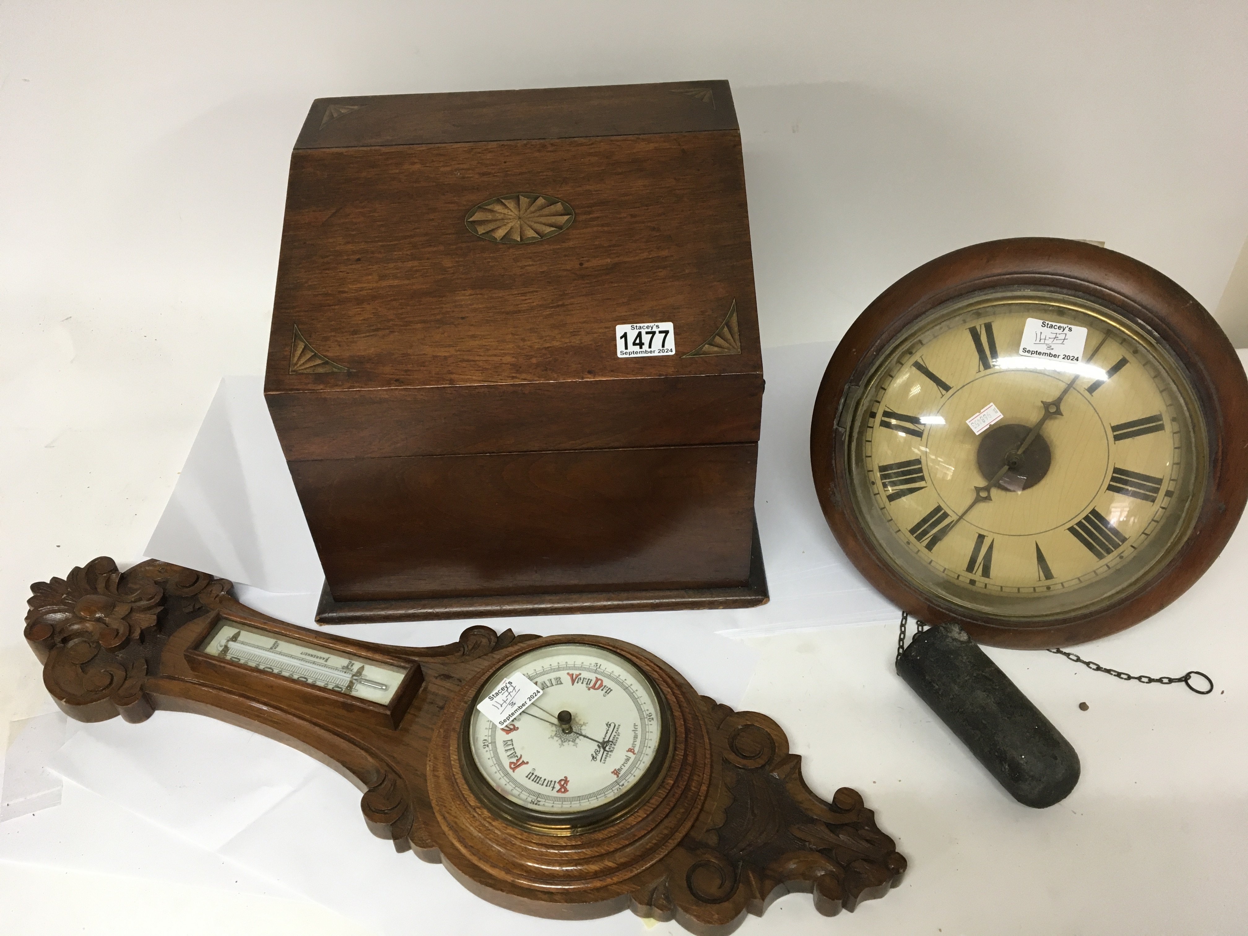 A late Victorian postman alarm clock an Edwardian walnut box and a walnut barometer (3)