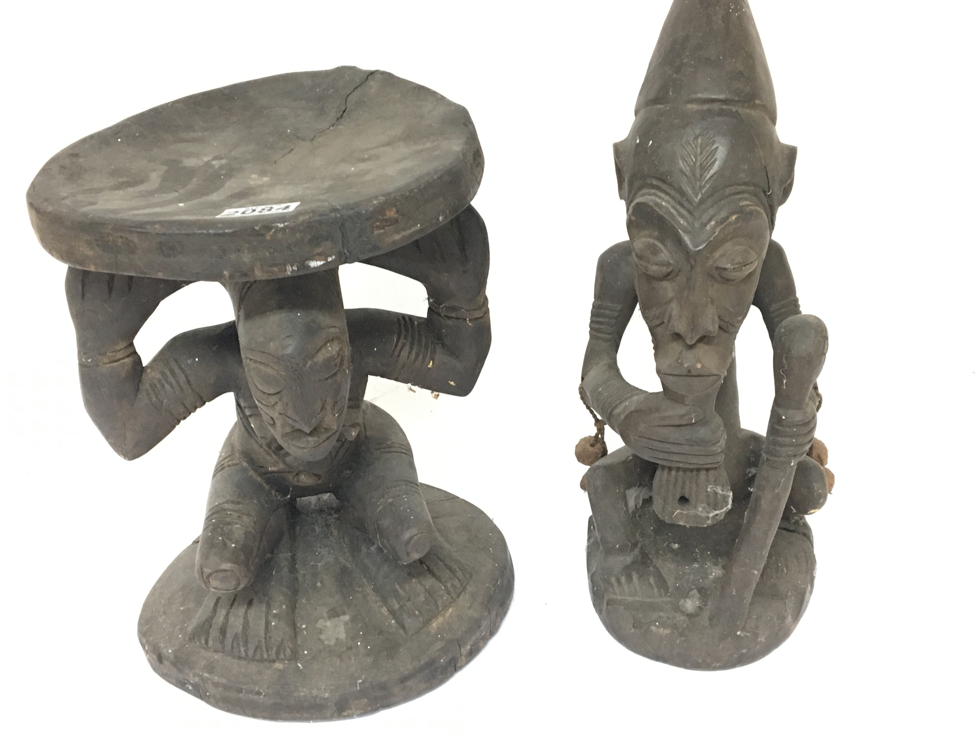 A carved hardwood African seat the circular top supported by a figure and one other African tribal carving (2)