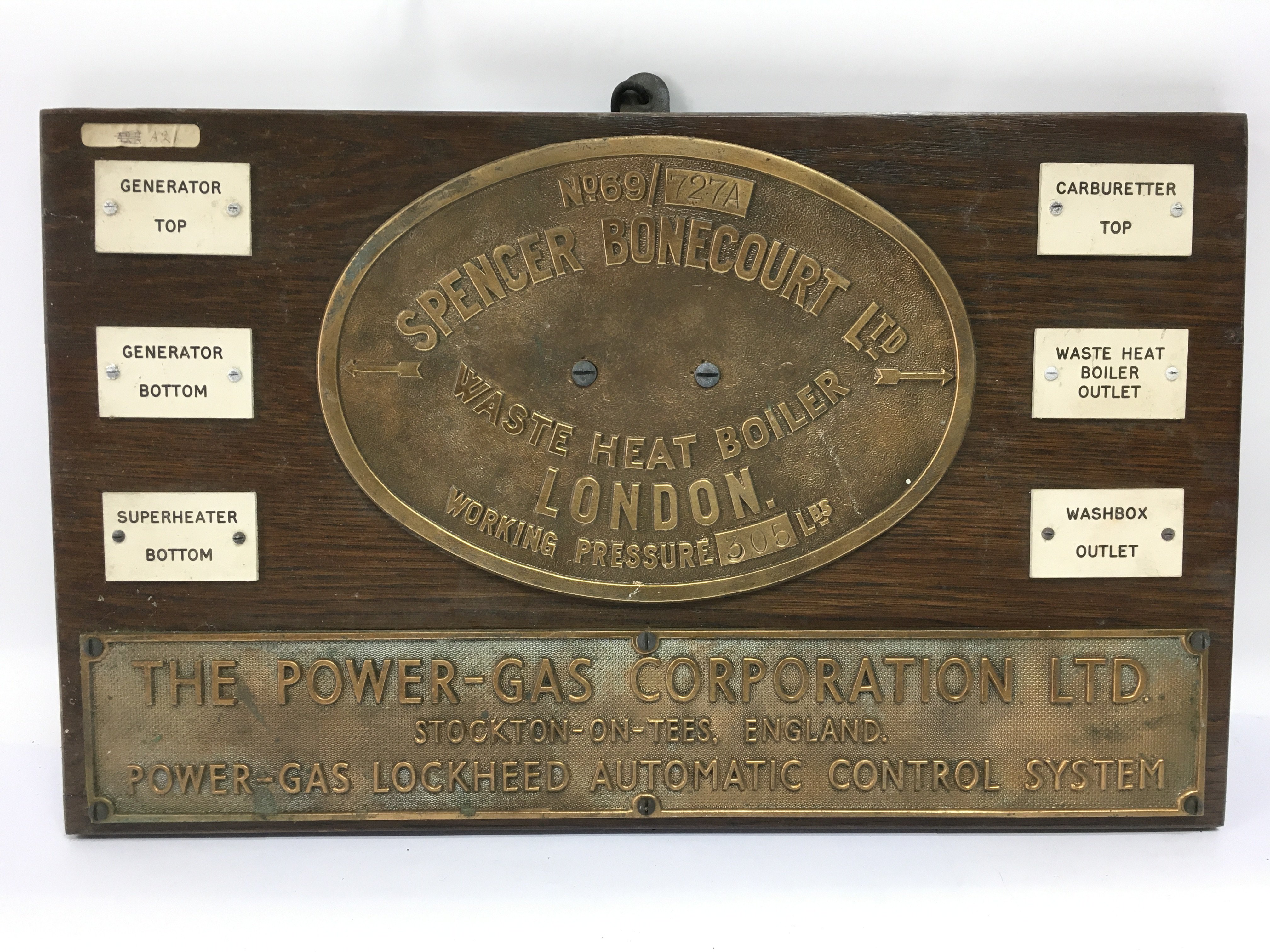 Two brass company plaques mounted on wood for Spencer Bonecourt Ltd and The Power Gas Corporation Ltd, approx 51cm x 31cm. Shipping category D.