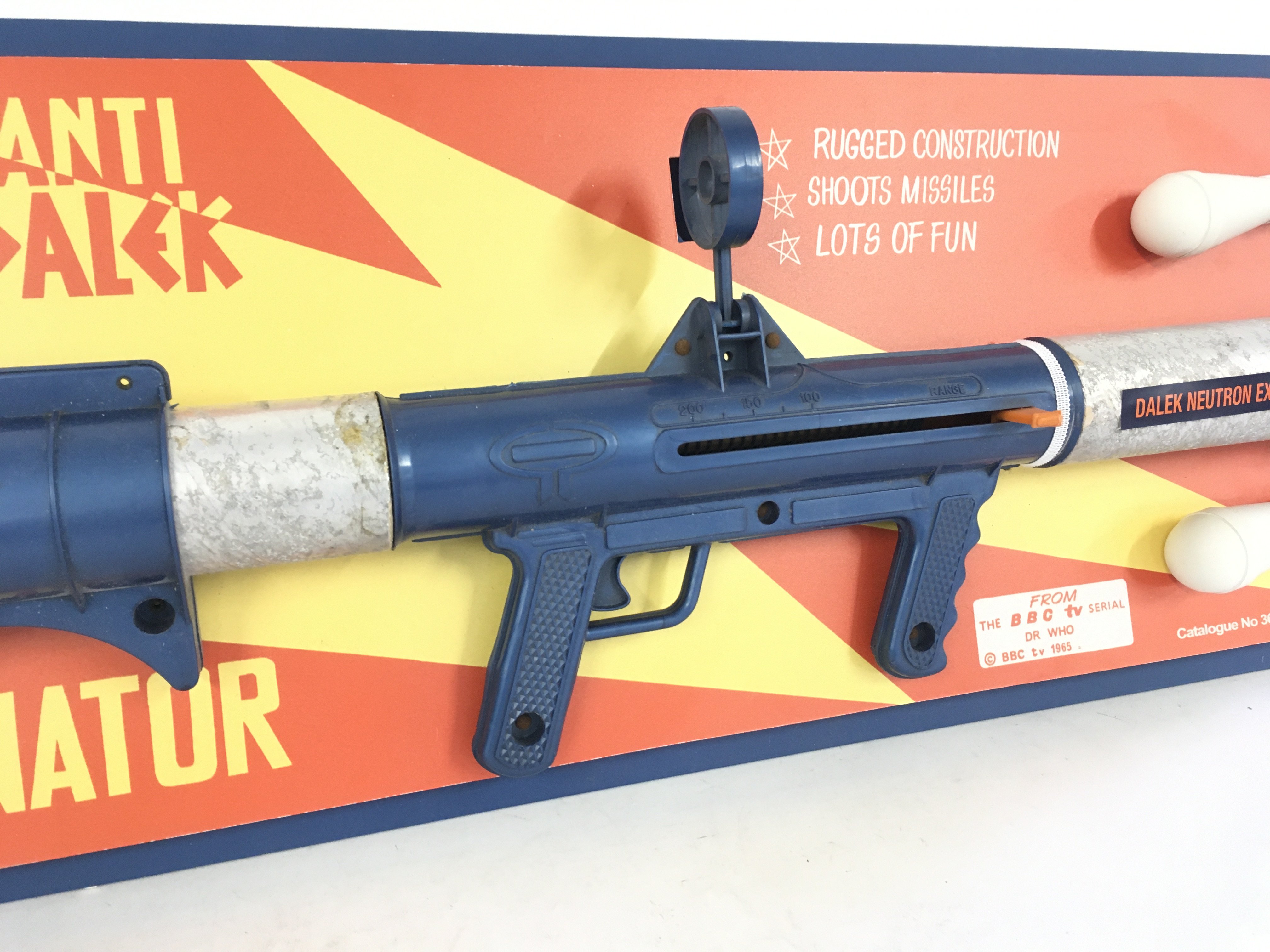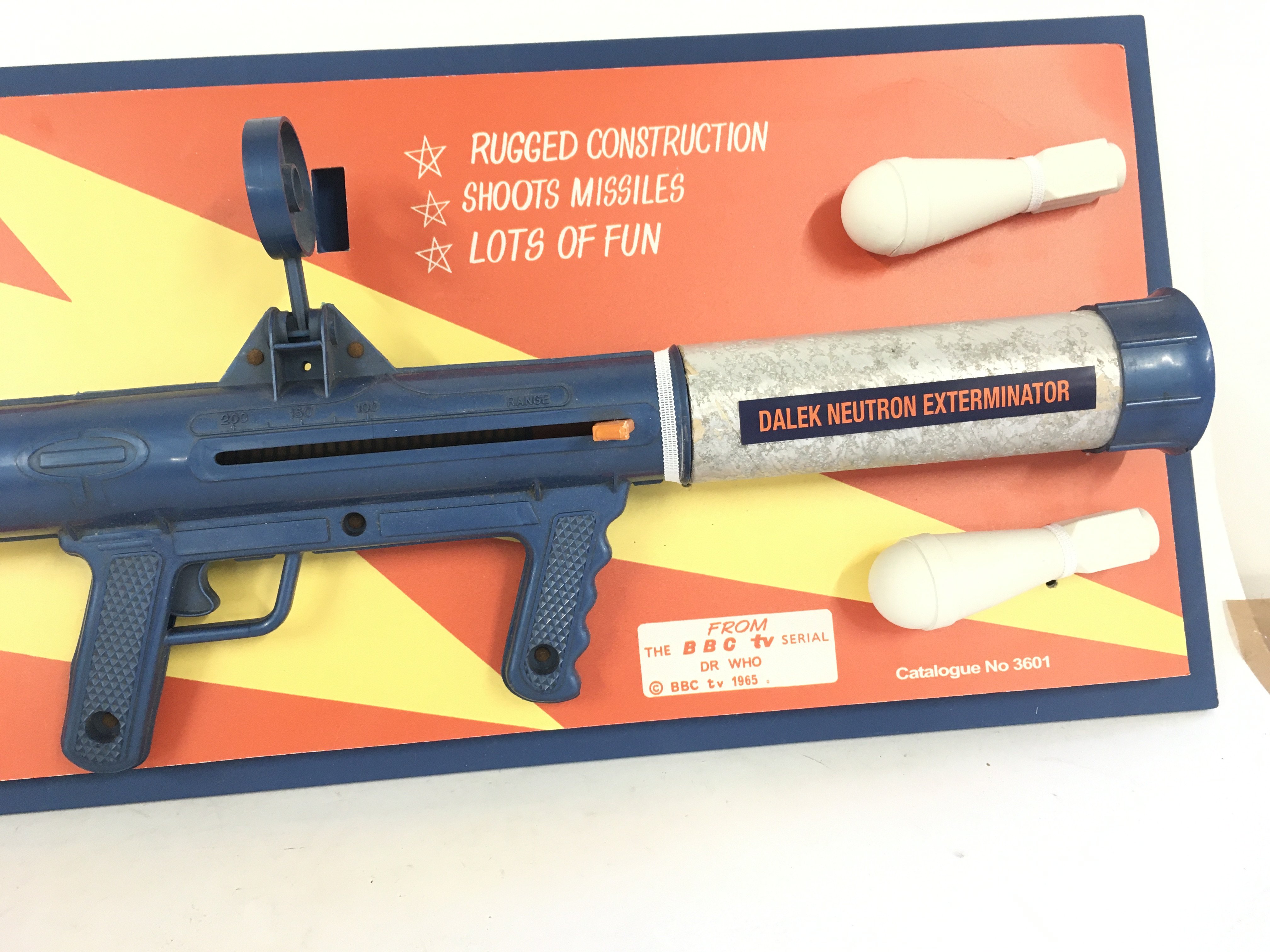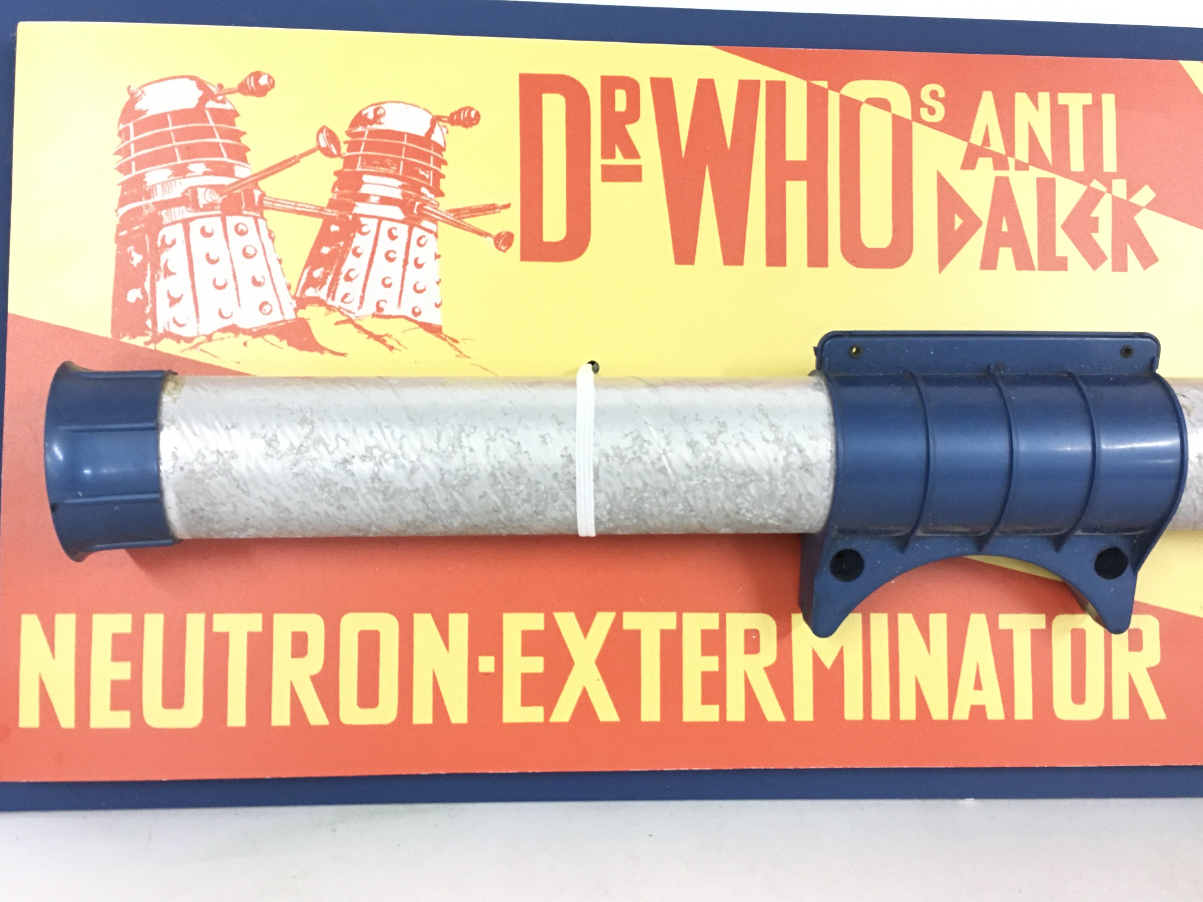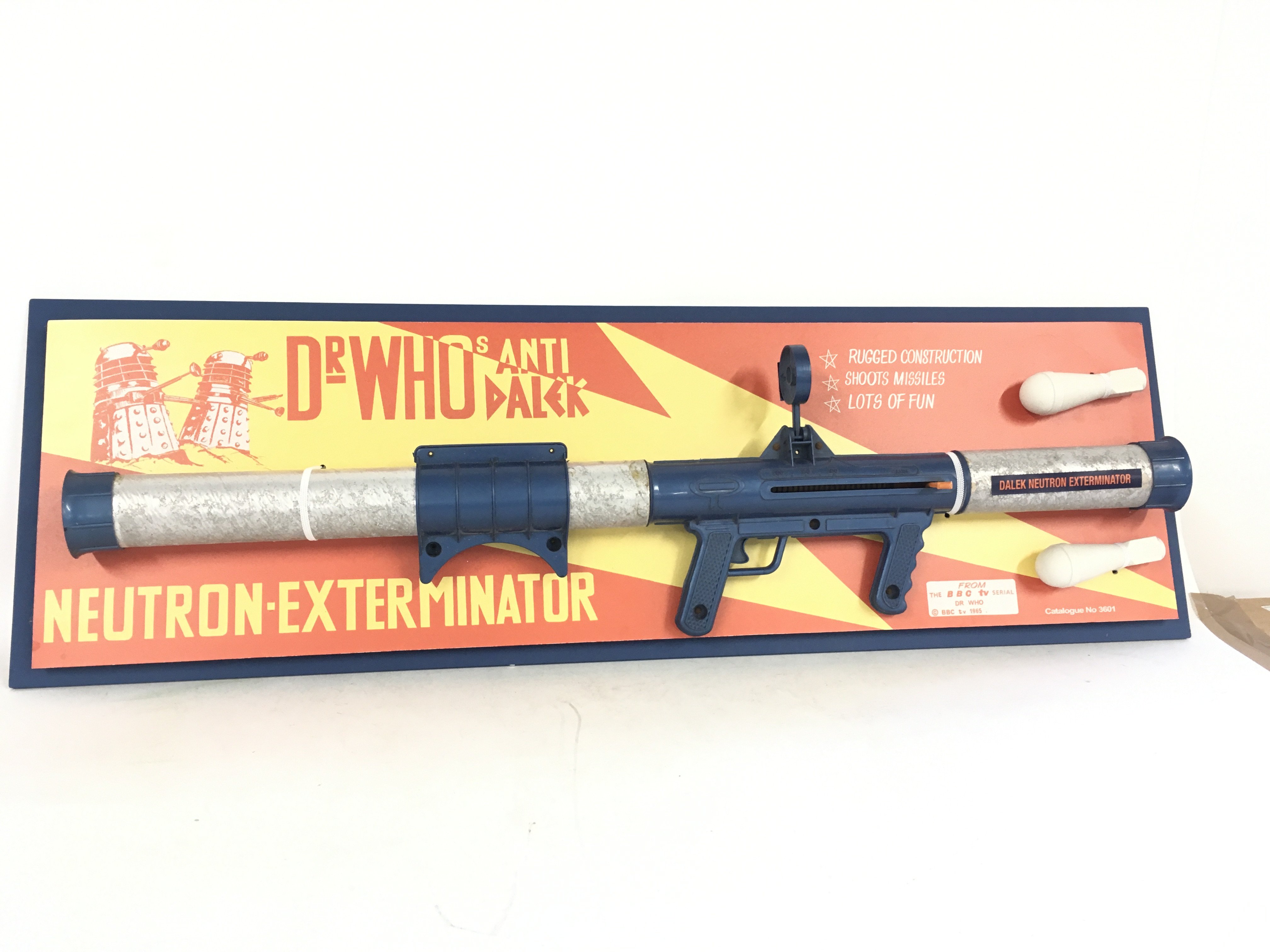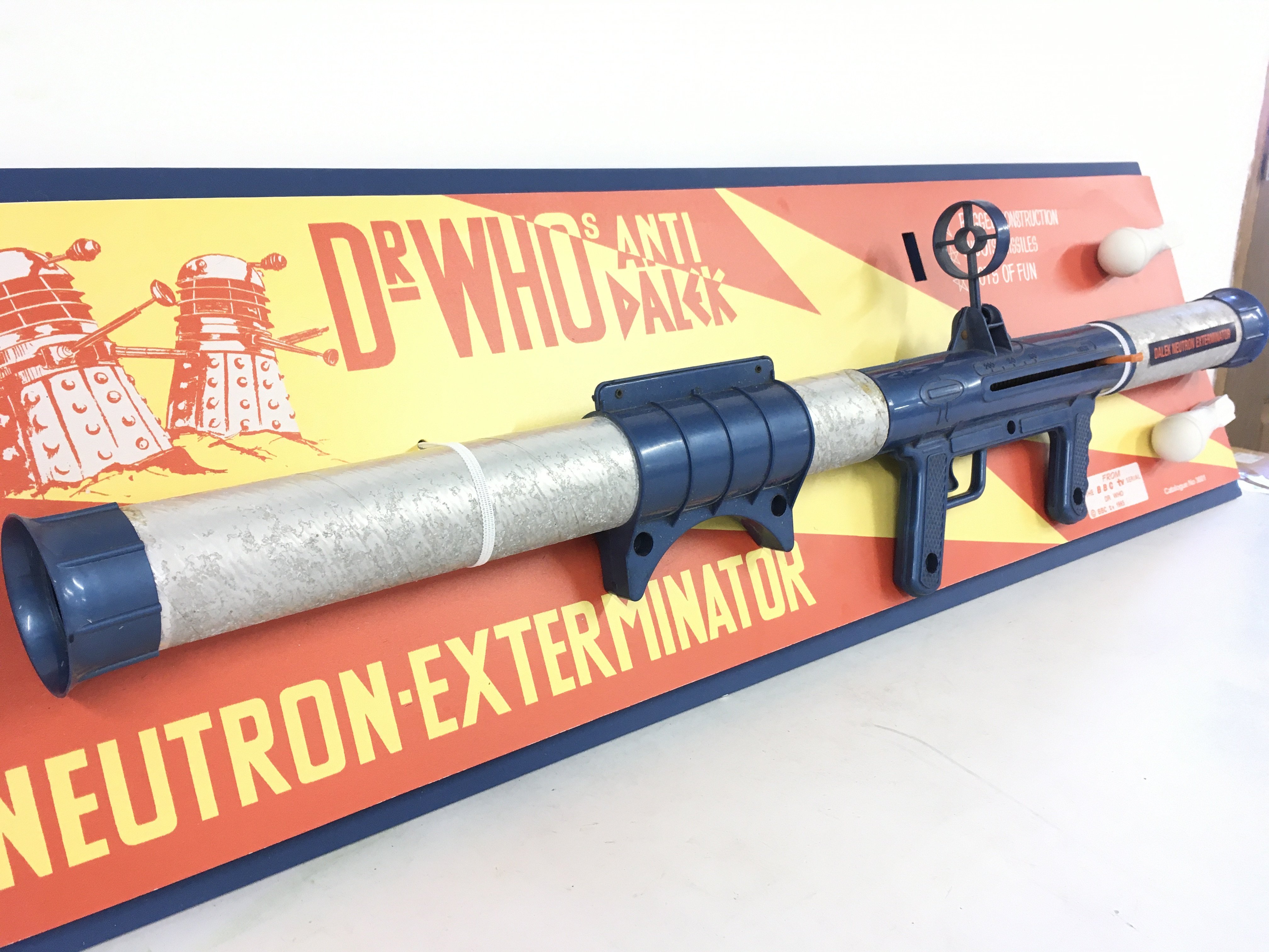 A very rare Dr Who Anti-Dalek Neuron Exterminator. This is an original weapon mounted on a reproduction board with reproduction shells.