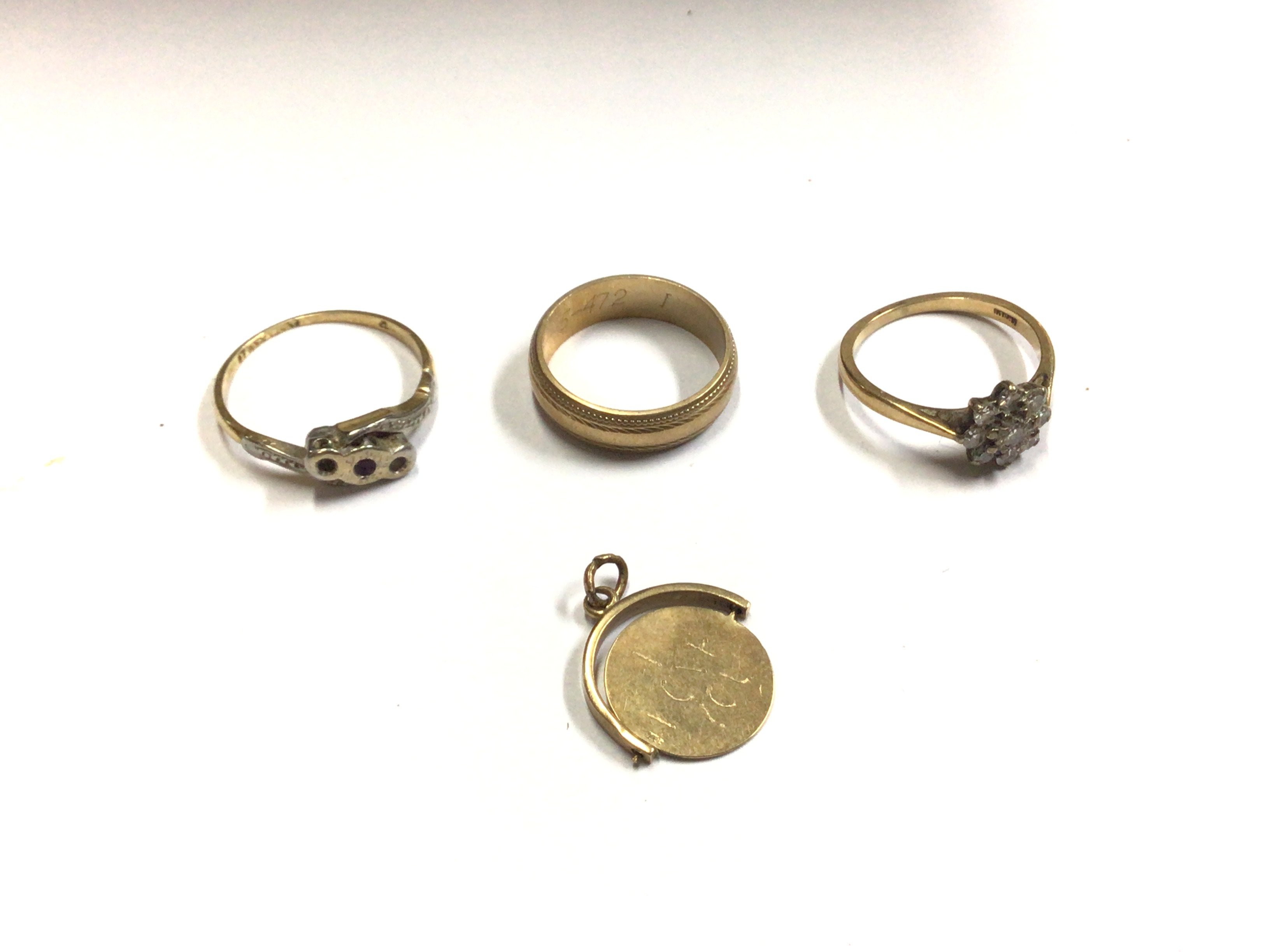 Three 9ct gold rings and one 9ct gold charm. Approx weight 7.47 grams.