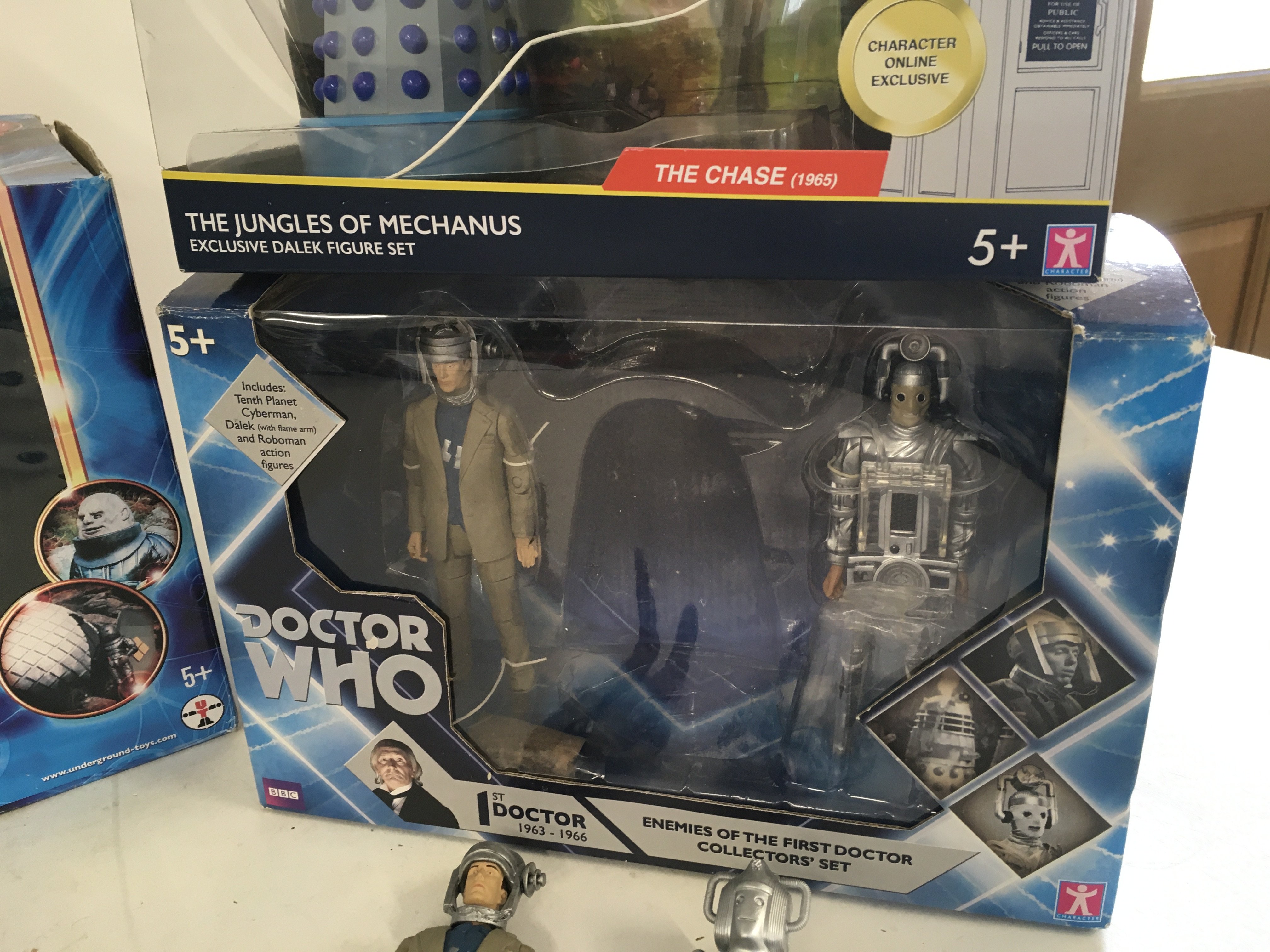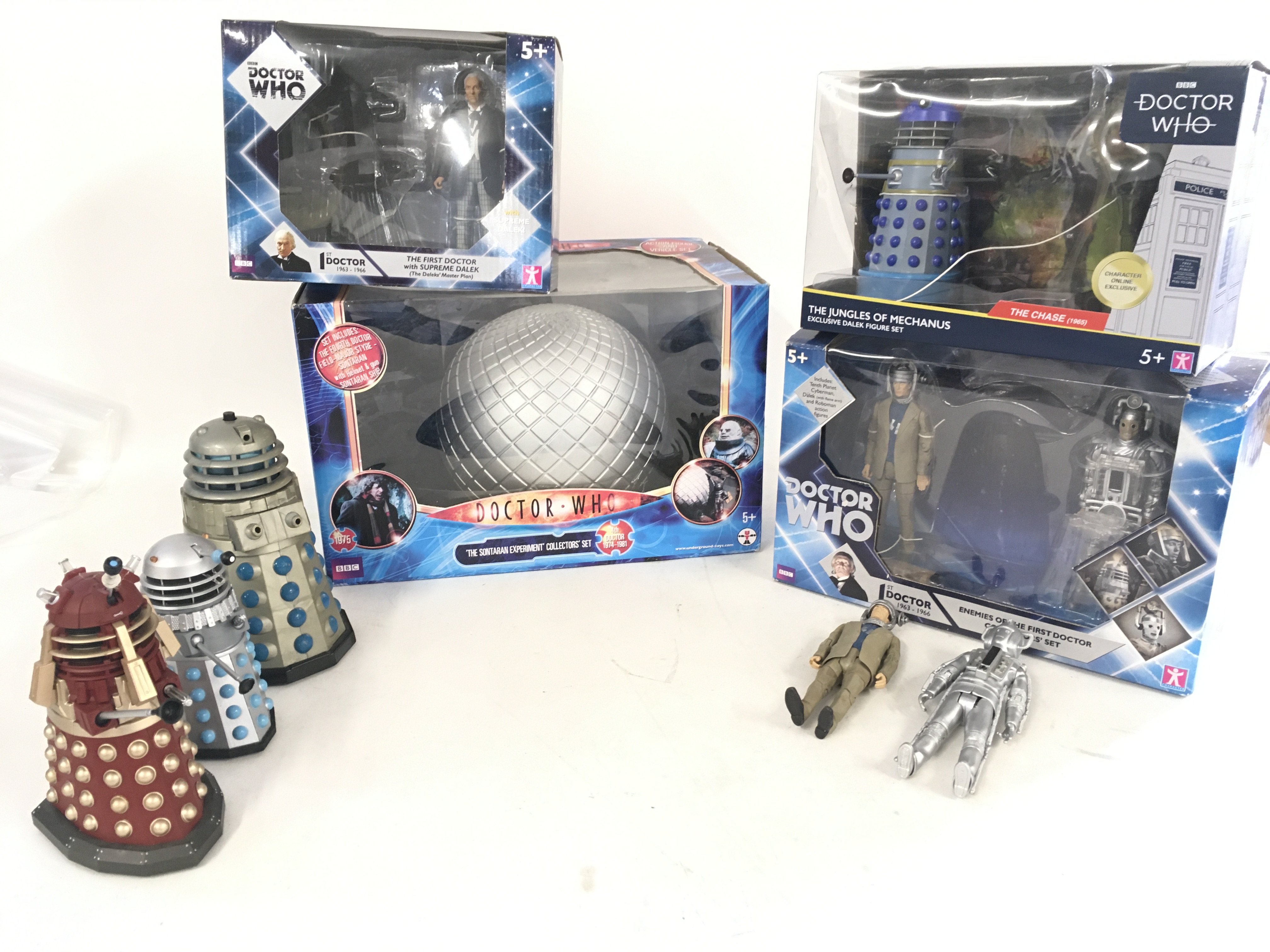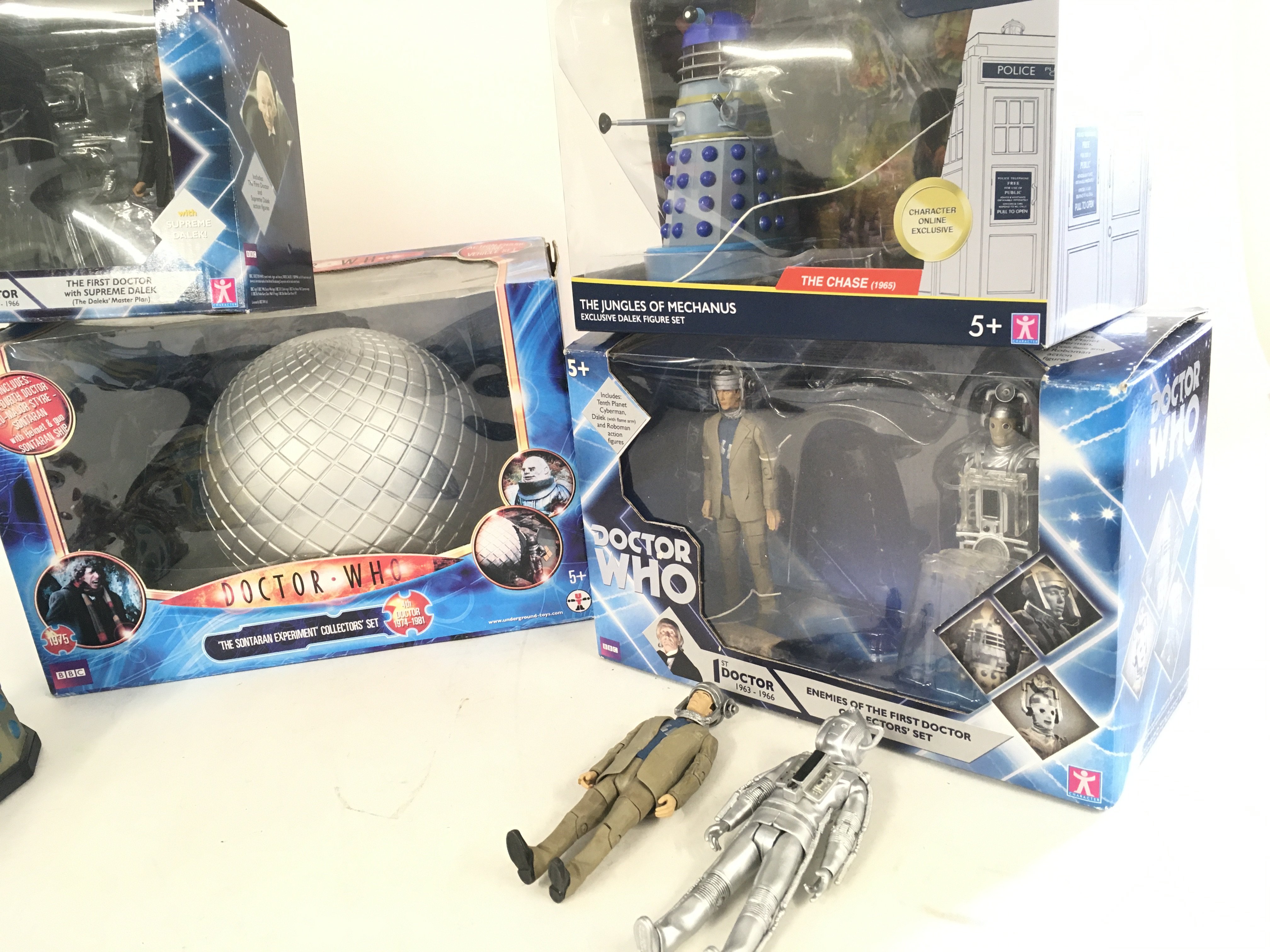 A collection of Dr Who action figures and incomplete boxed toys. Includes The Sontaran Experiment..The First Doctor..The Jungles of Mechanus etc.