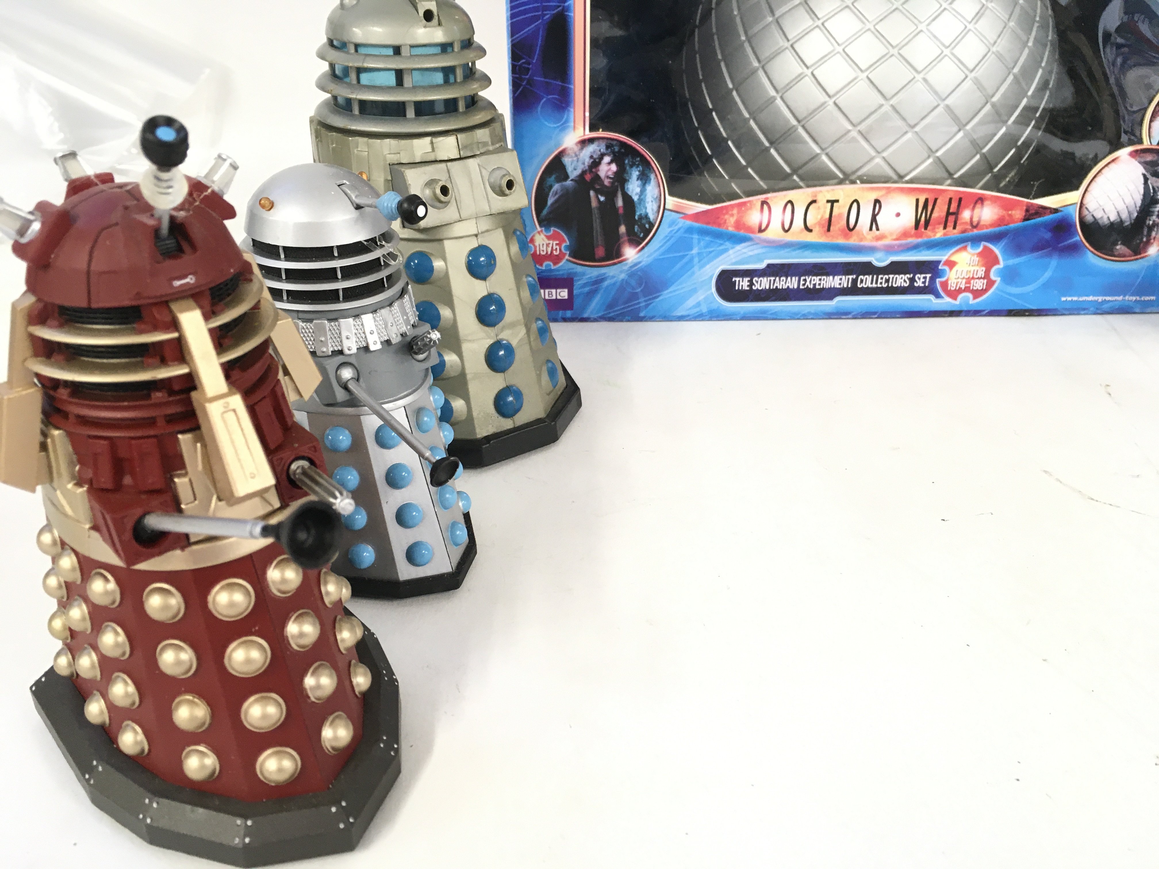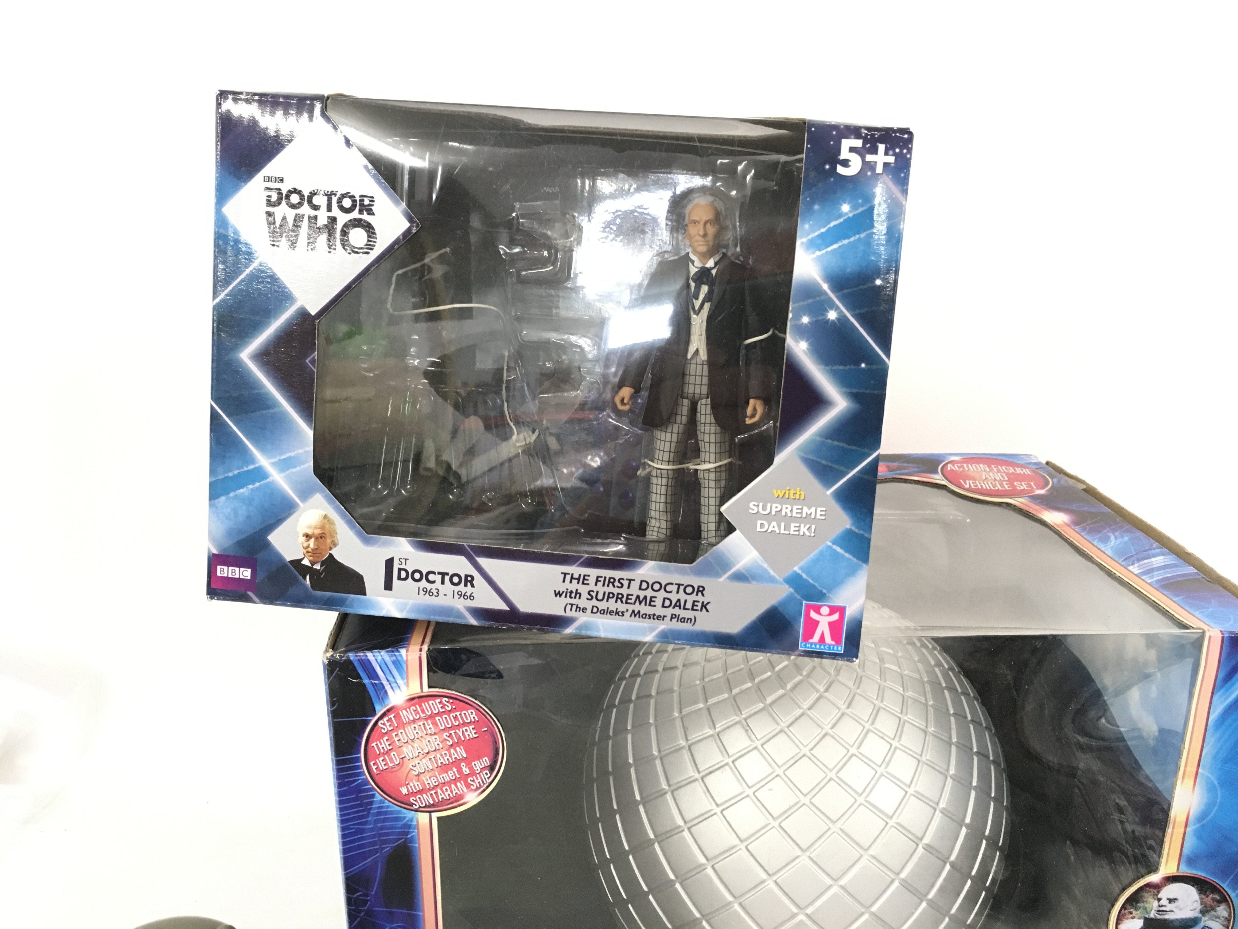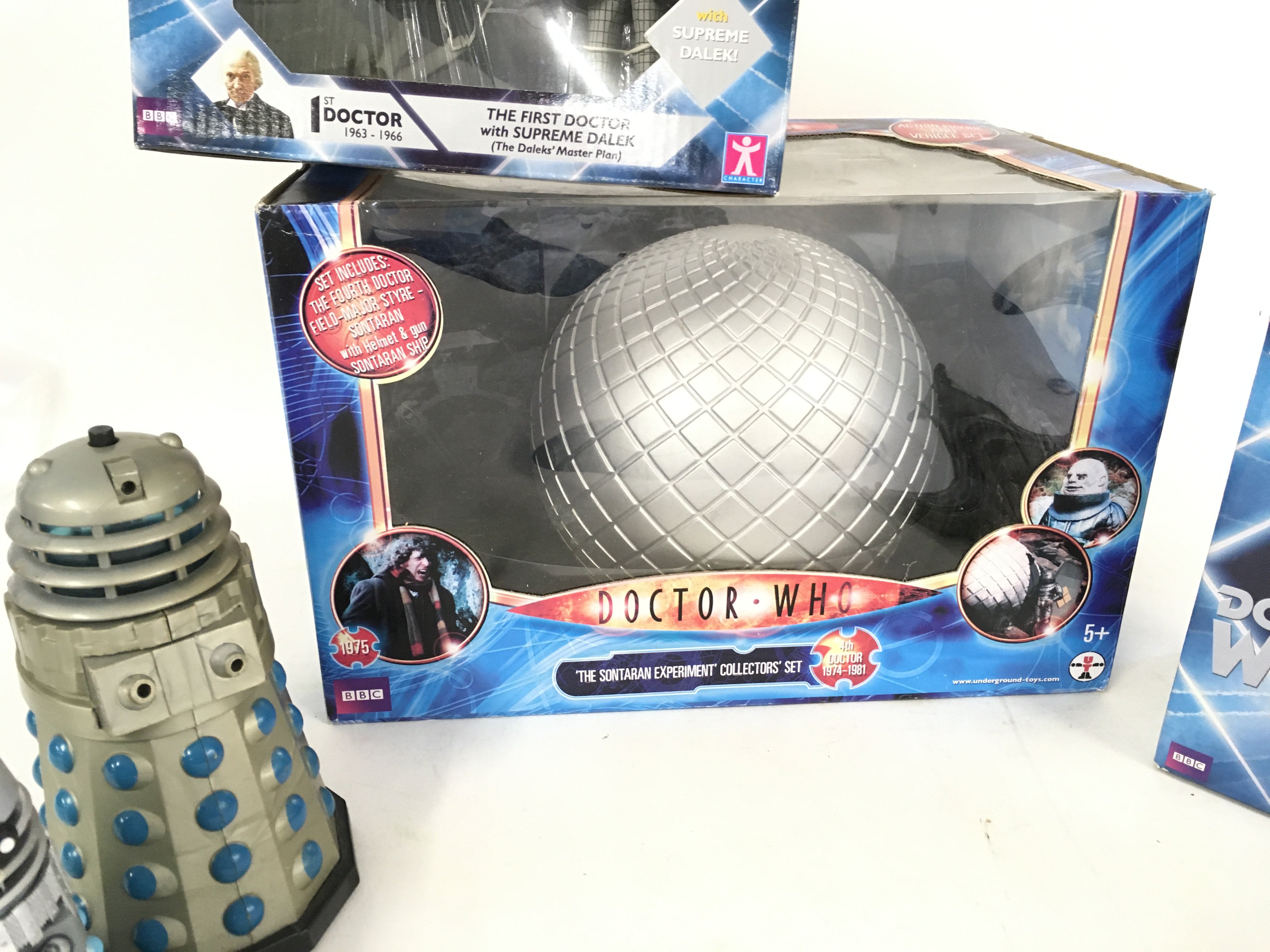 A collection of Dr Who action figures and incomplete boxed toys. Includes The Sontaran Experiment..The First Doctor..The Jungles of Mechanus etc.