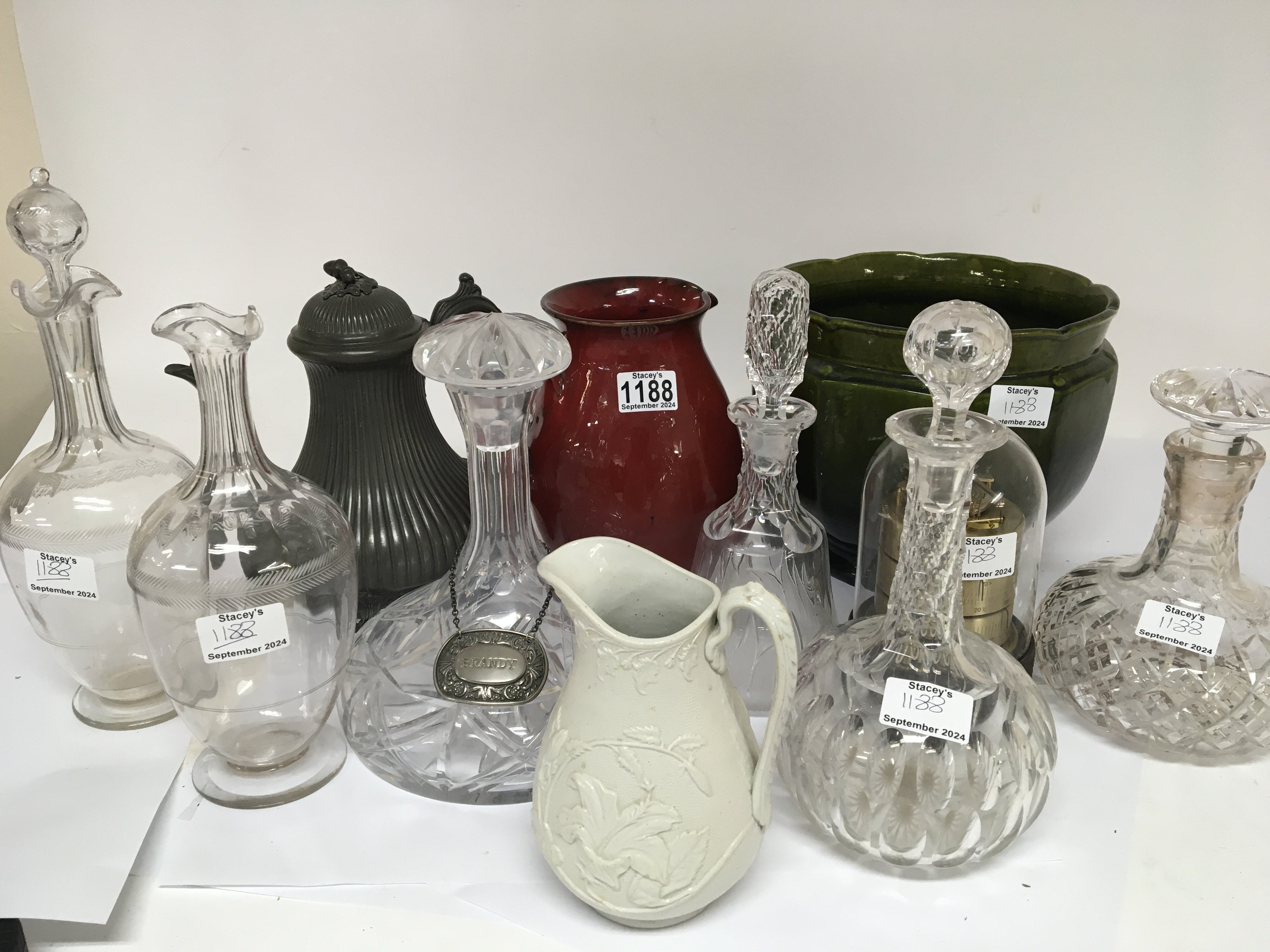 A collection of decanters a green glazed jardiniere and other ornaments.