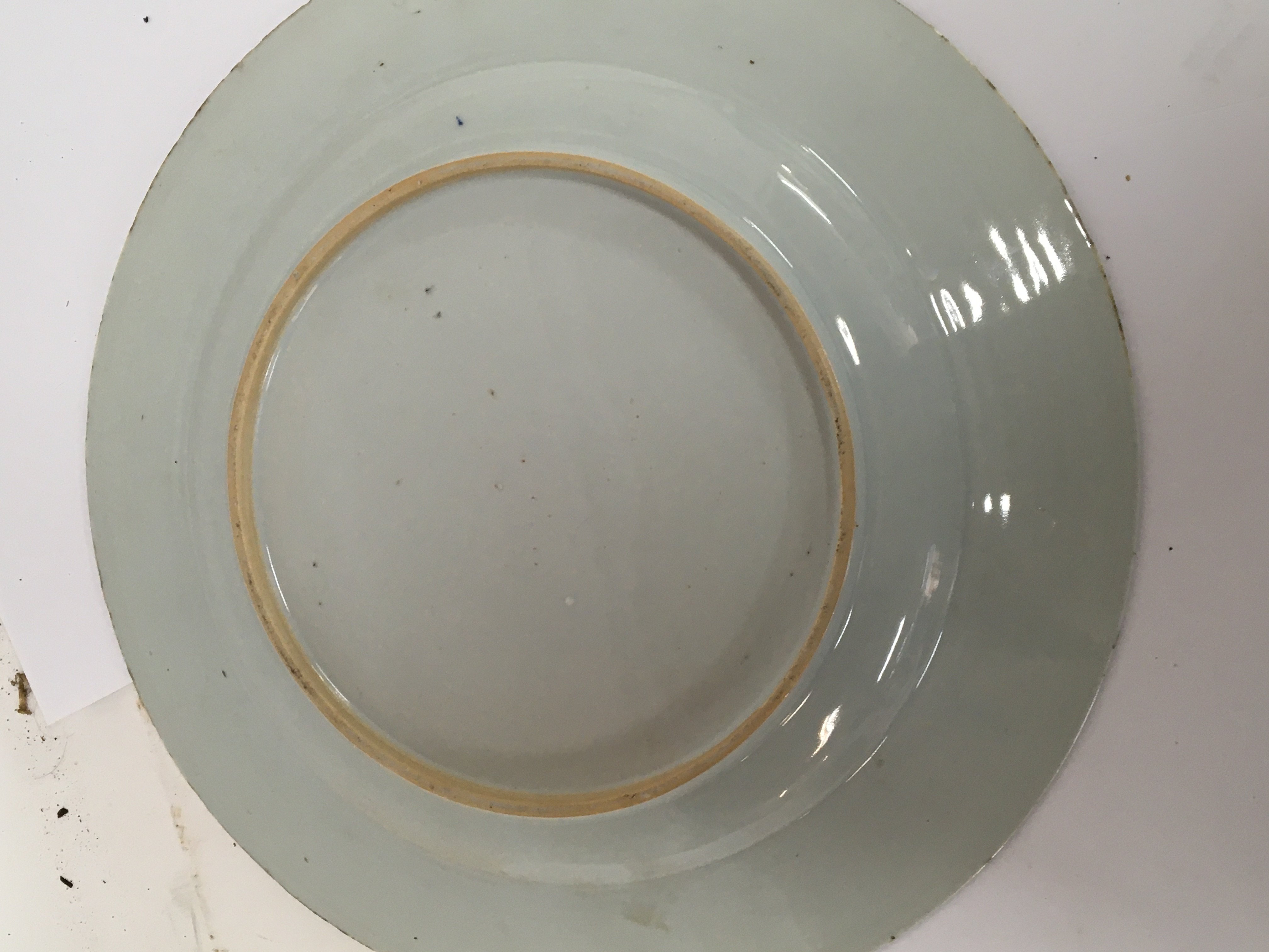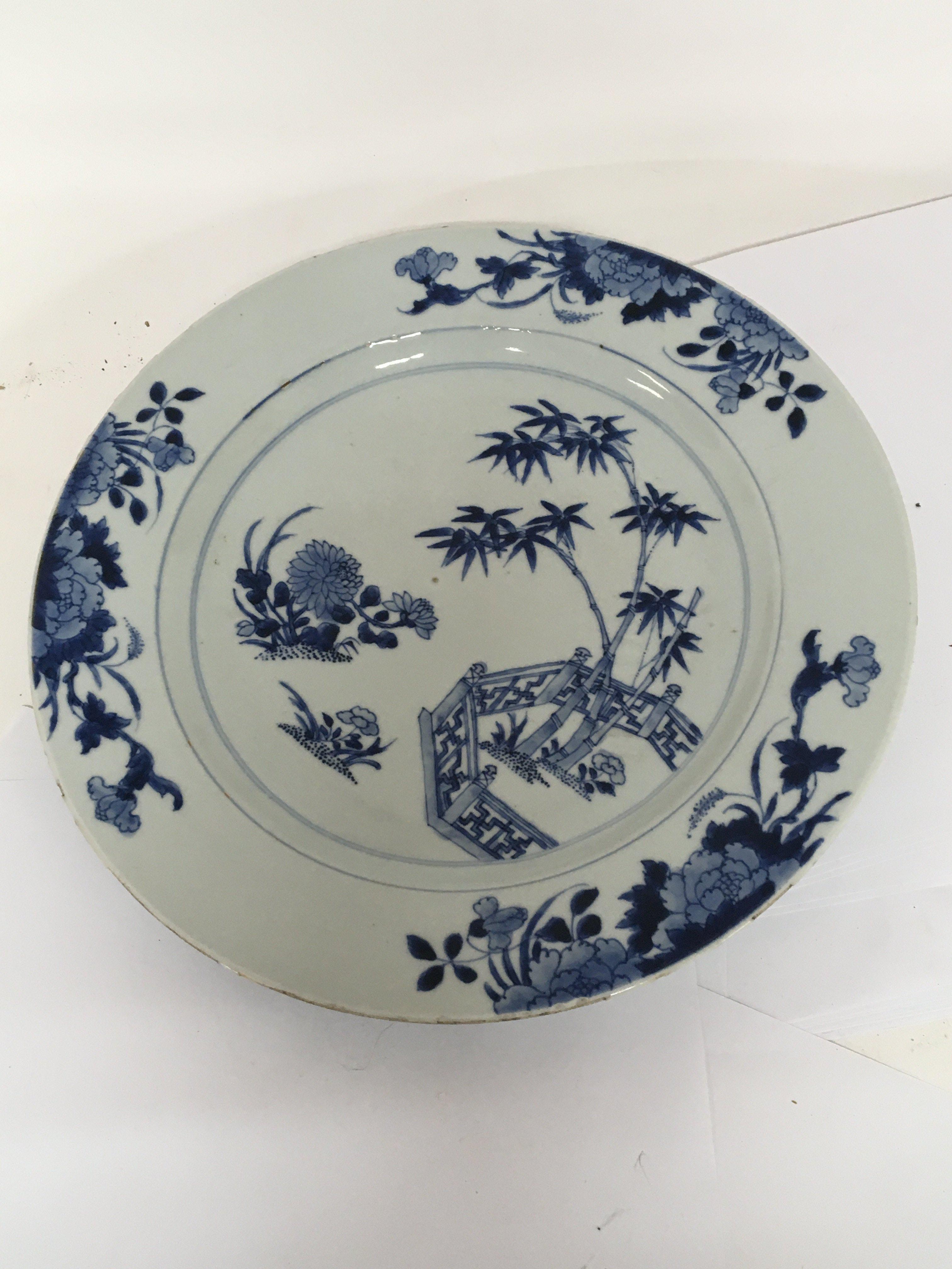 A large Chinese Export porcelain blue and white dish very minor rim Frits otherwise no damage diameter 36cm