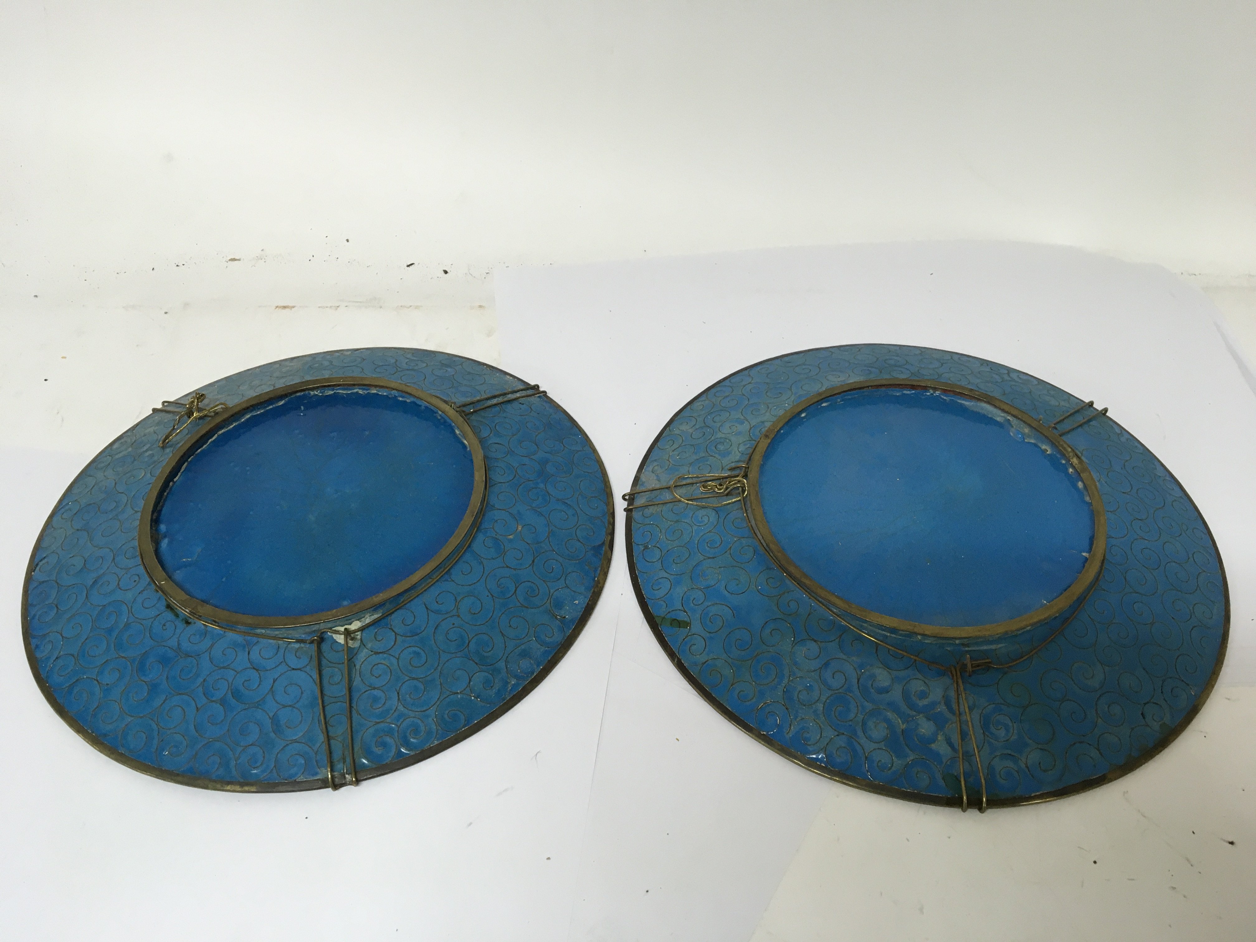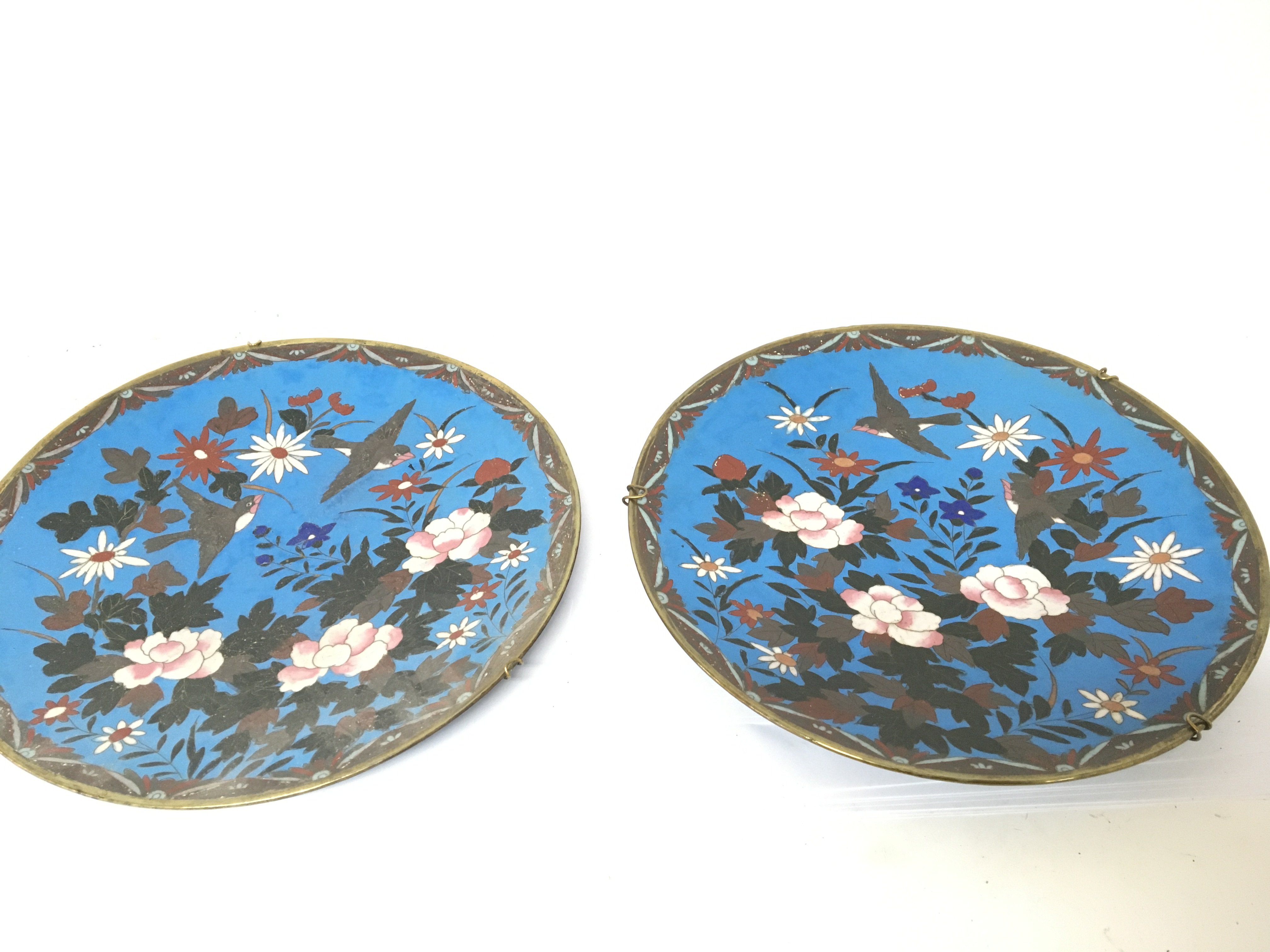 A pair of Cloisonné dishes decorated with birds and flowers and foliage 30cm . (2)