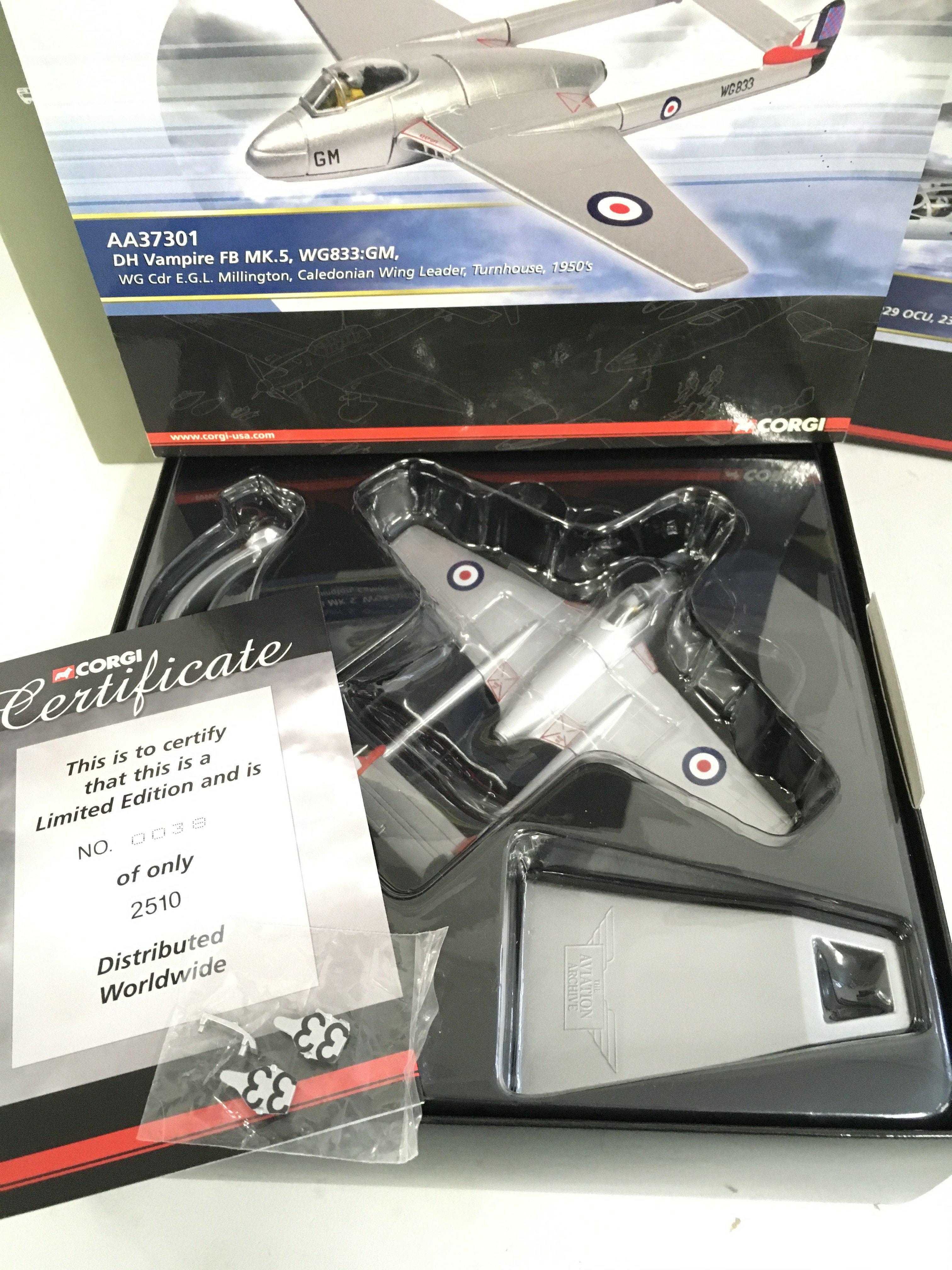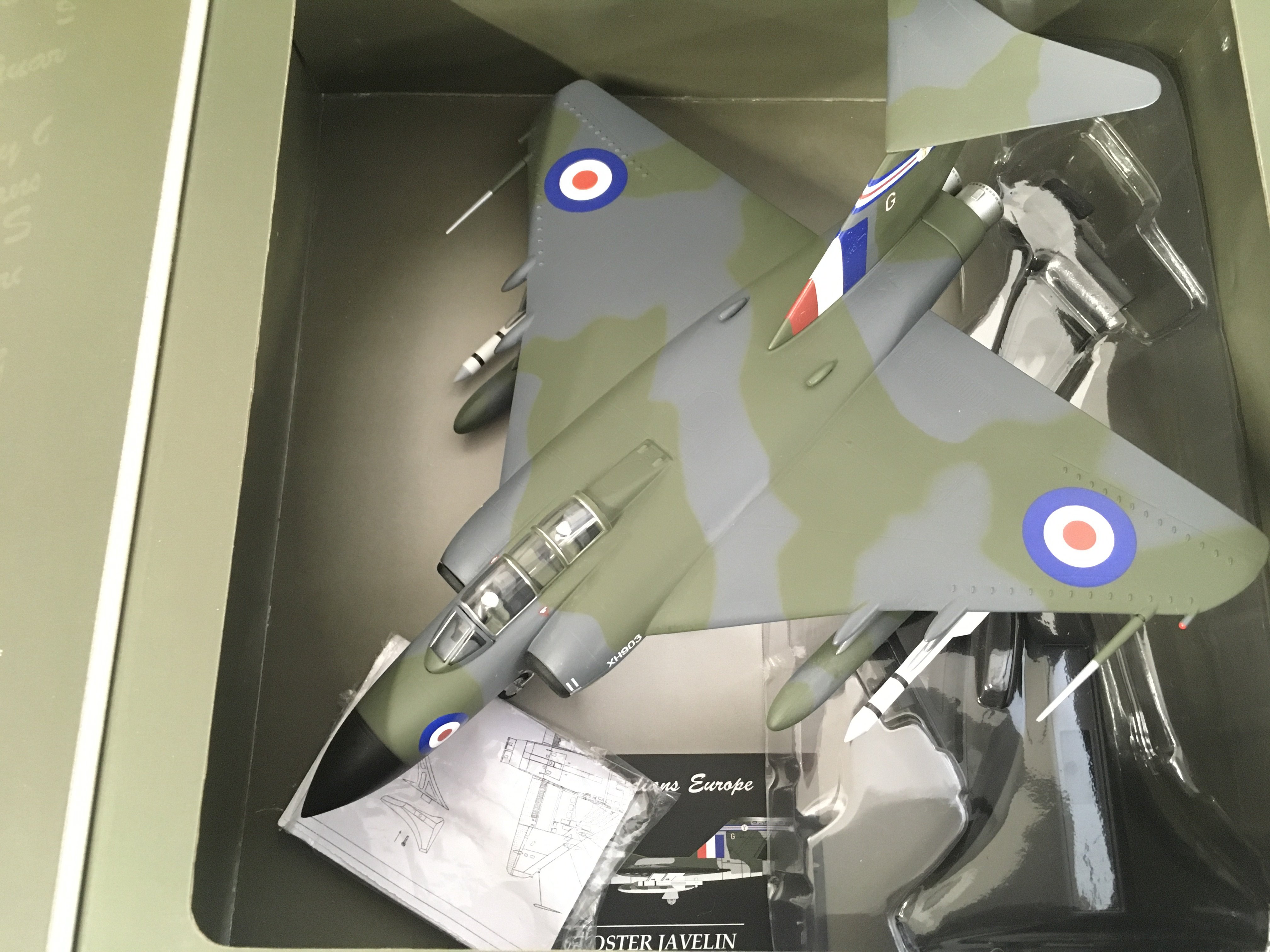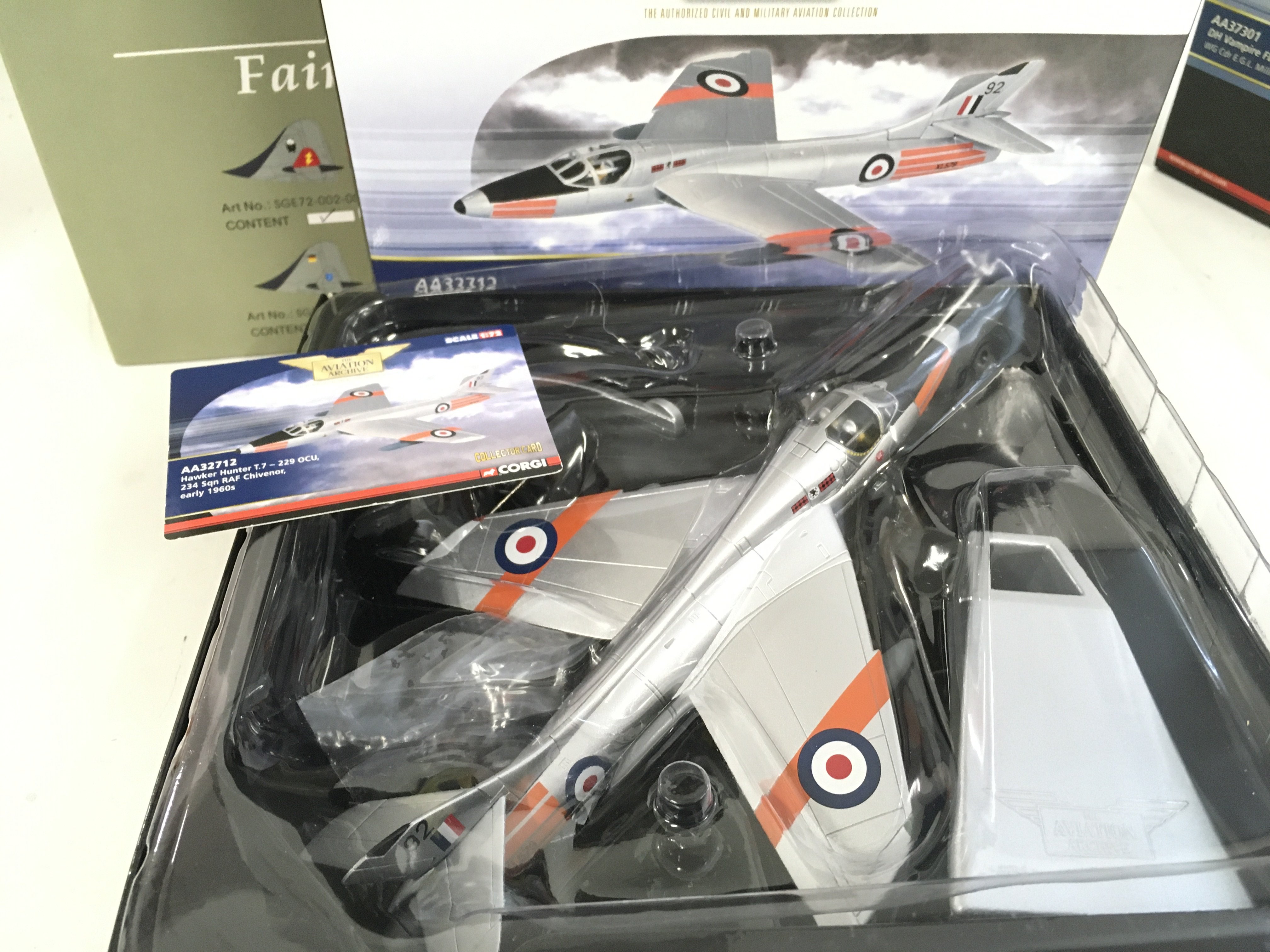 2 X Boxed Corgi Aviation Archive Models a Hawker hunter #AA32712. A DH Vampire #AA37301. And 2 X sky Guardians Models. A Gloster Javelin and a Fairey Gannet. Wheels have been glued in.