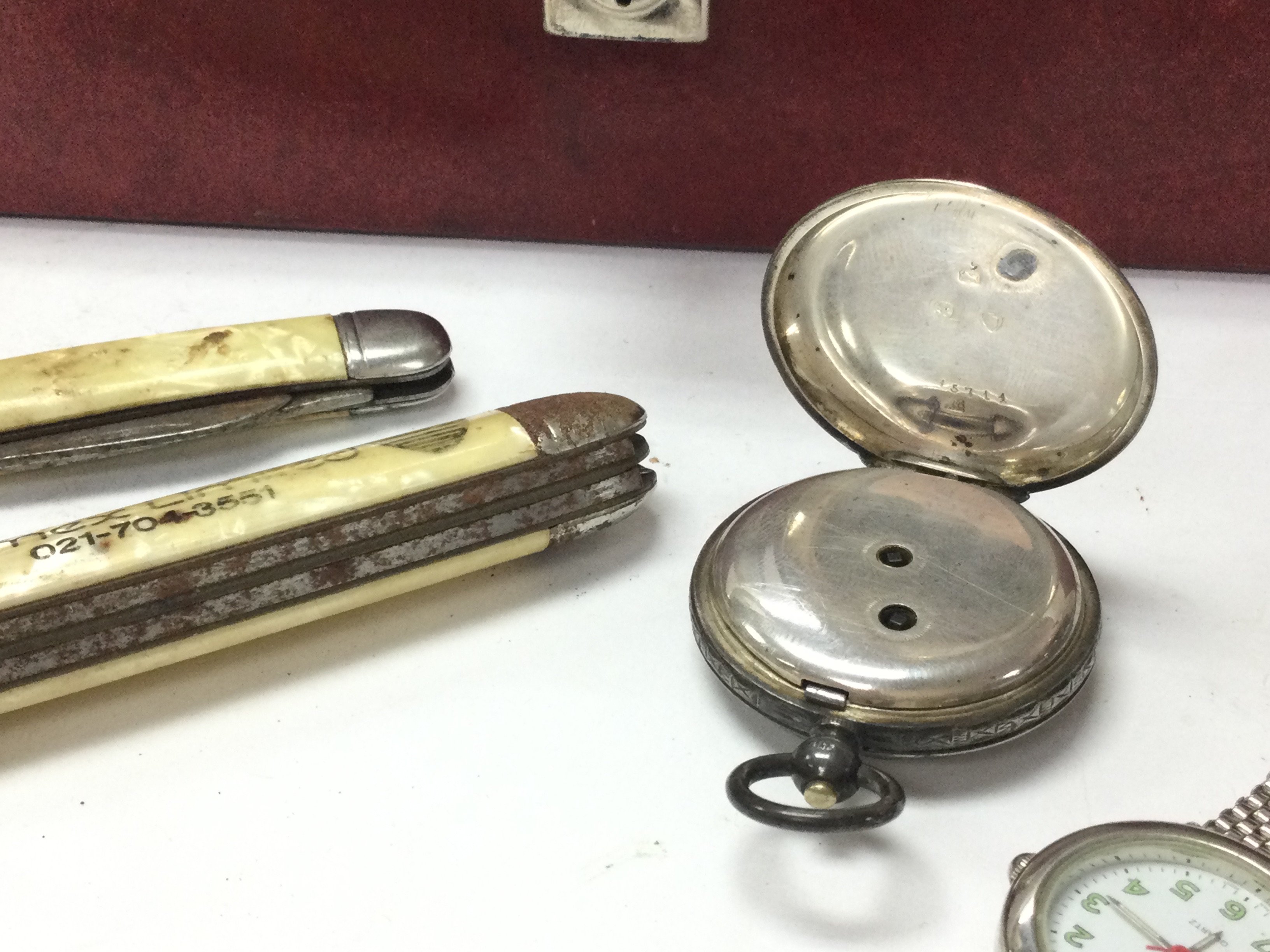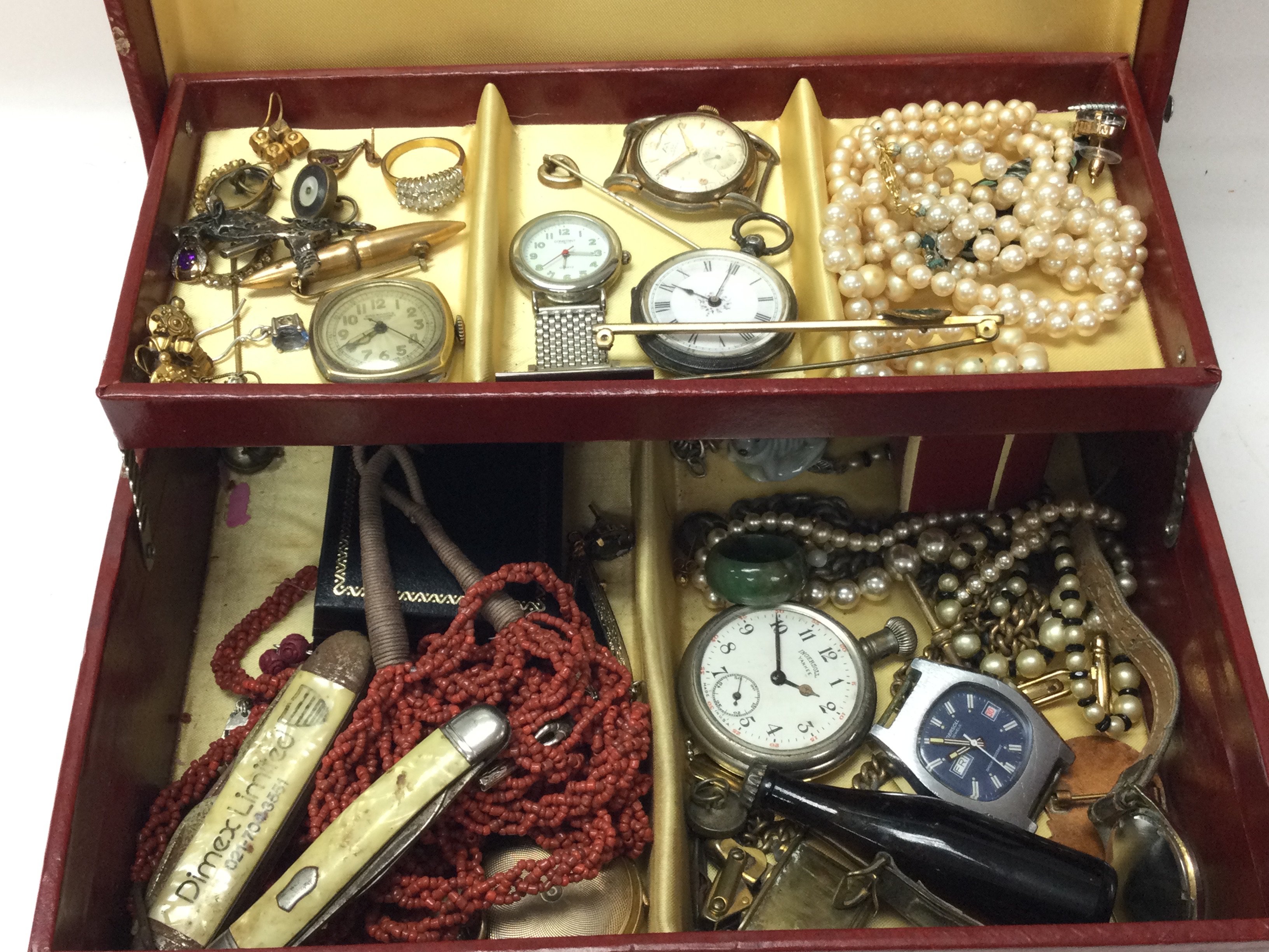 A collection of costume jewellery including mother of pearl pen knives, pearl necklaces, a silver hallmarked cased pocket watch, various other pocket watches, silver hallmarked ring etc. postage category C