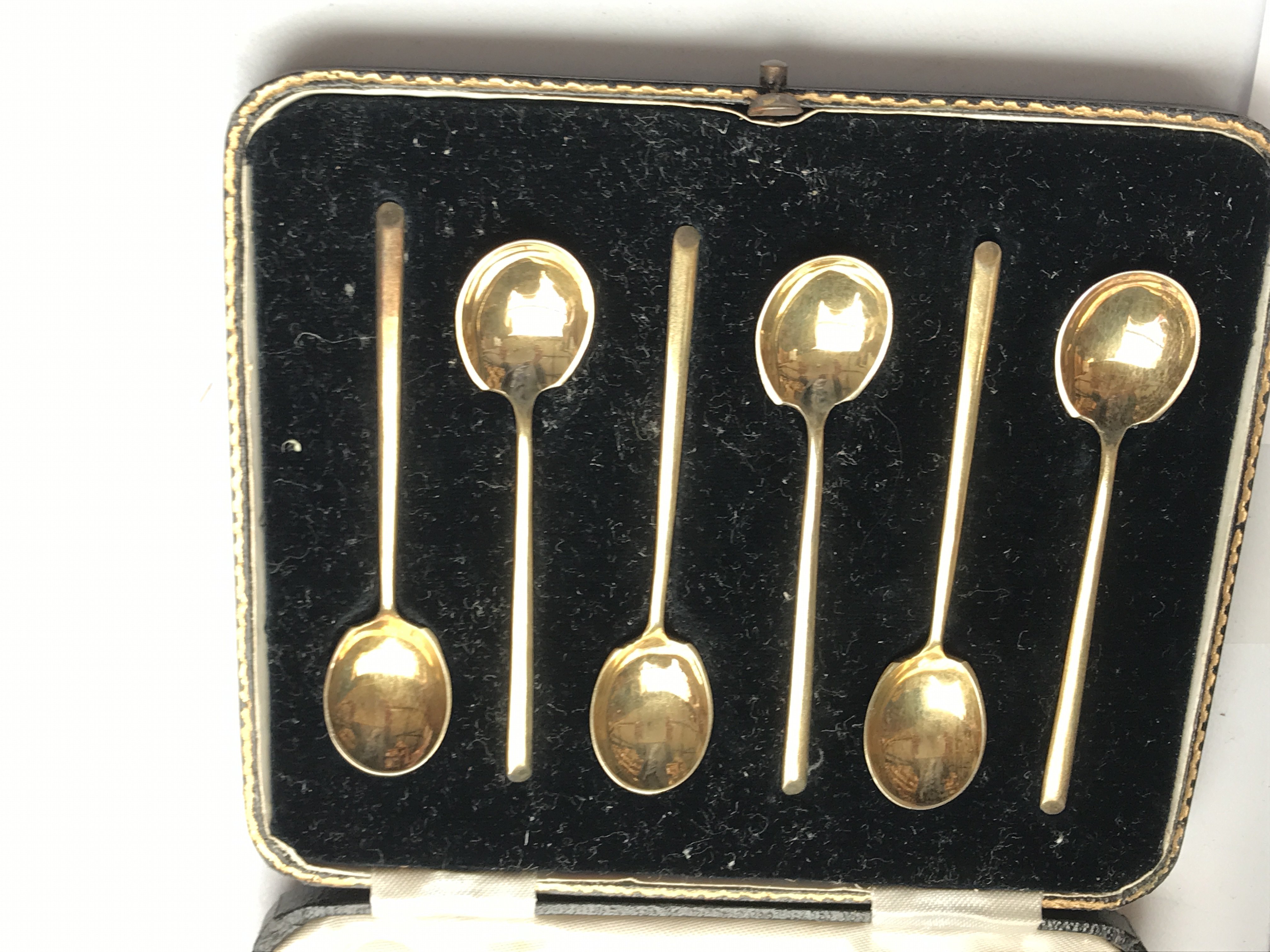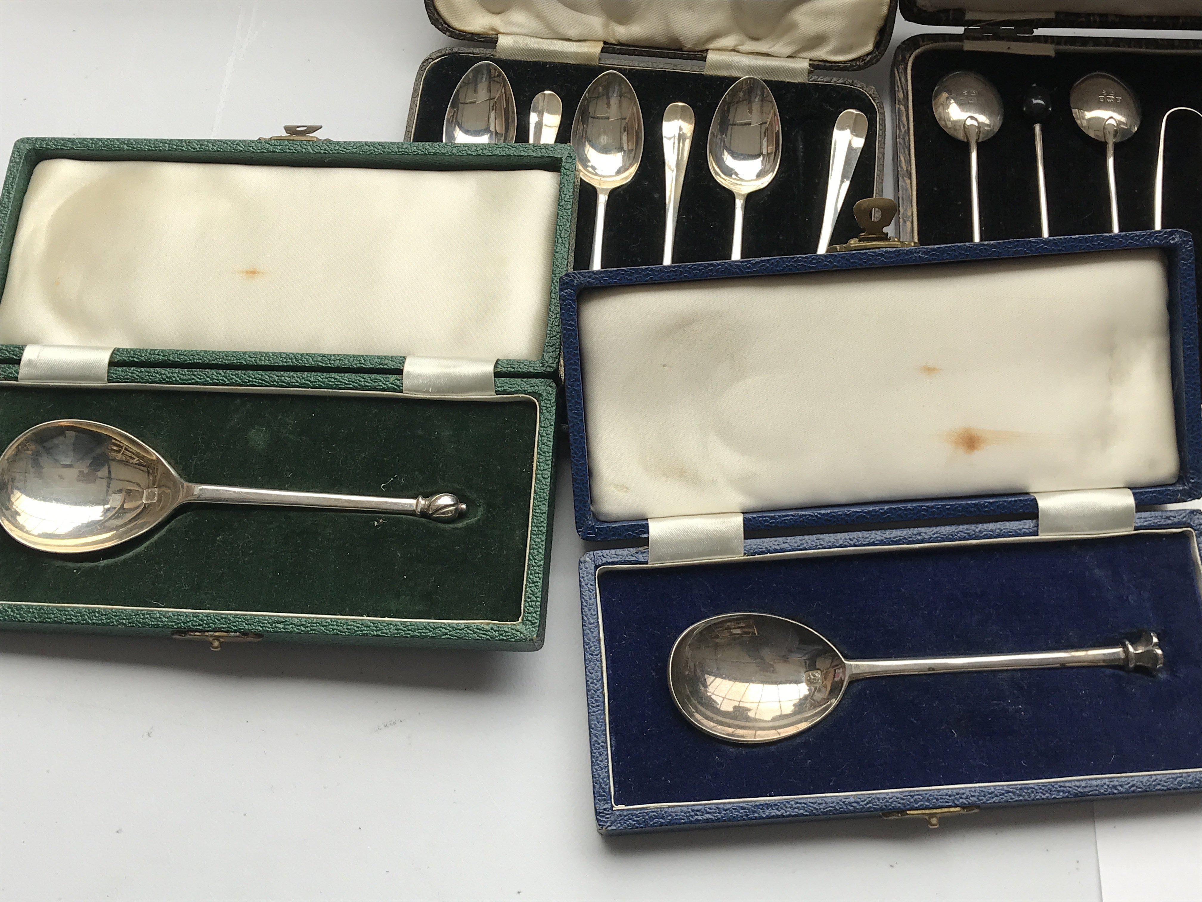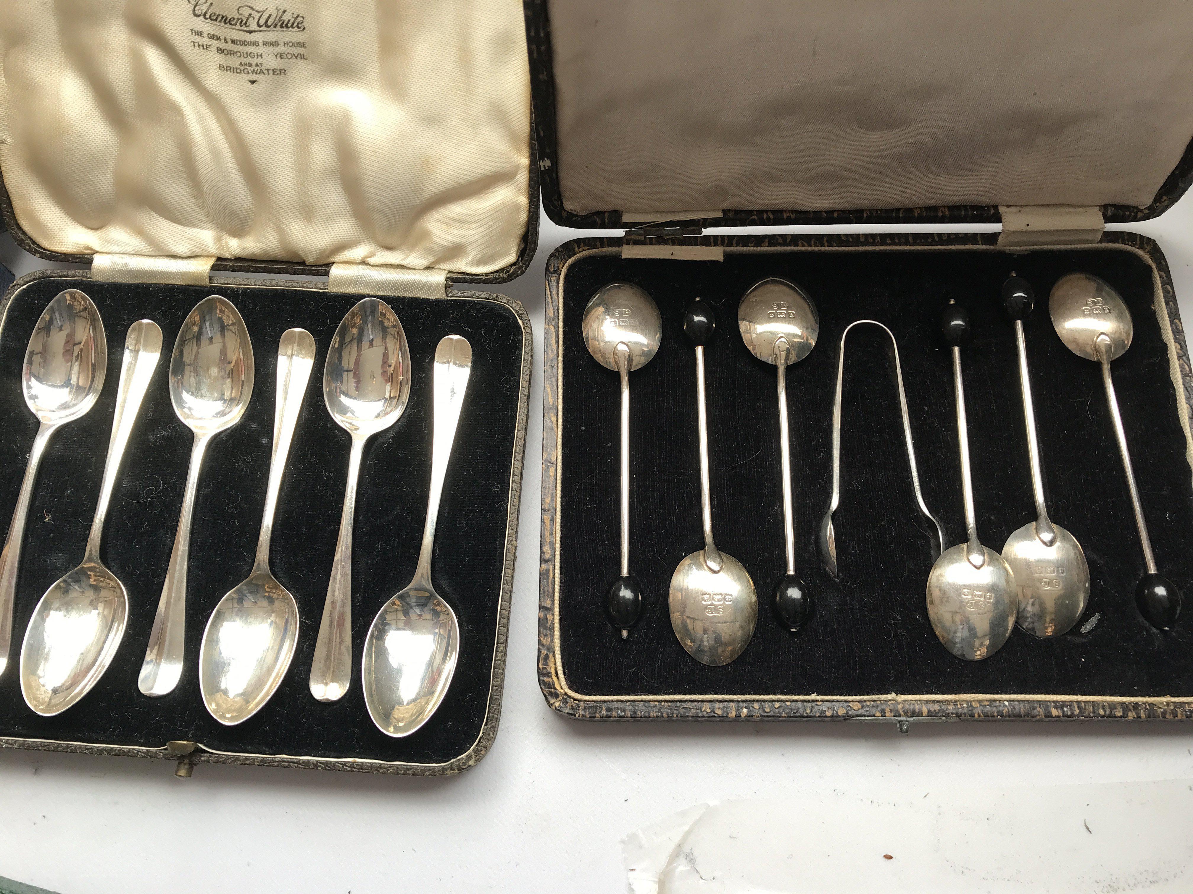Three cased silver tea / coffee spoons and two cased silver spoons.