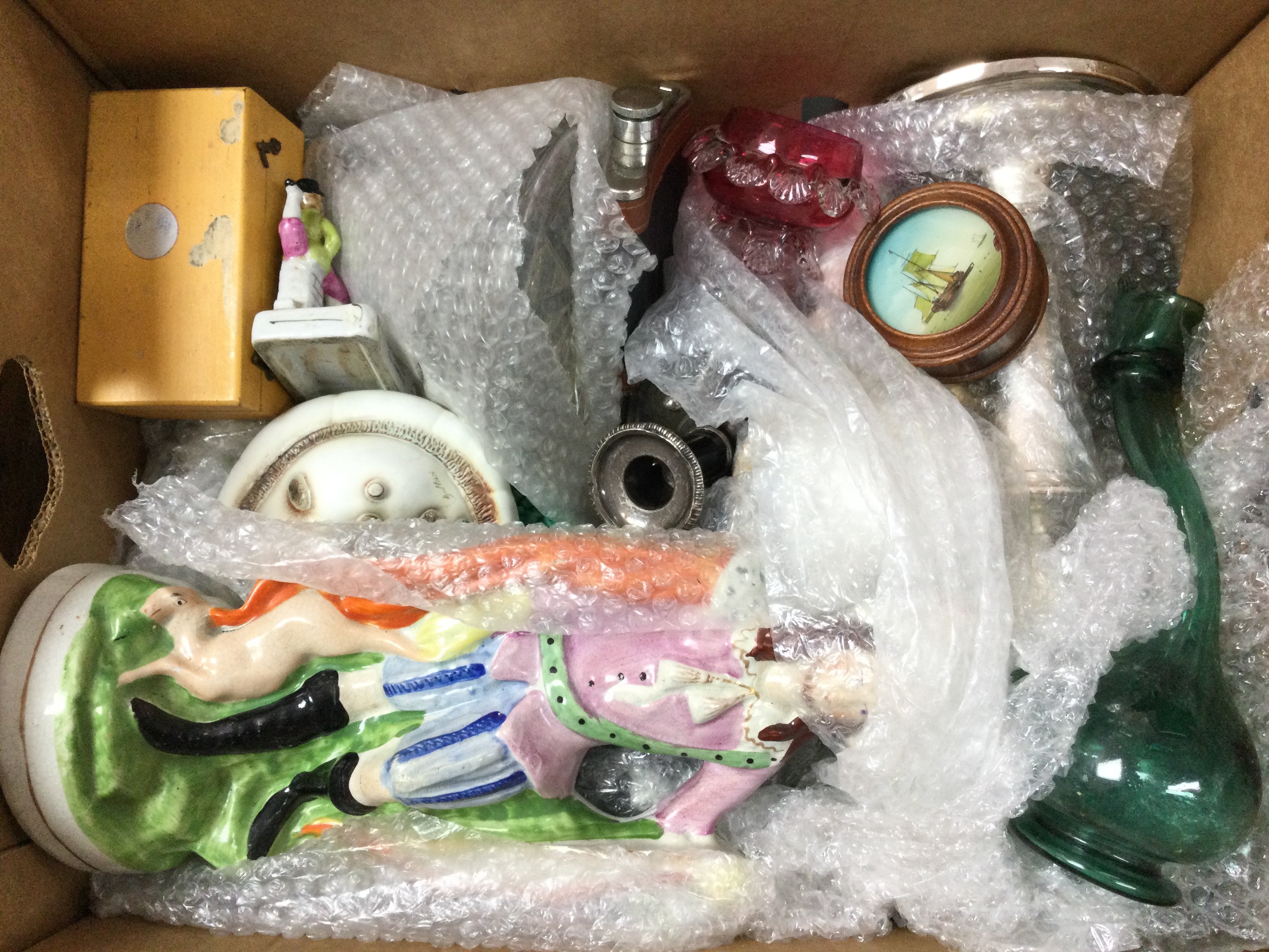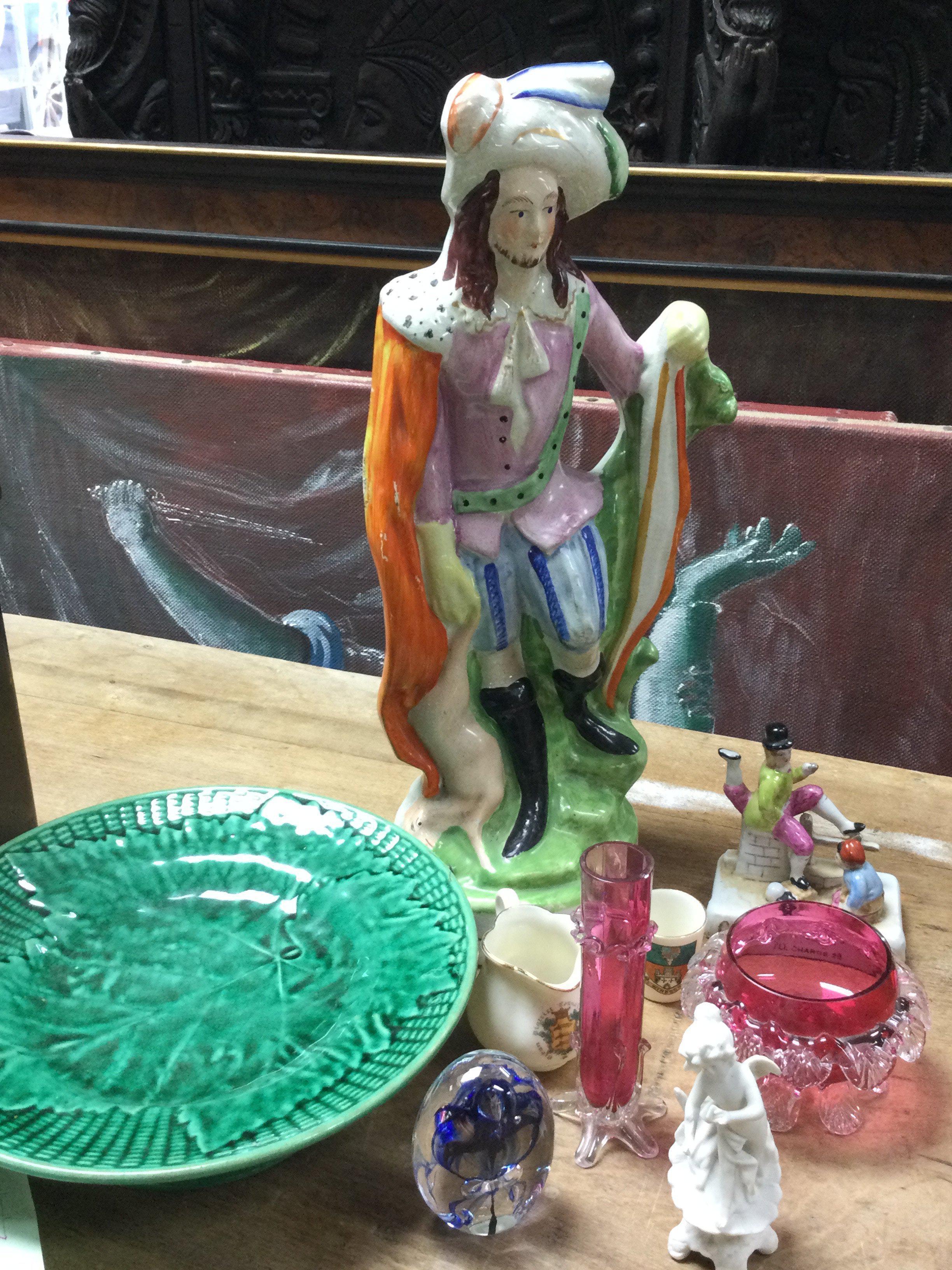 A collection of ceramics including a large Staffordshire figure , Victorian cranberry glass