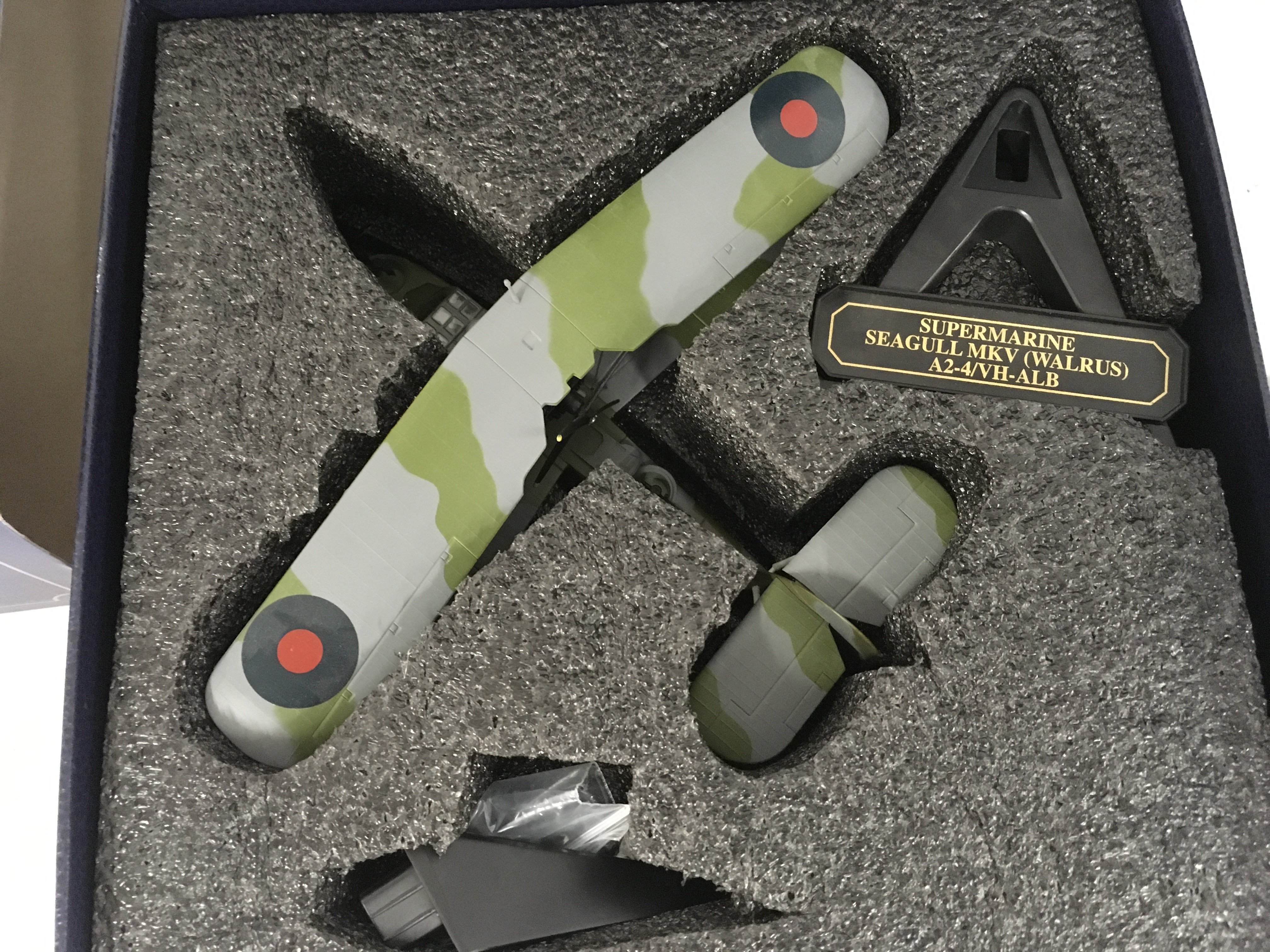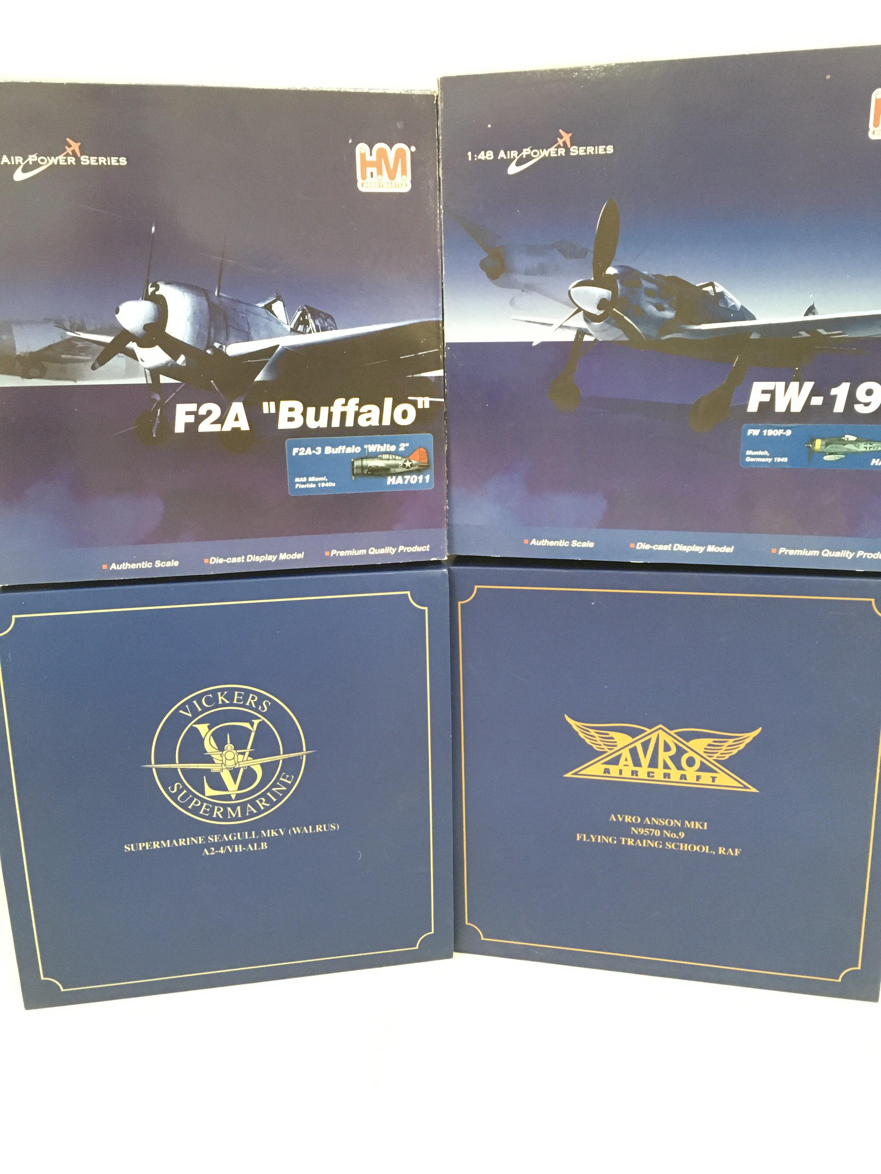 2 Boxed Hobby-masters Model Aircraft. A F2 Buffalo and a FW-190 A/F. 2 Boxed Oxford Aircraft. A Supermarine Seagull and A Avro Anson MKI. Wheels have been glued in.(4).