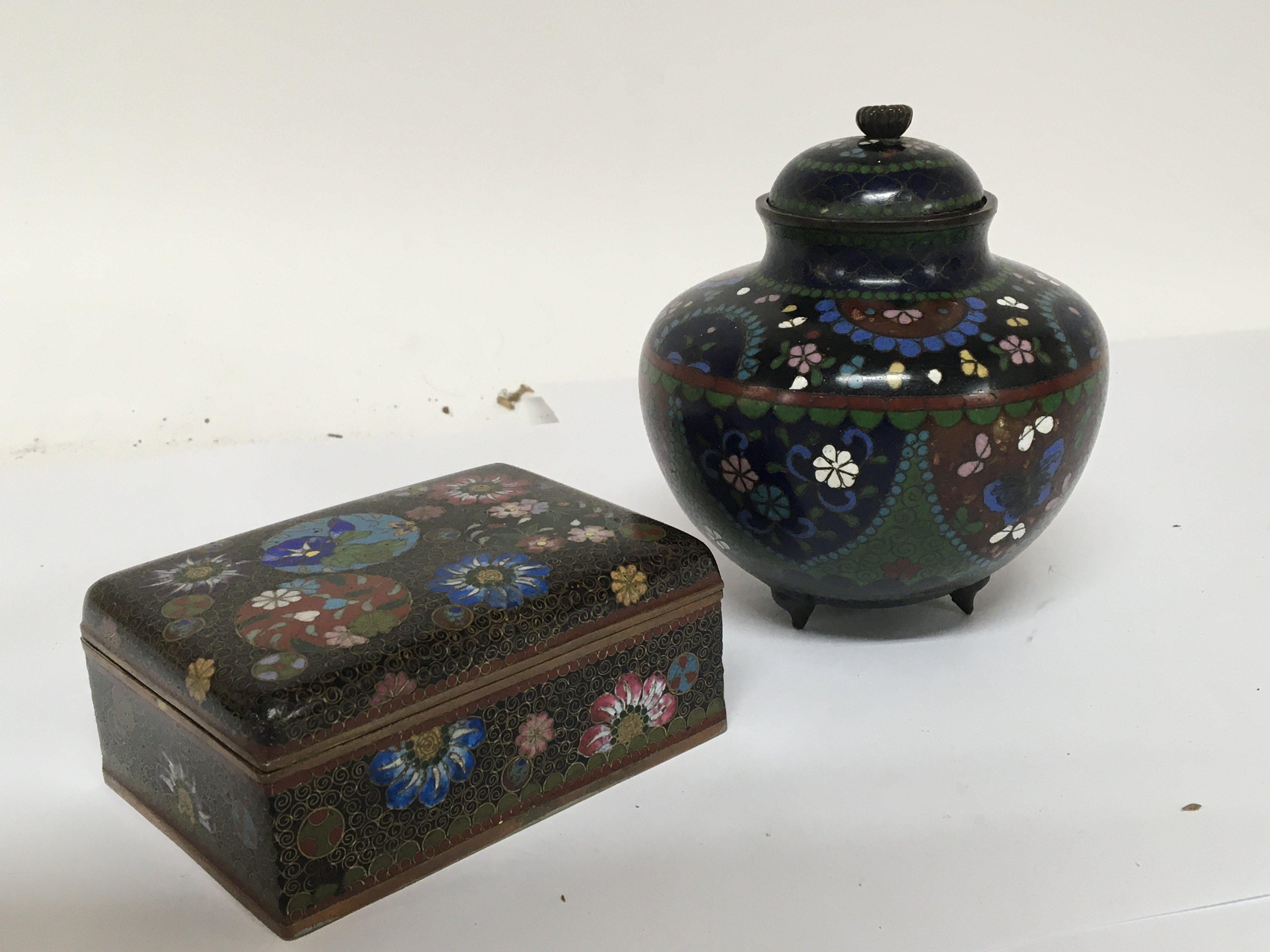 A Quality Cloisonné box 10cm x8cm decorated with roundels of flowers and a cloisonné vase and cover. (2)