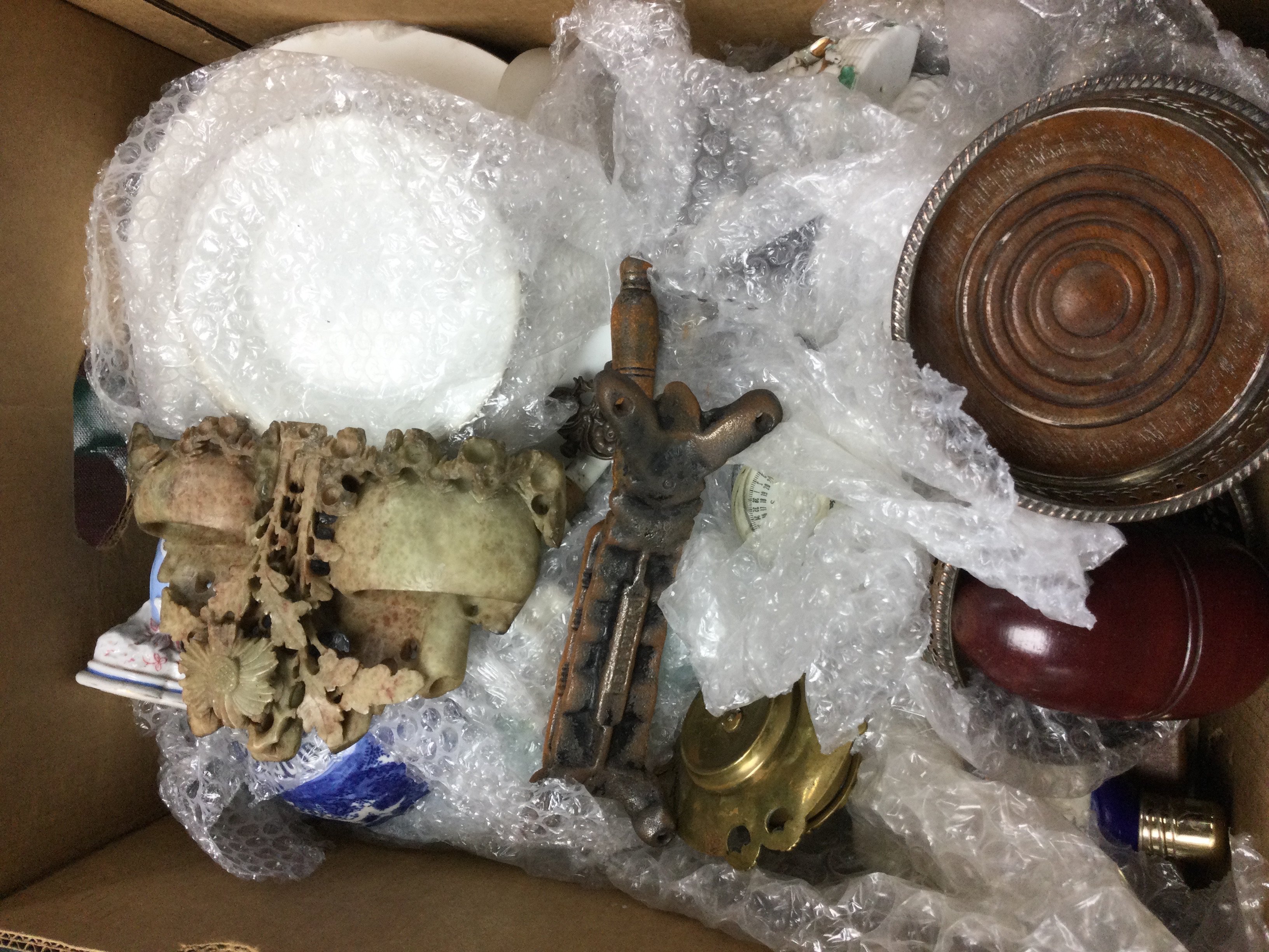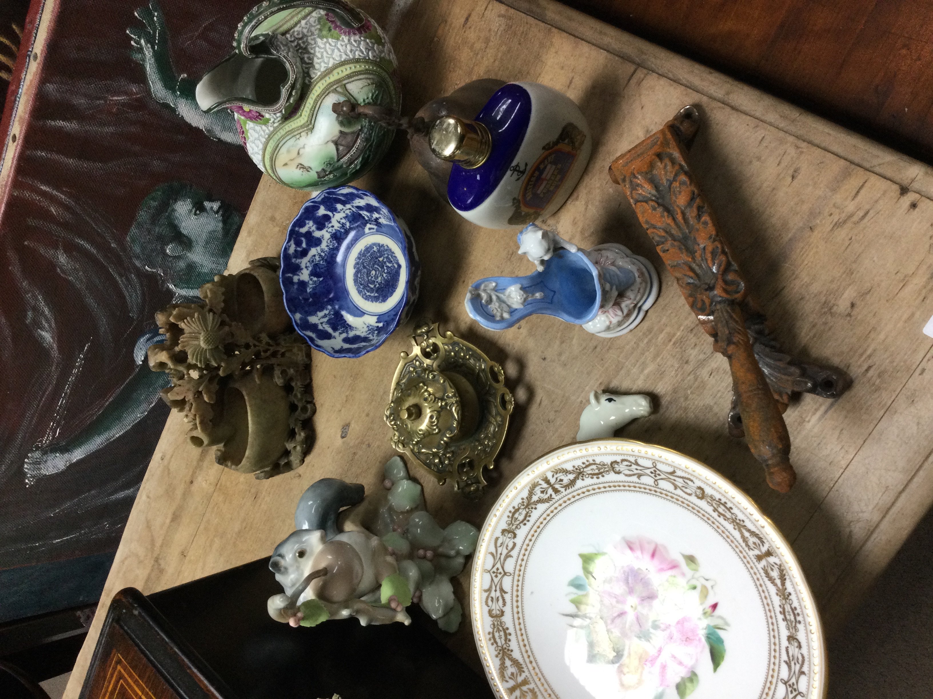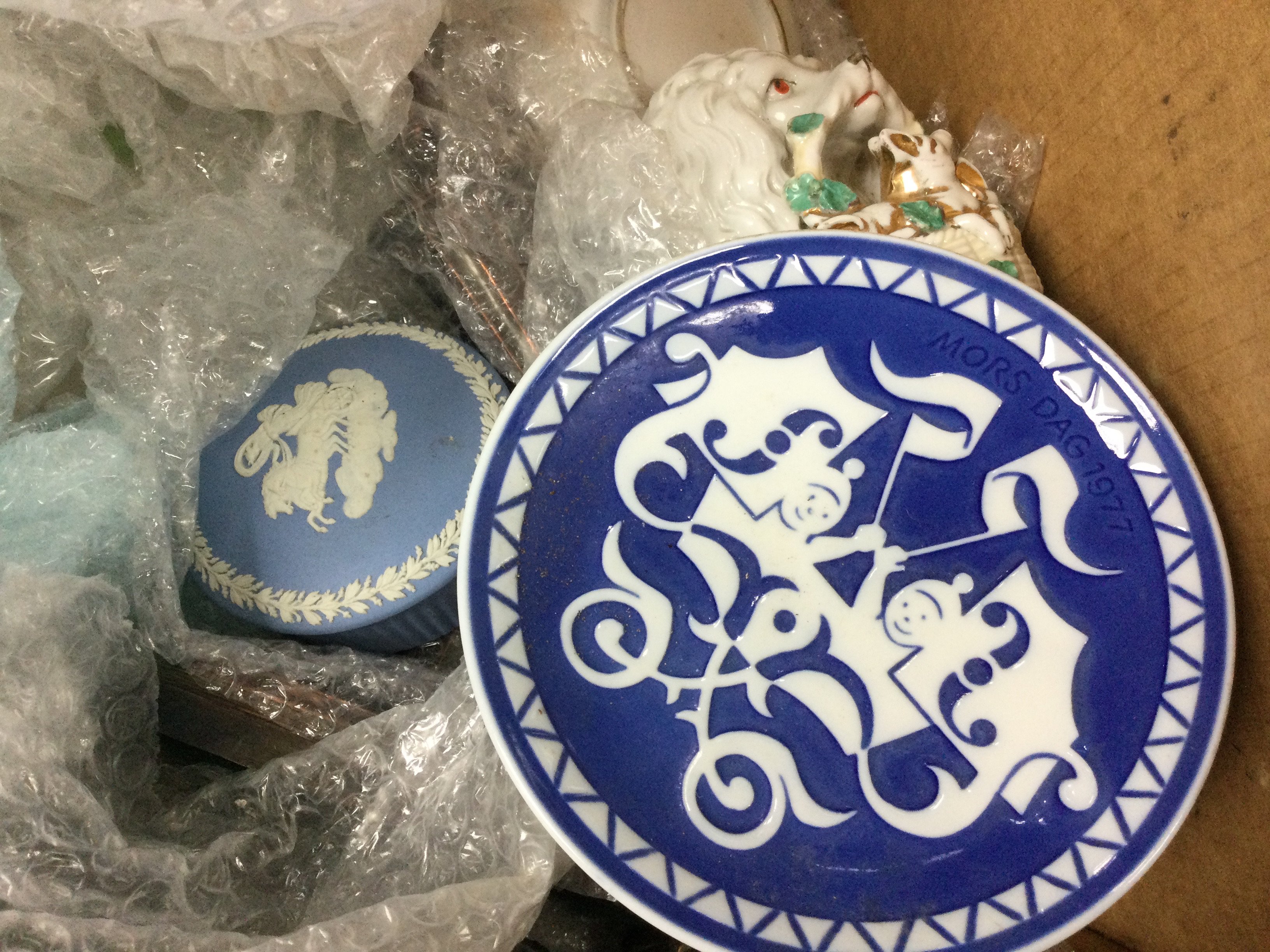 A collection of ceramics and other items including a Lladro squirrel figure, porcelain horse head topped cork, Royal Copenhagen, Wedgwood jasperware container. This lot cannot be posted