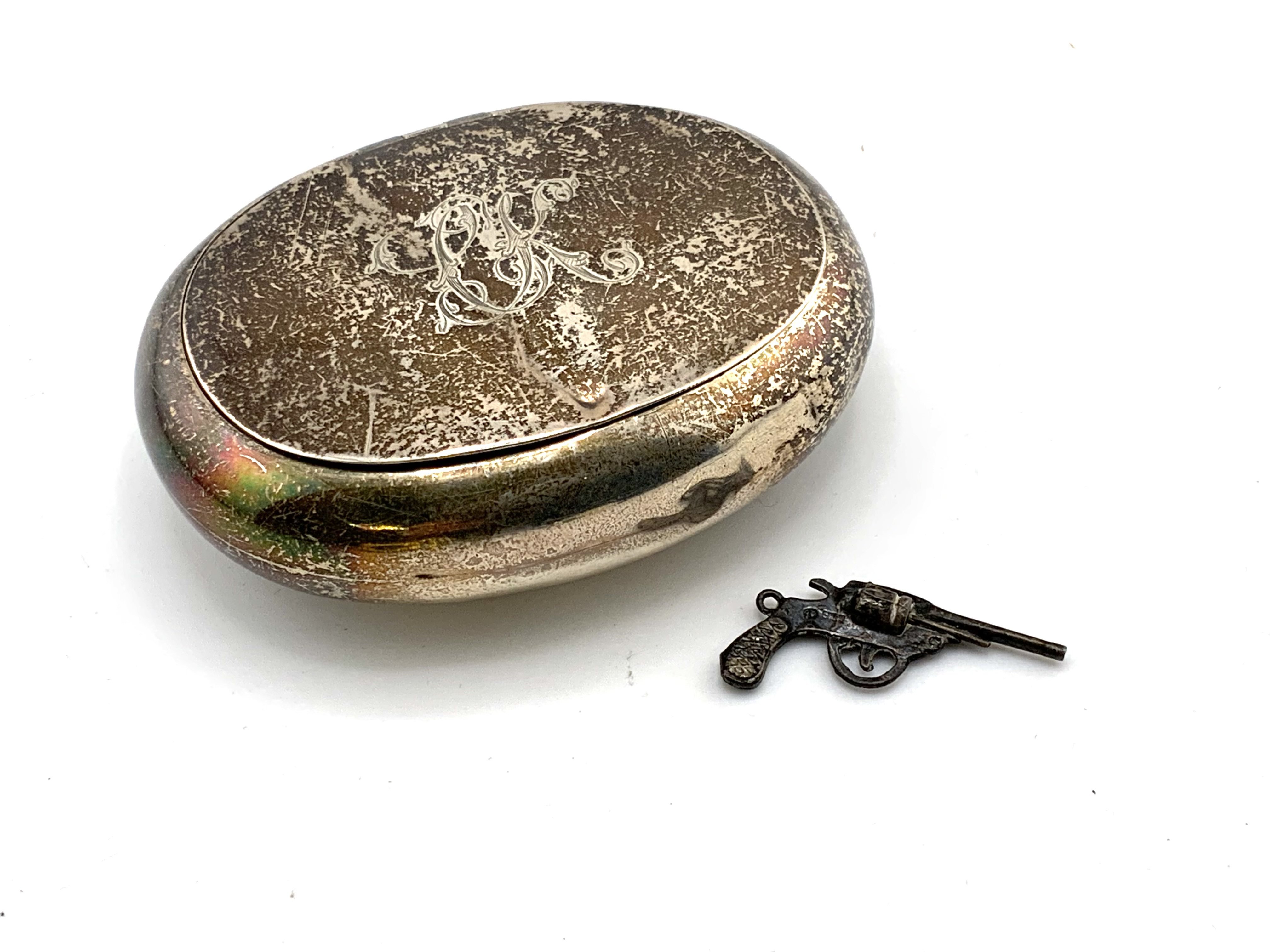 A hallmarked silver tobacco box together with a small silver gun charm. (A)