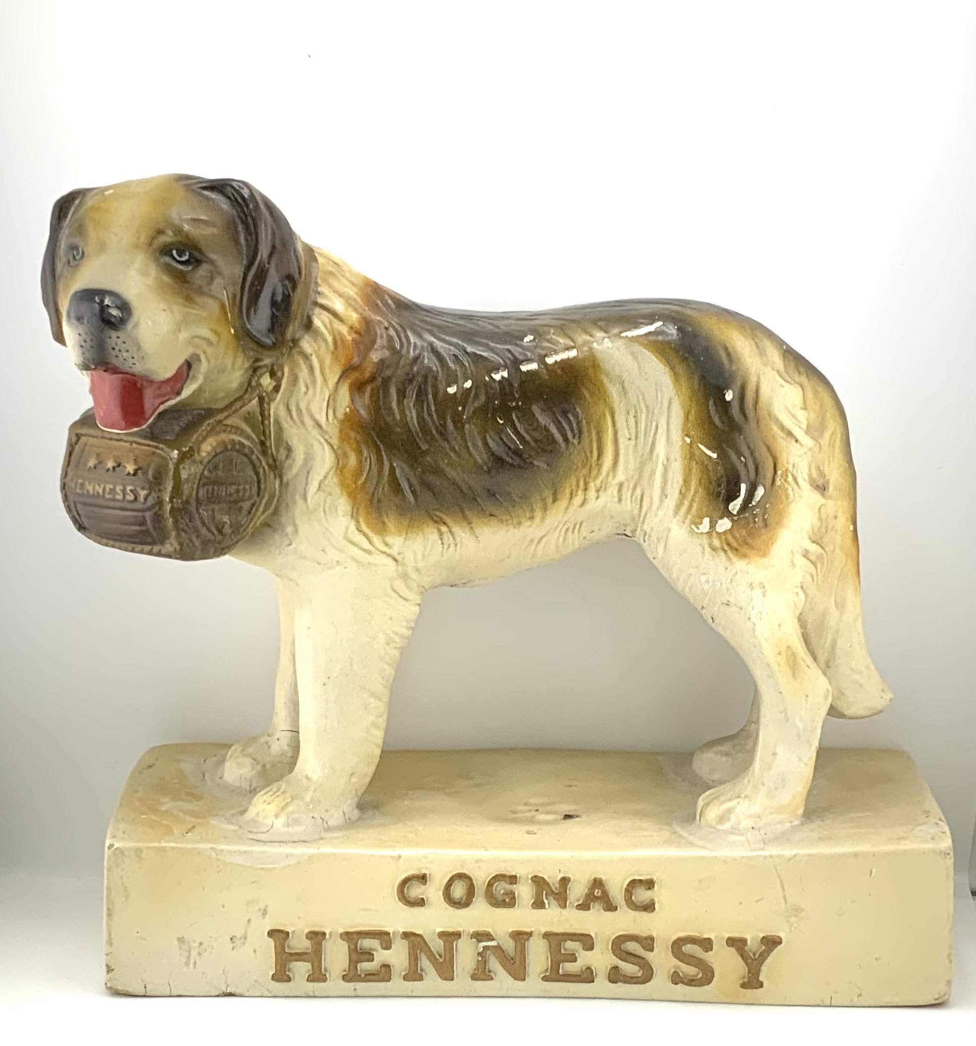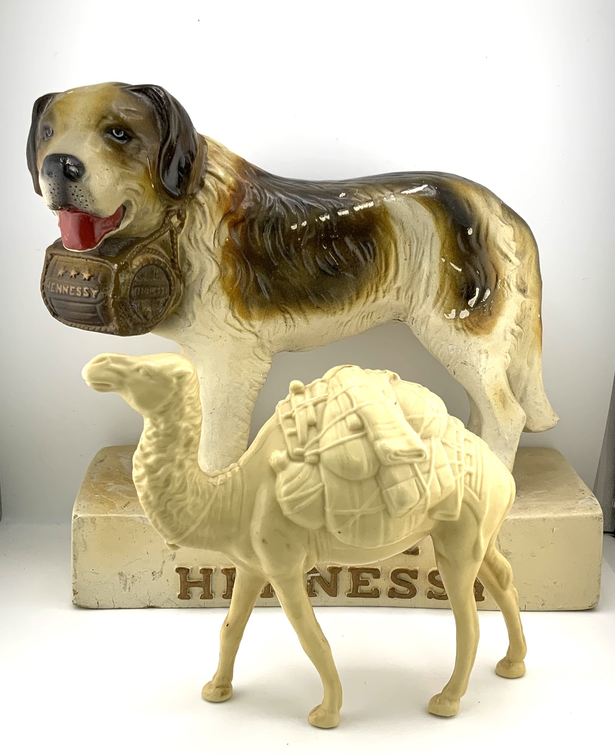 A vintage composite Cognac Hennessy St Bernard advertising figure, 26cm. Together with a resin figure of a camel. (D)
