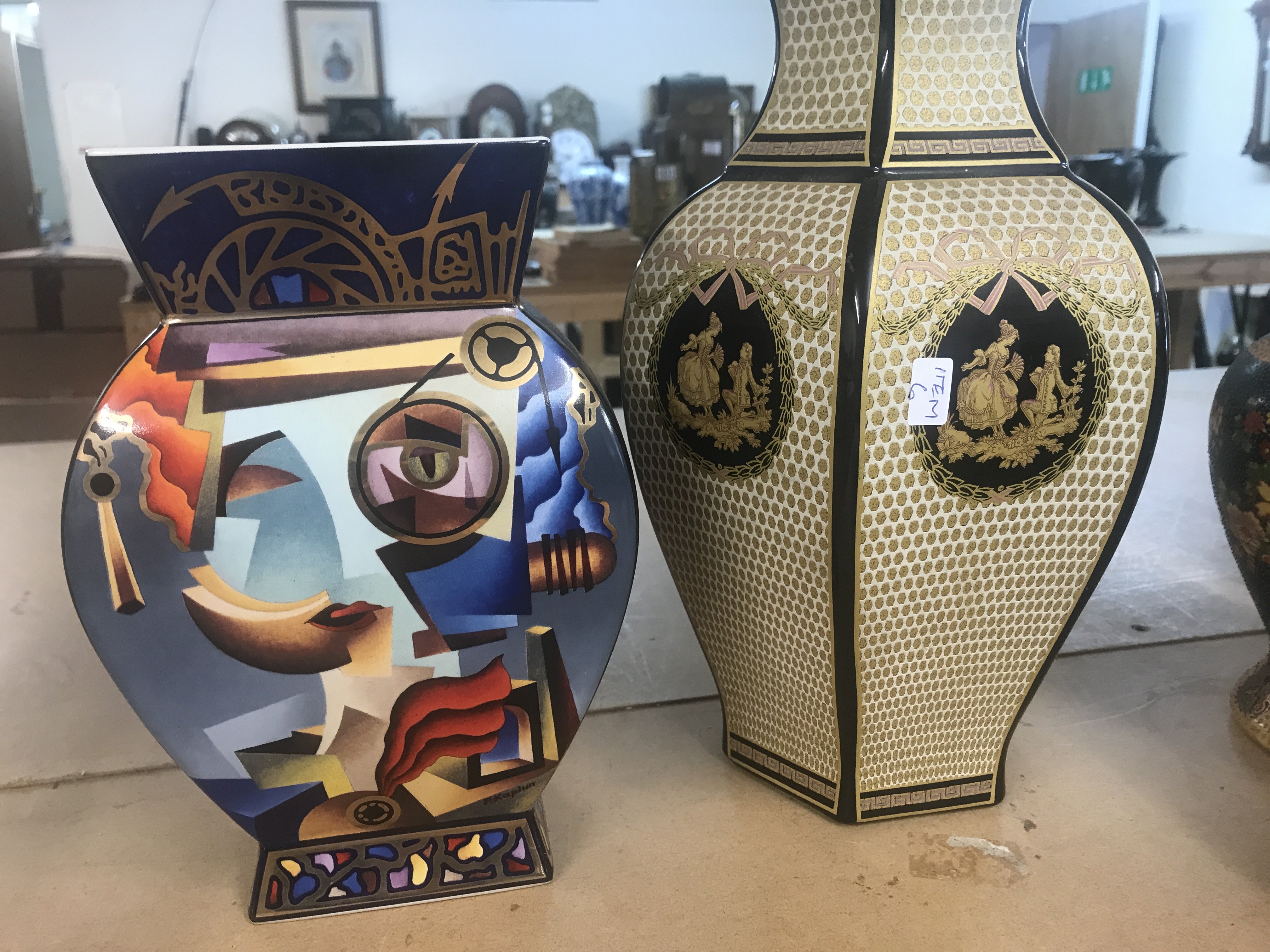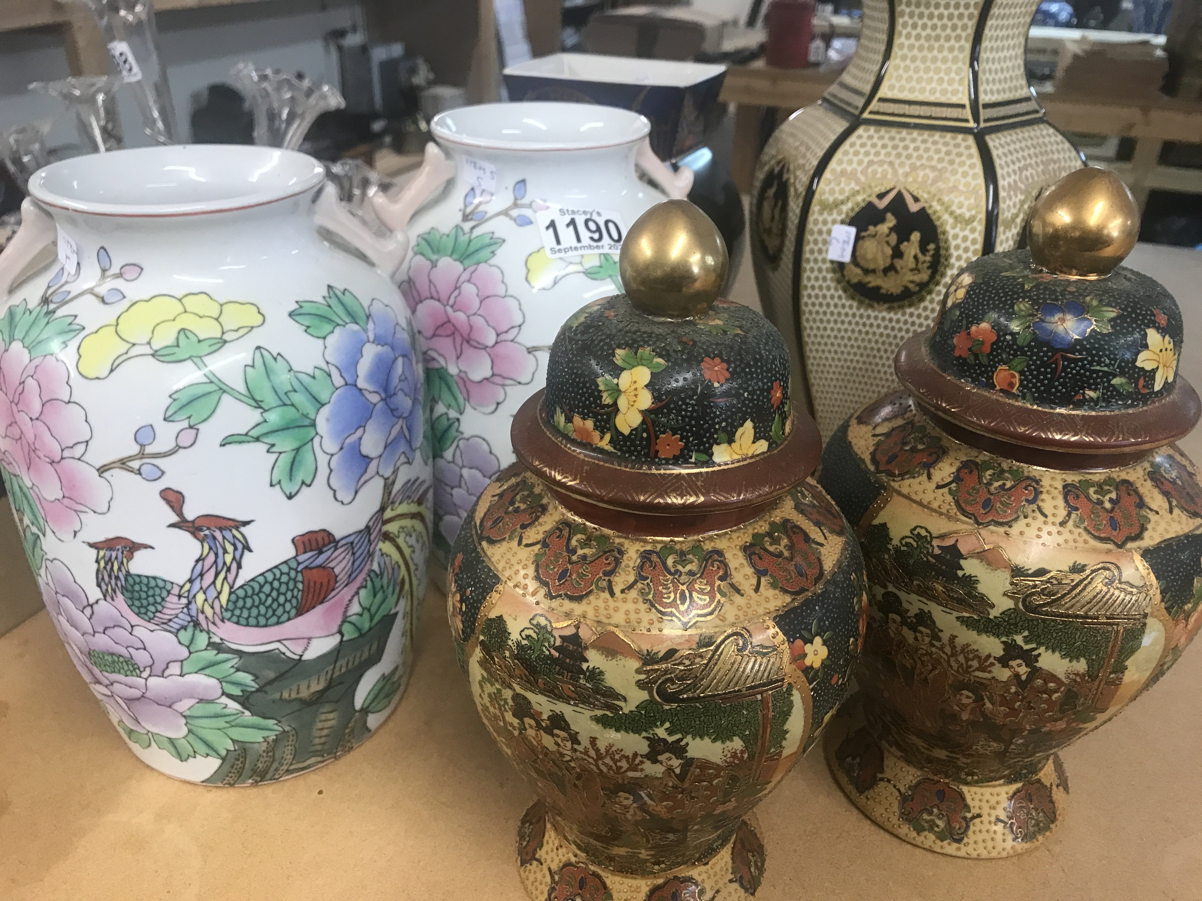 A collection of ceramics comprising two pairs of vases satsuma and Doulton style and two other decorative vases .