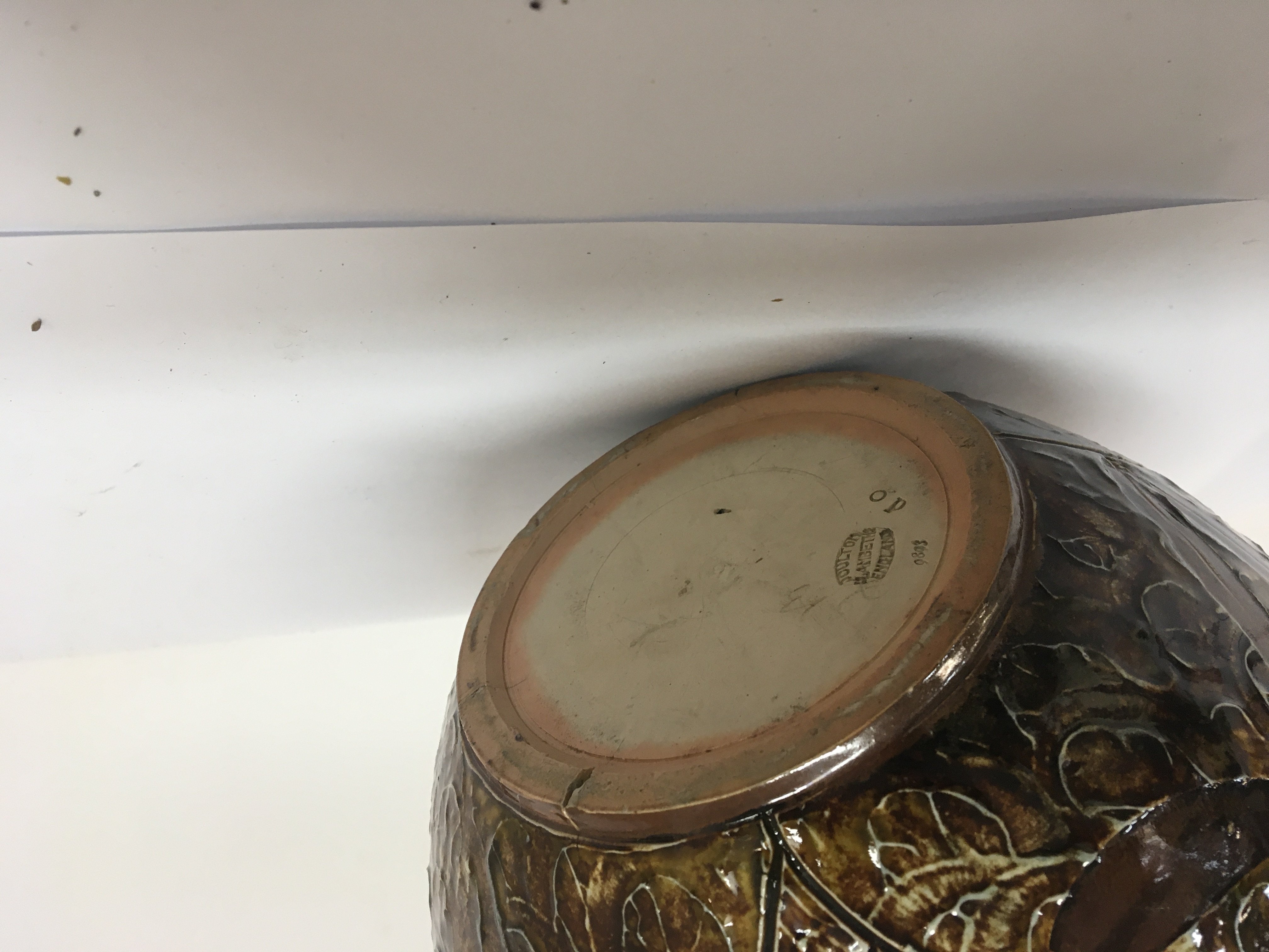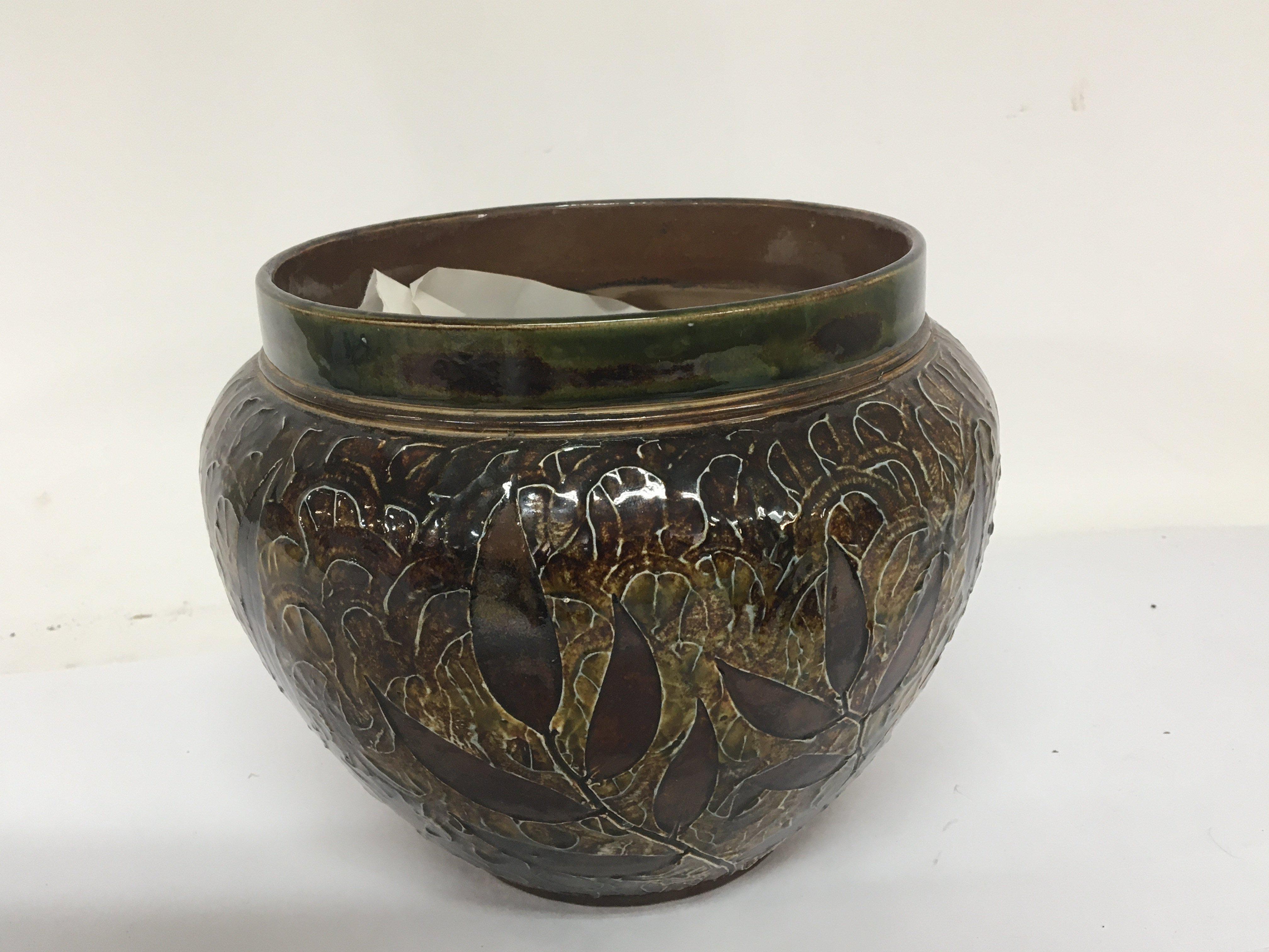 A Lambeth Doulton stoneware jardiniere decorated with impressed leaves no damage or restoration height 19cm.