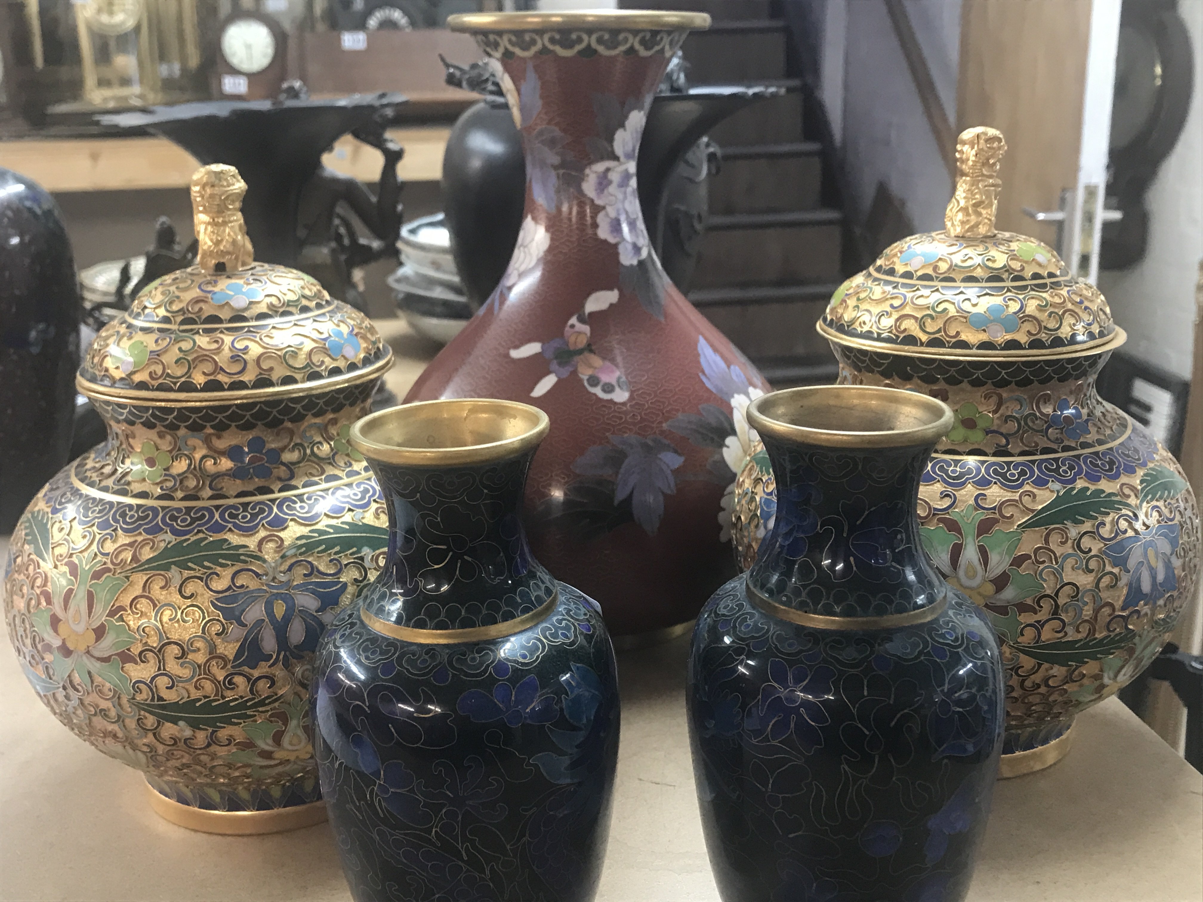 A collection of Chinese cloisonné including two pairs of vases .and a floral vase .