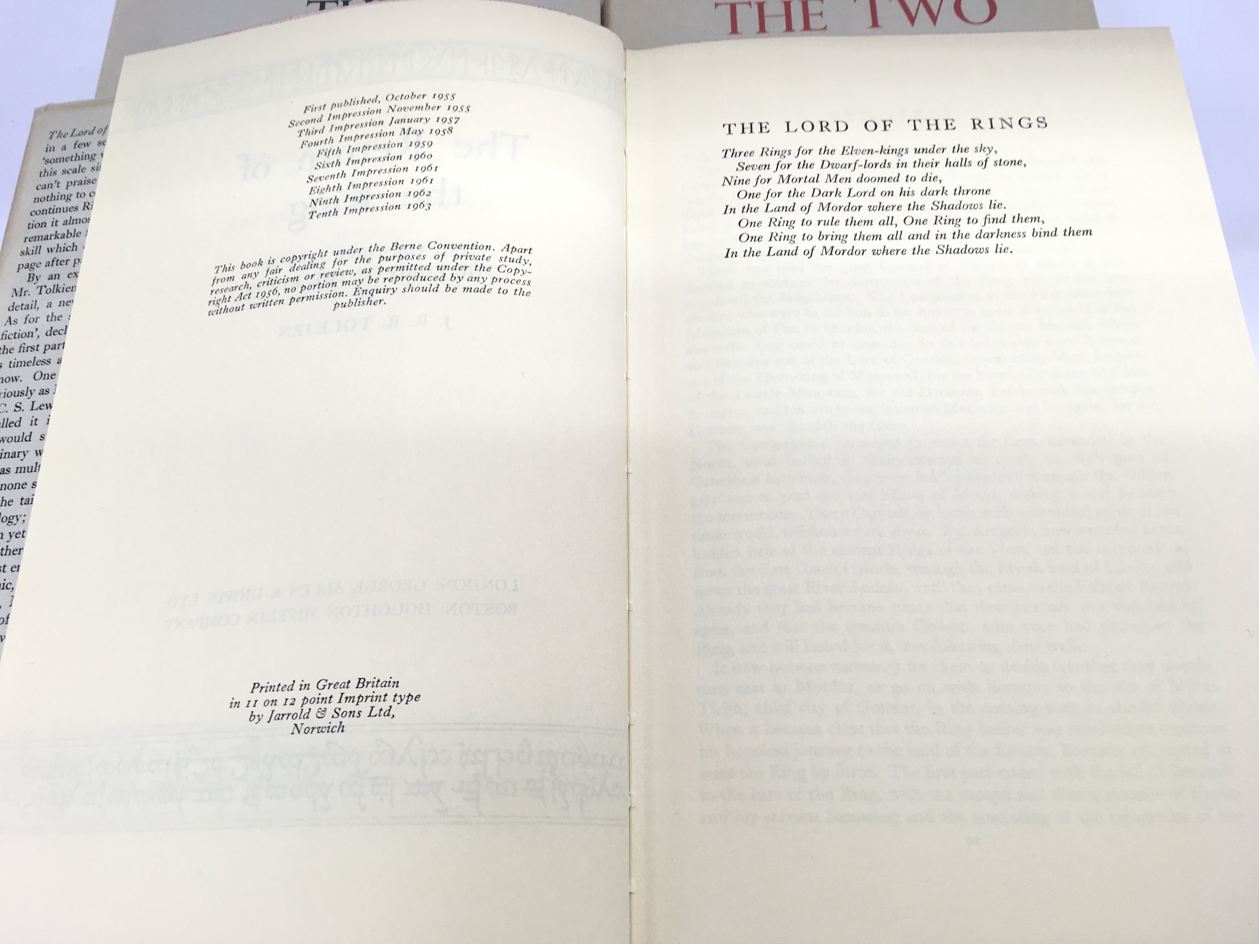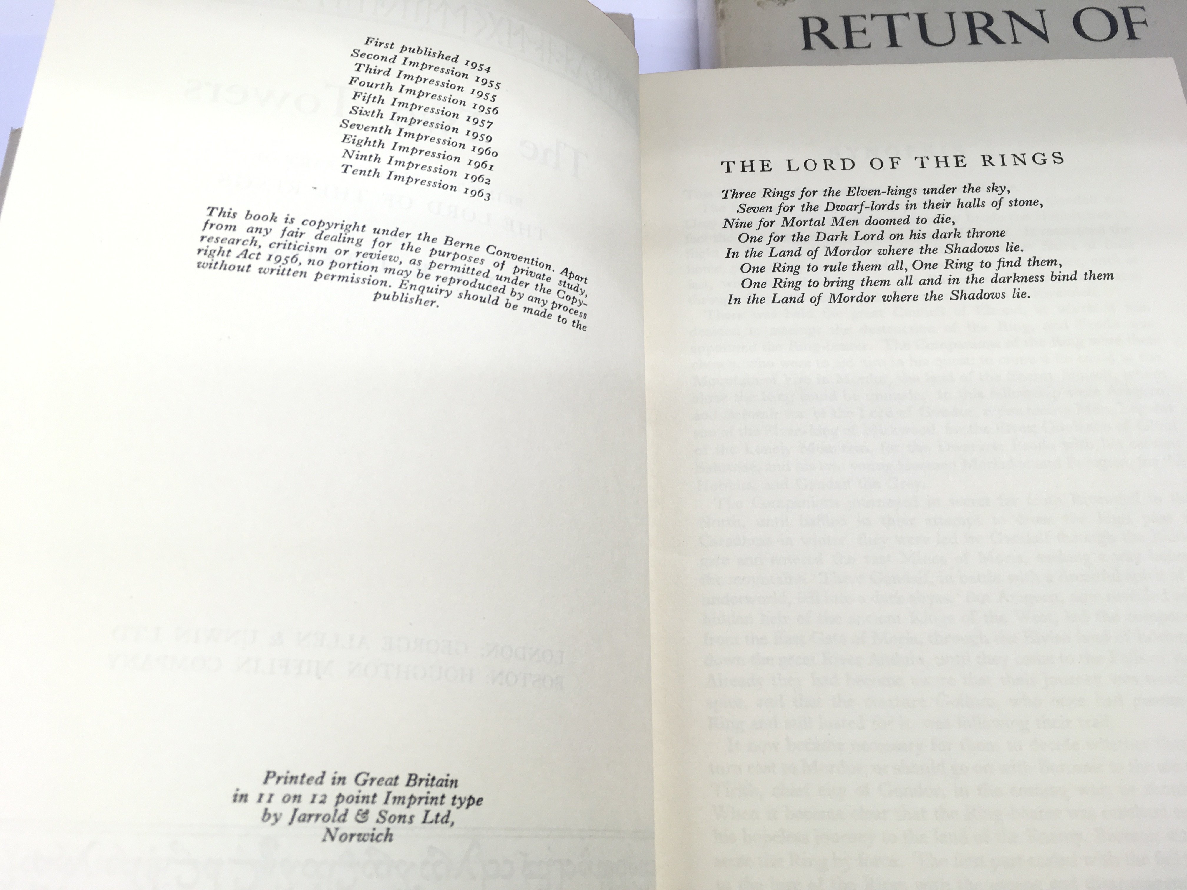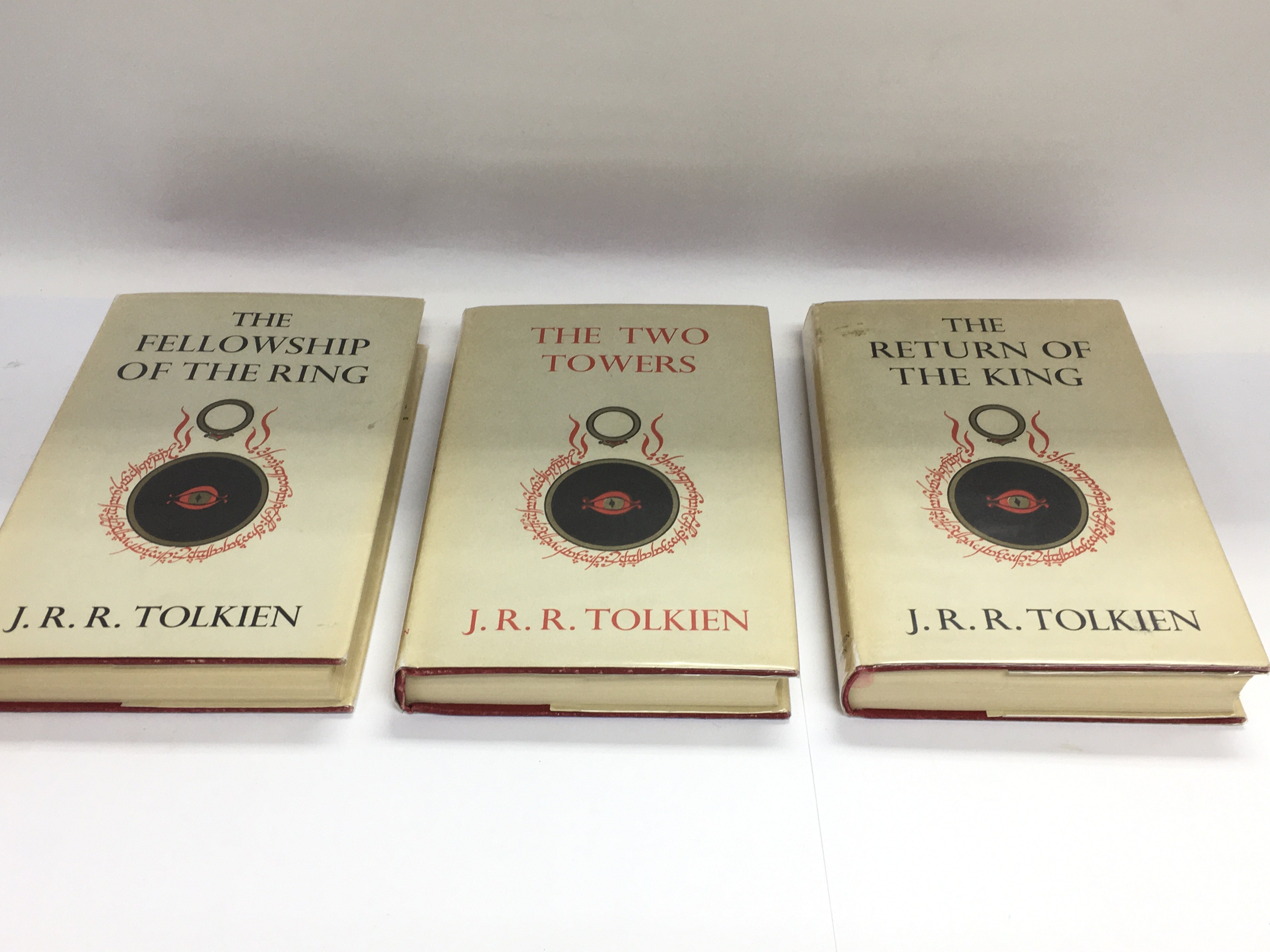 Three early volumes of JRR Tolkien's Lord Of The Rings trilogy comprising a 12th impression of 'The Fellowship Of The Ring' and 10th impressions of both 'The Two Towers' and 'The Return Of The King'. All still retaining their dust covers. Shipping category B.