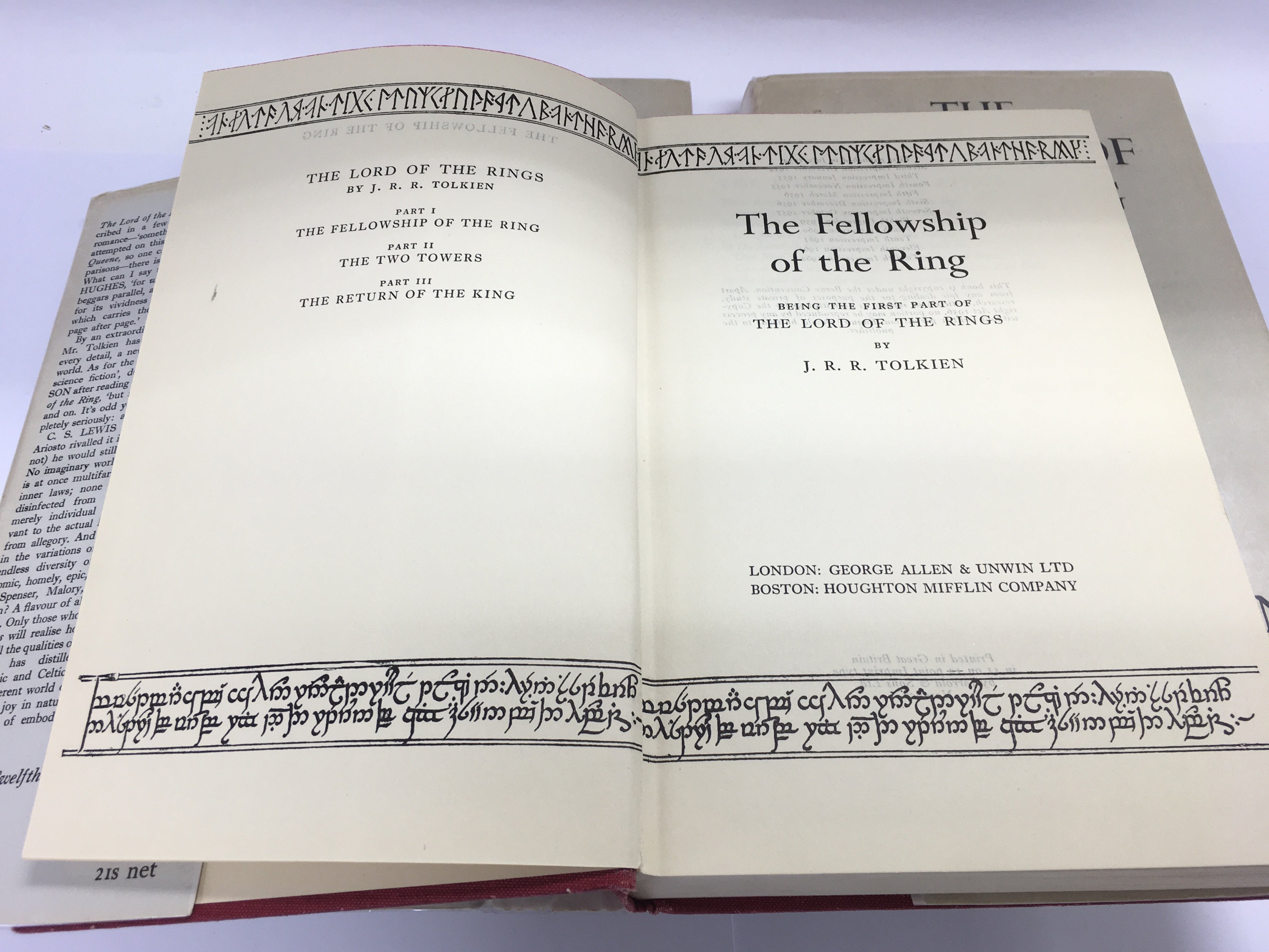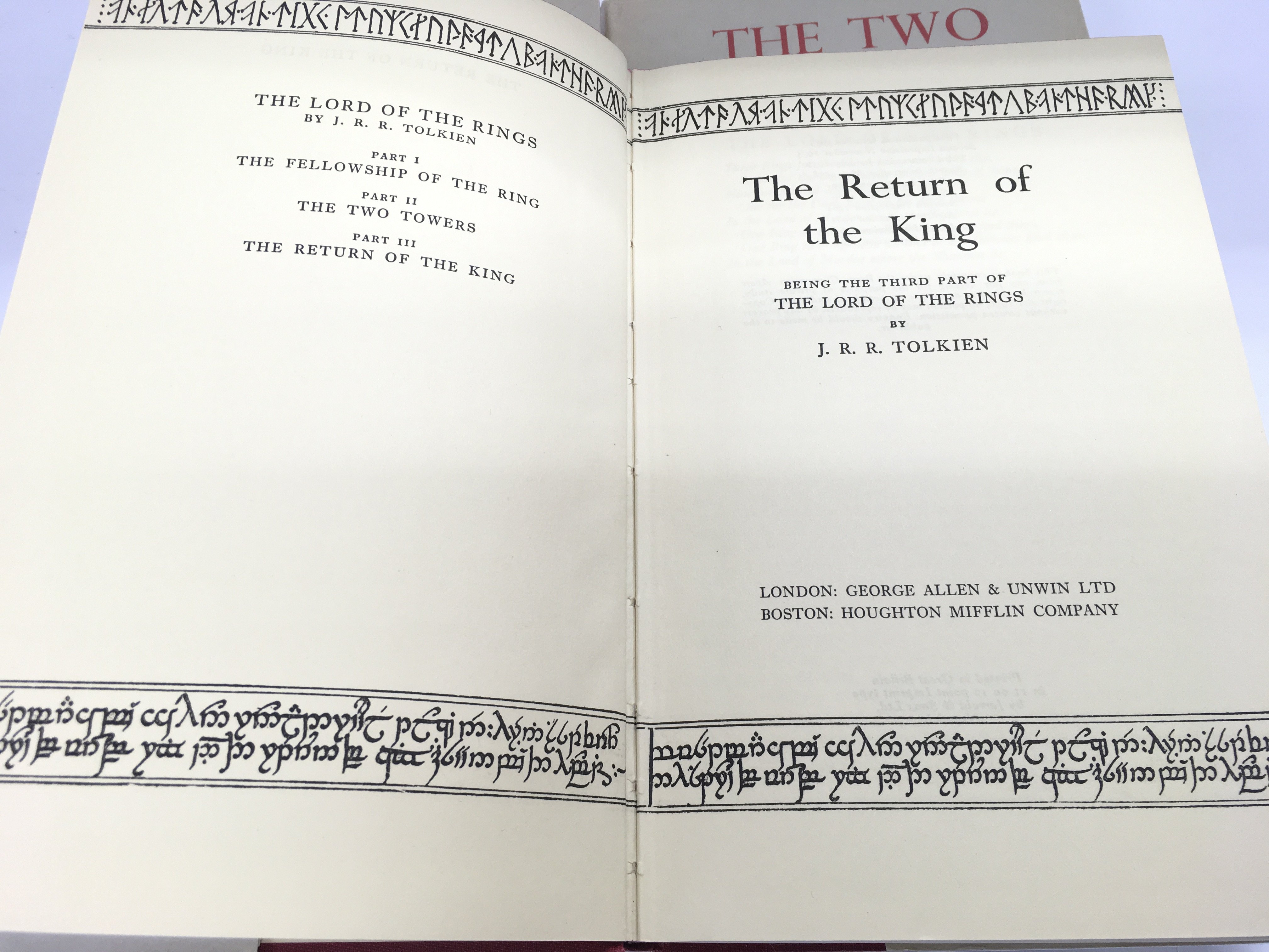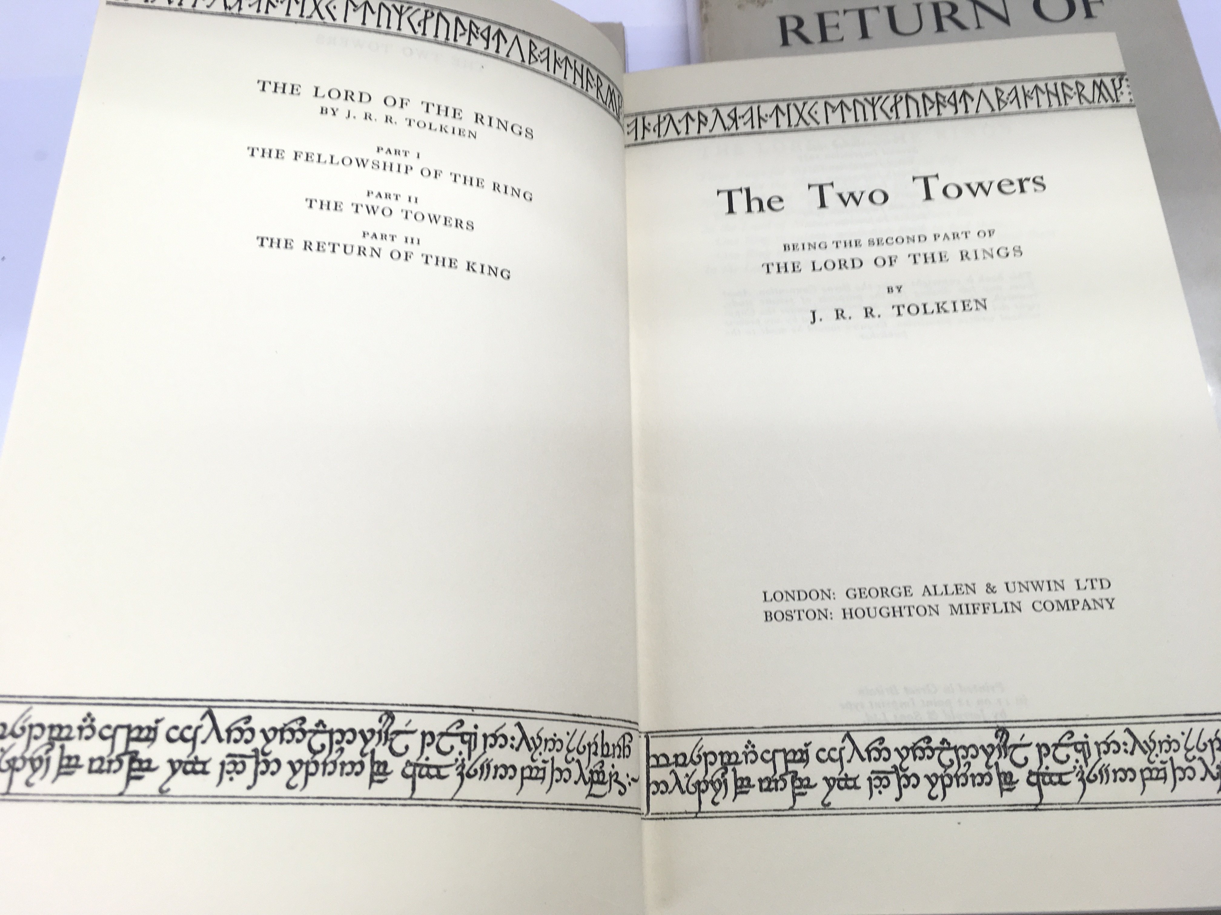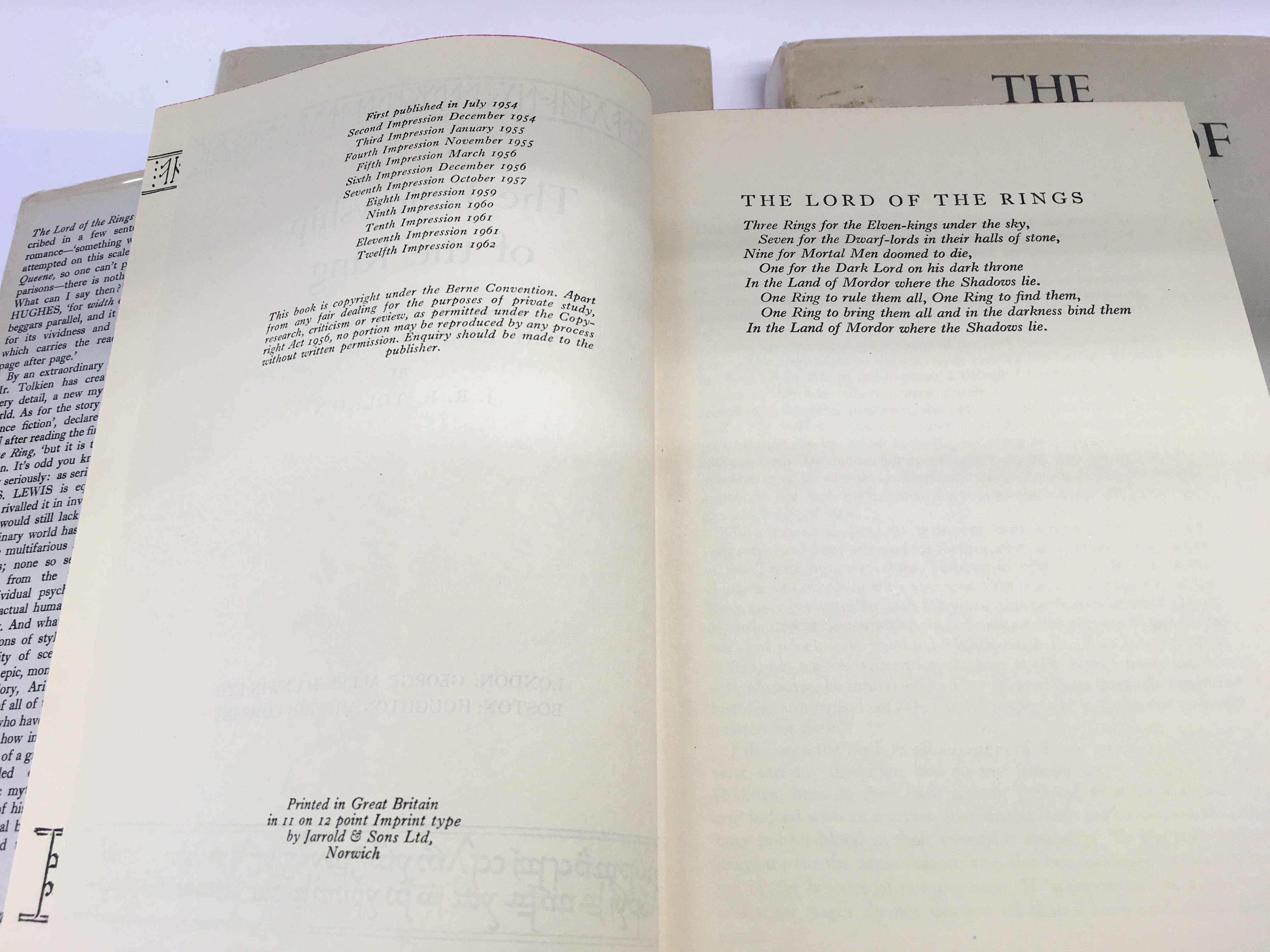 Three early volumes of JRR Tolkien's Lord Of The Rings trilogy comprising a 12th impression of 'The Fellowship Of The Ring' and 10th impressions of both 'The Two Towers' and 'The Return Of The King'. All still retaining their dust covers. Shipping category B.