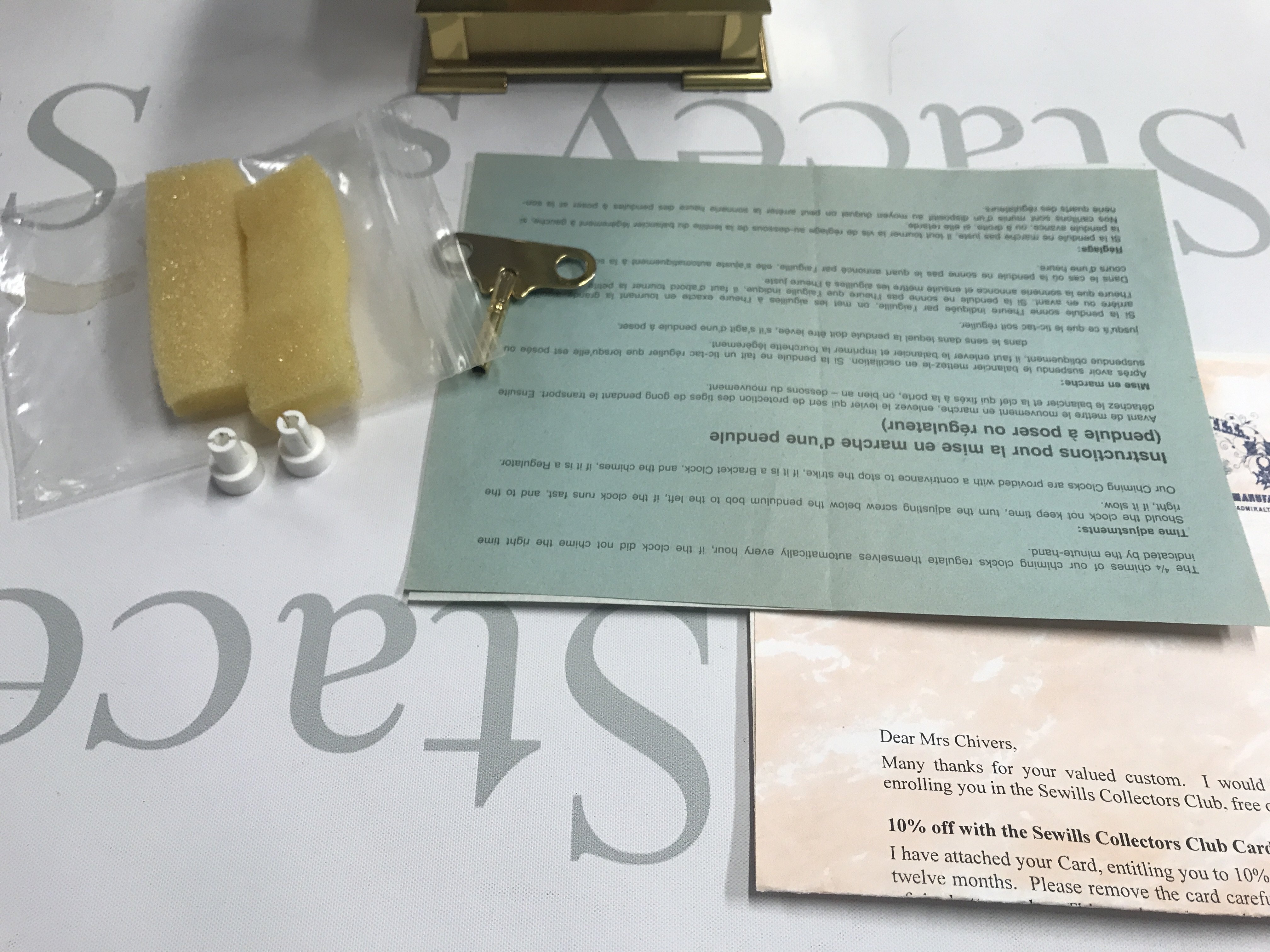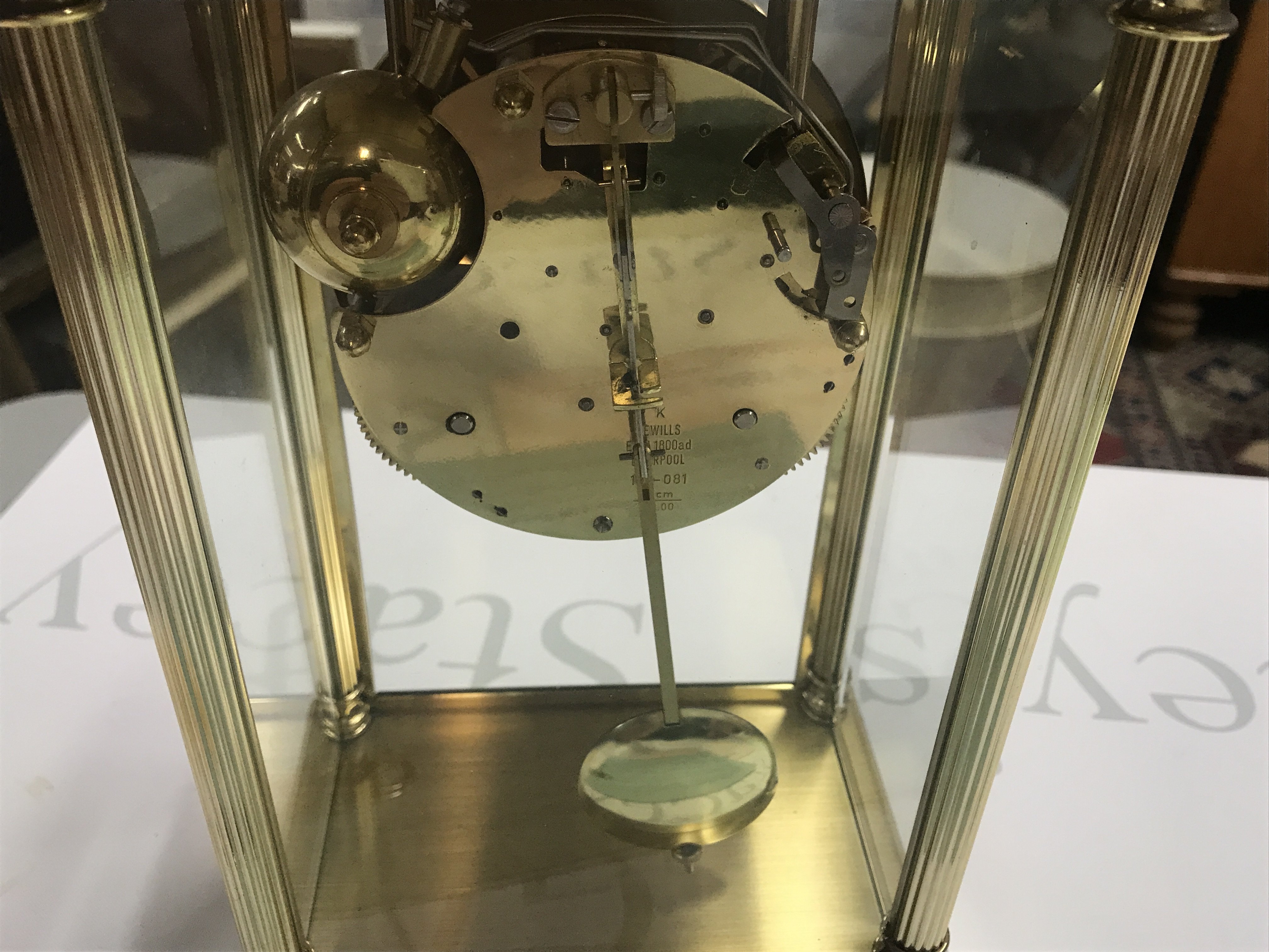 A Sewills brass pendulum mantle clock. Winds and runs. 17cm wide and 28cm high. Postage D