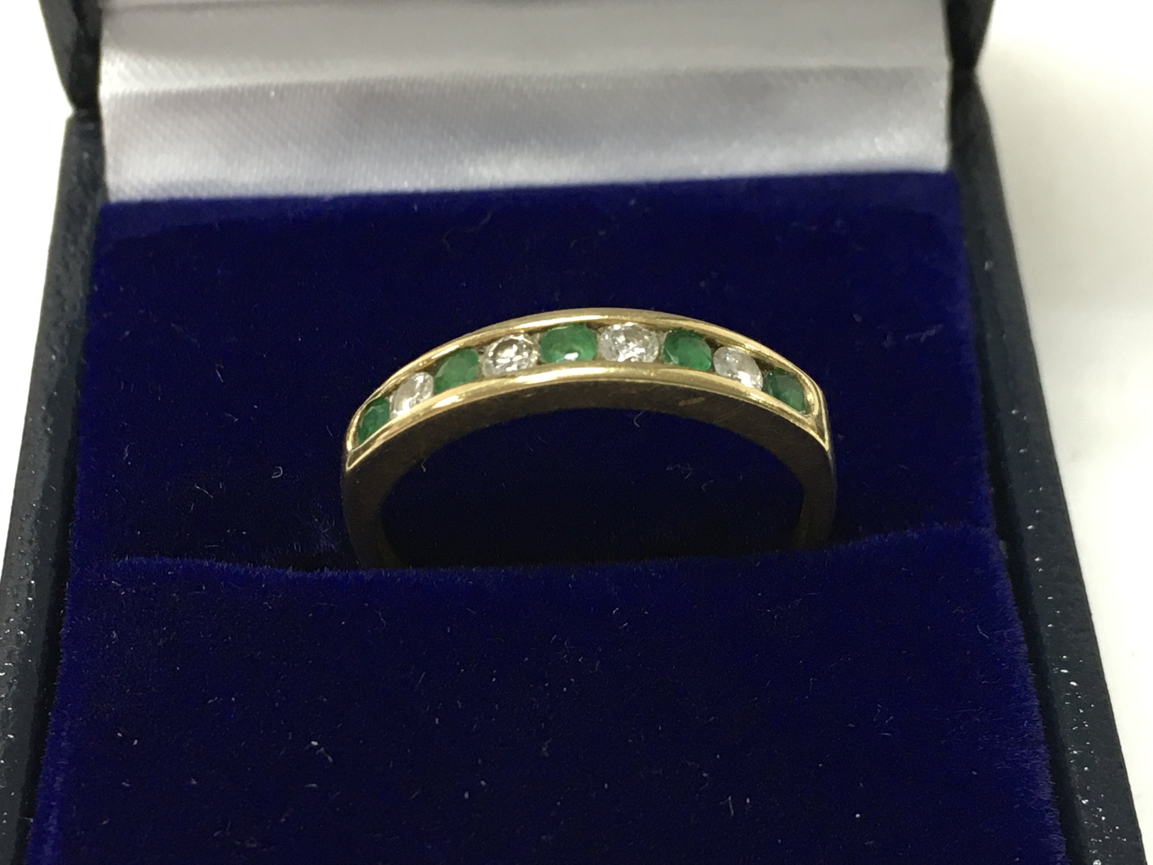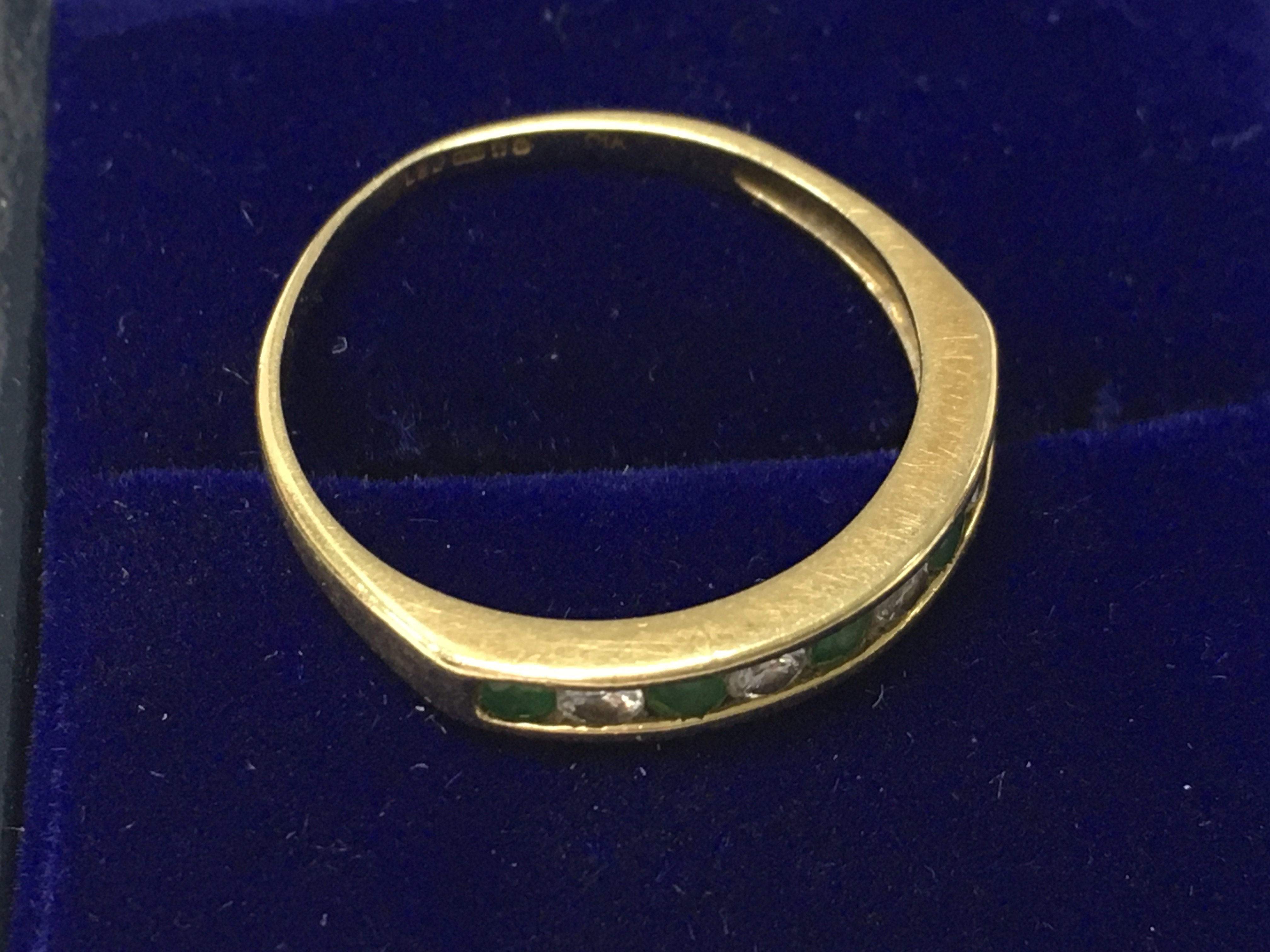 An 18ct gold emerald and diamond set half eternity ring. Size P/Q. Total weight 2.5g. Postage category a