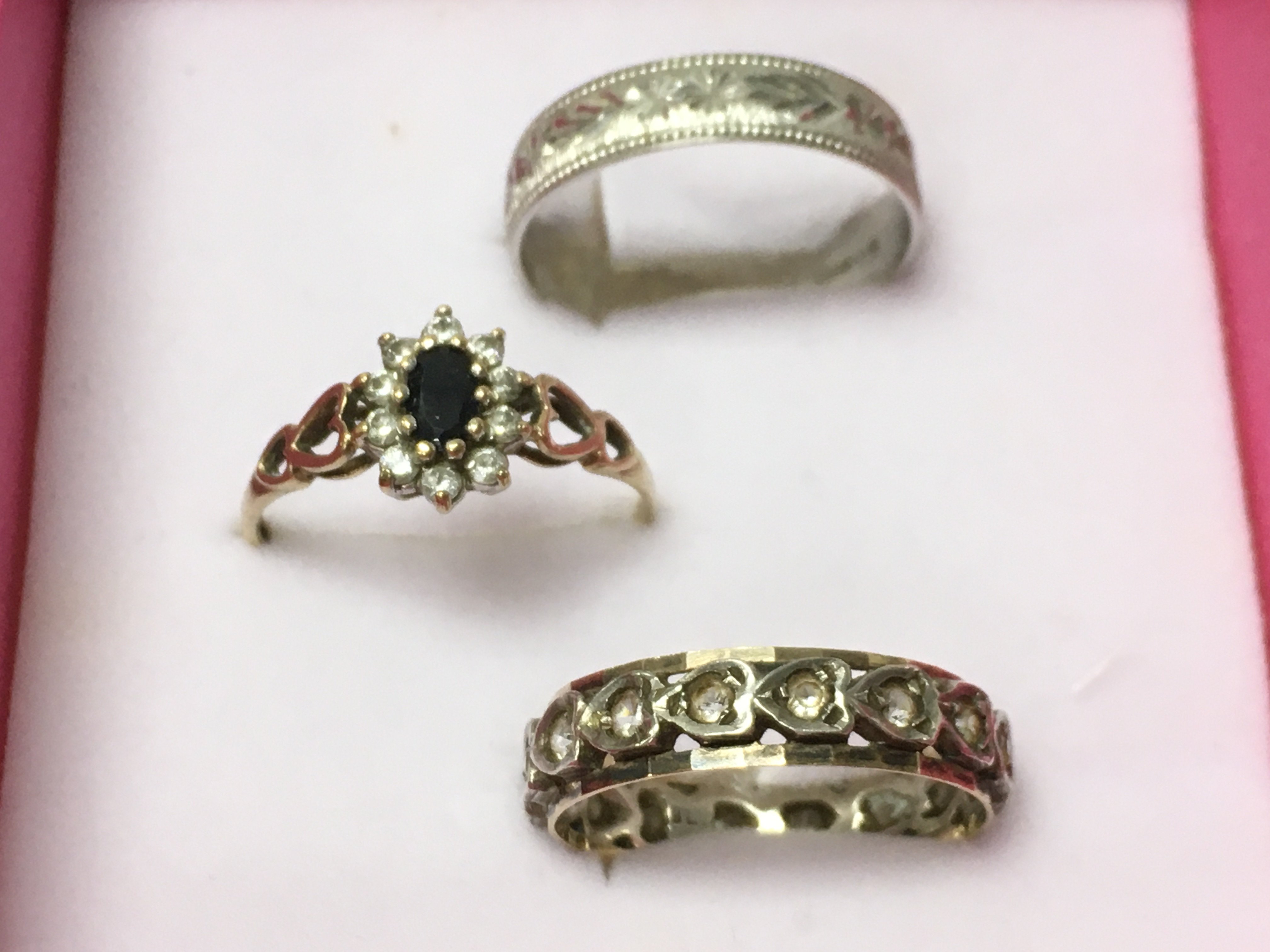A 9ct carat white gold band, a 9ct gold and silver eternity ring and a 9ct gold sapphire and cubic zirconia set ring. Total weight 5.3g. Size N/O, M, R. Postage category a