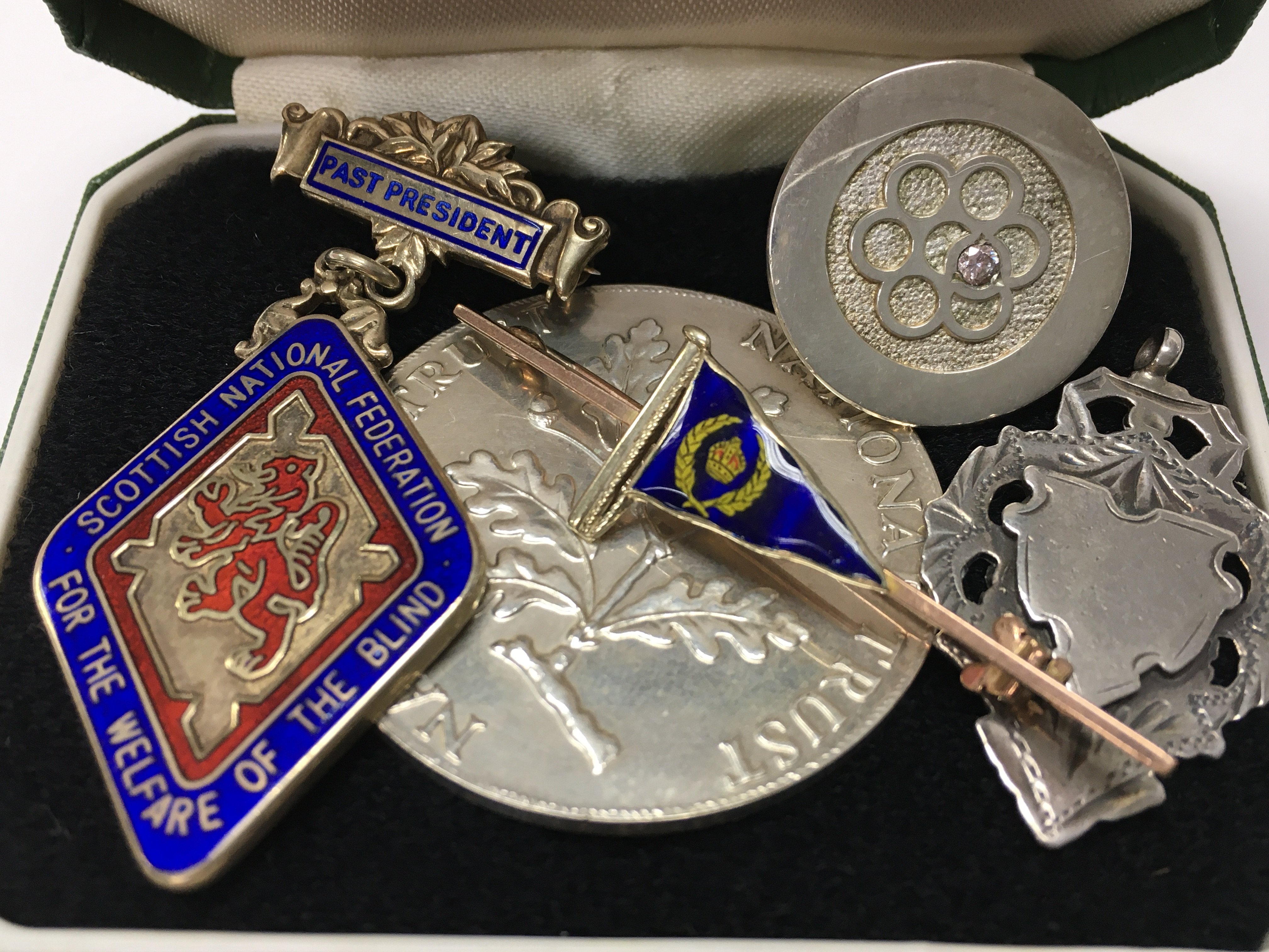 A 9ct gold and enamel flag brooch 3.3g in total, an enamelled Scottish National Federation for the blind brooch and some silver items. Postage category a