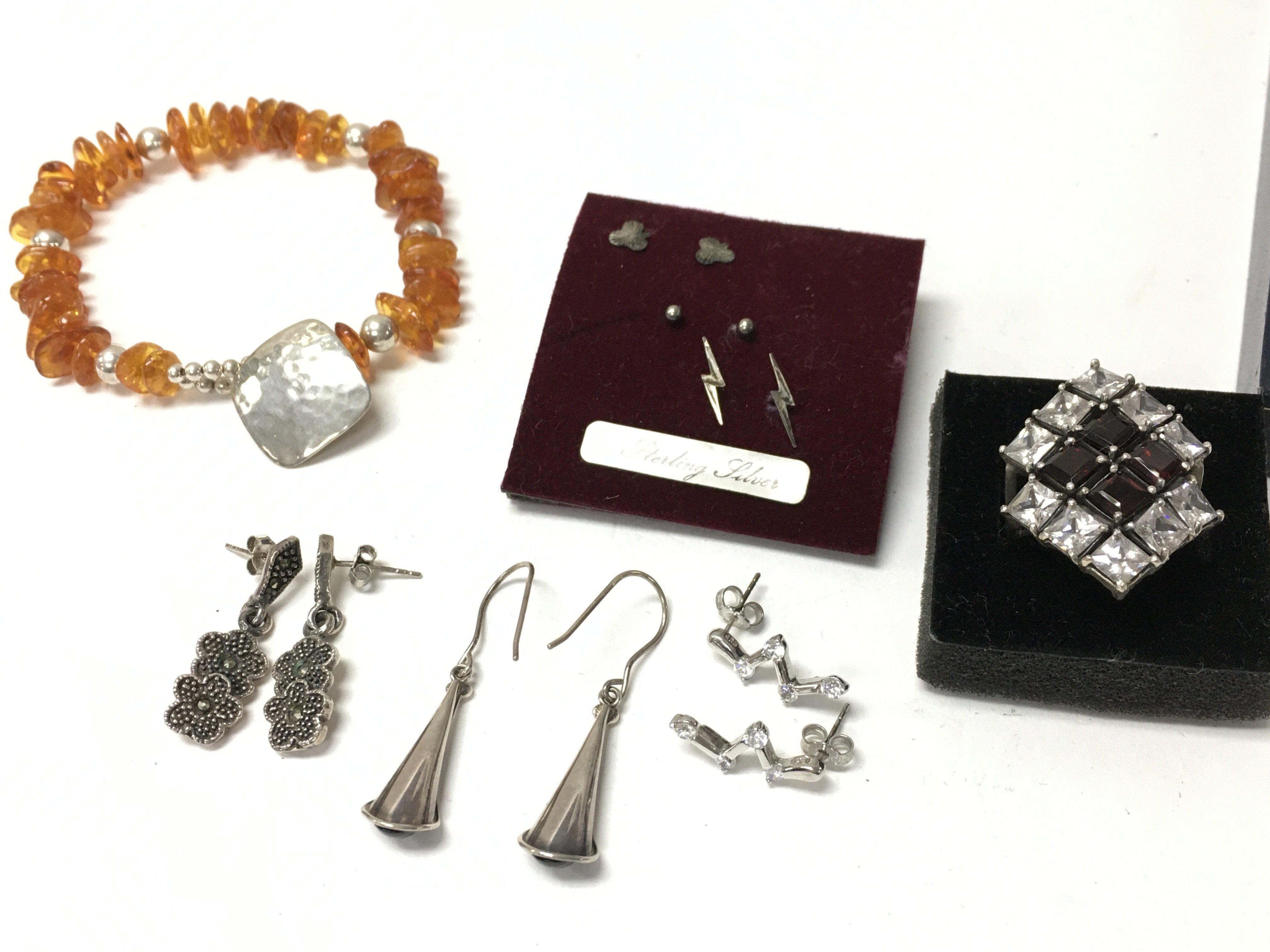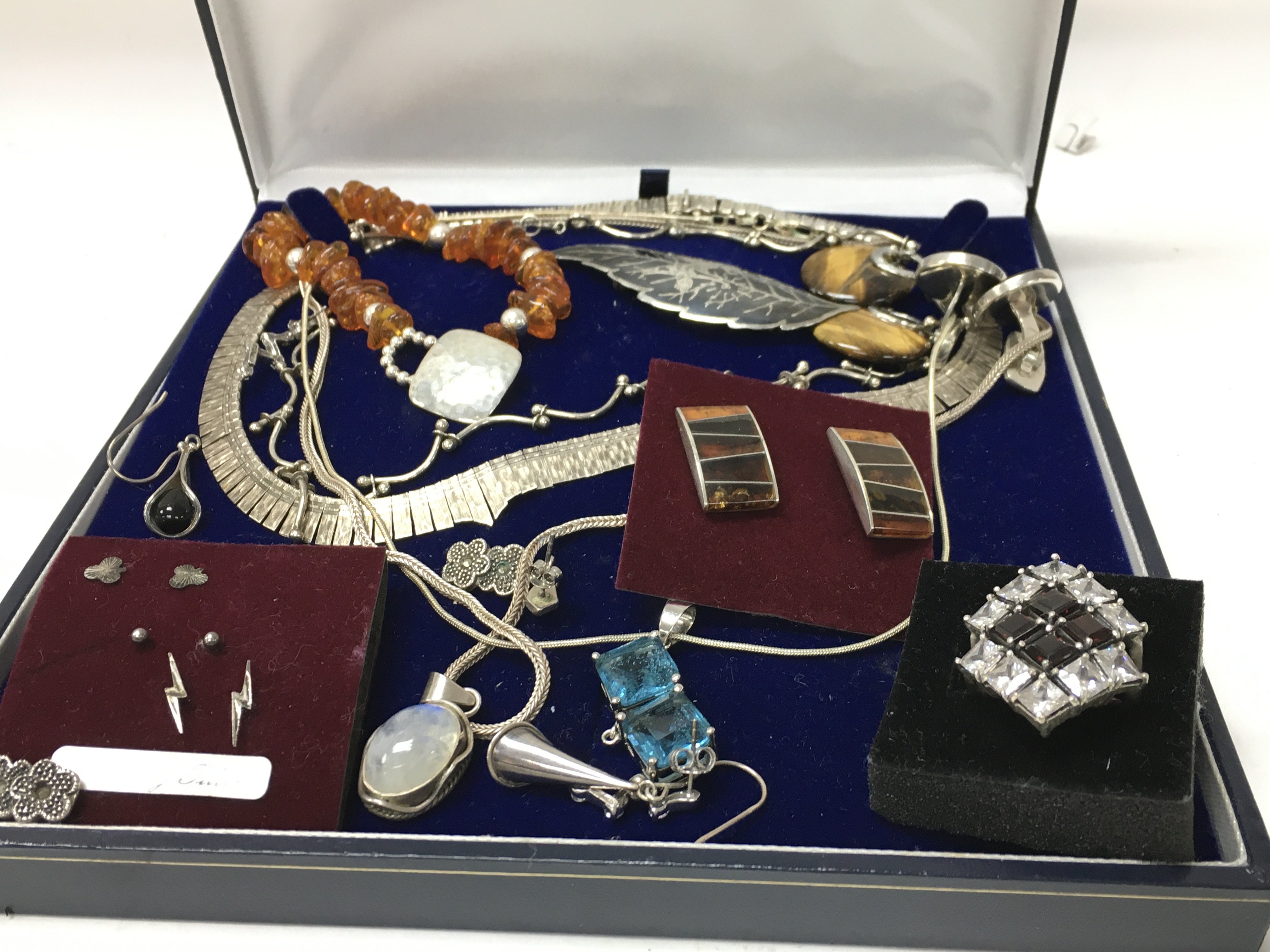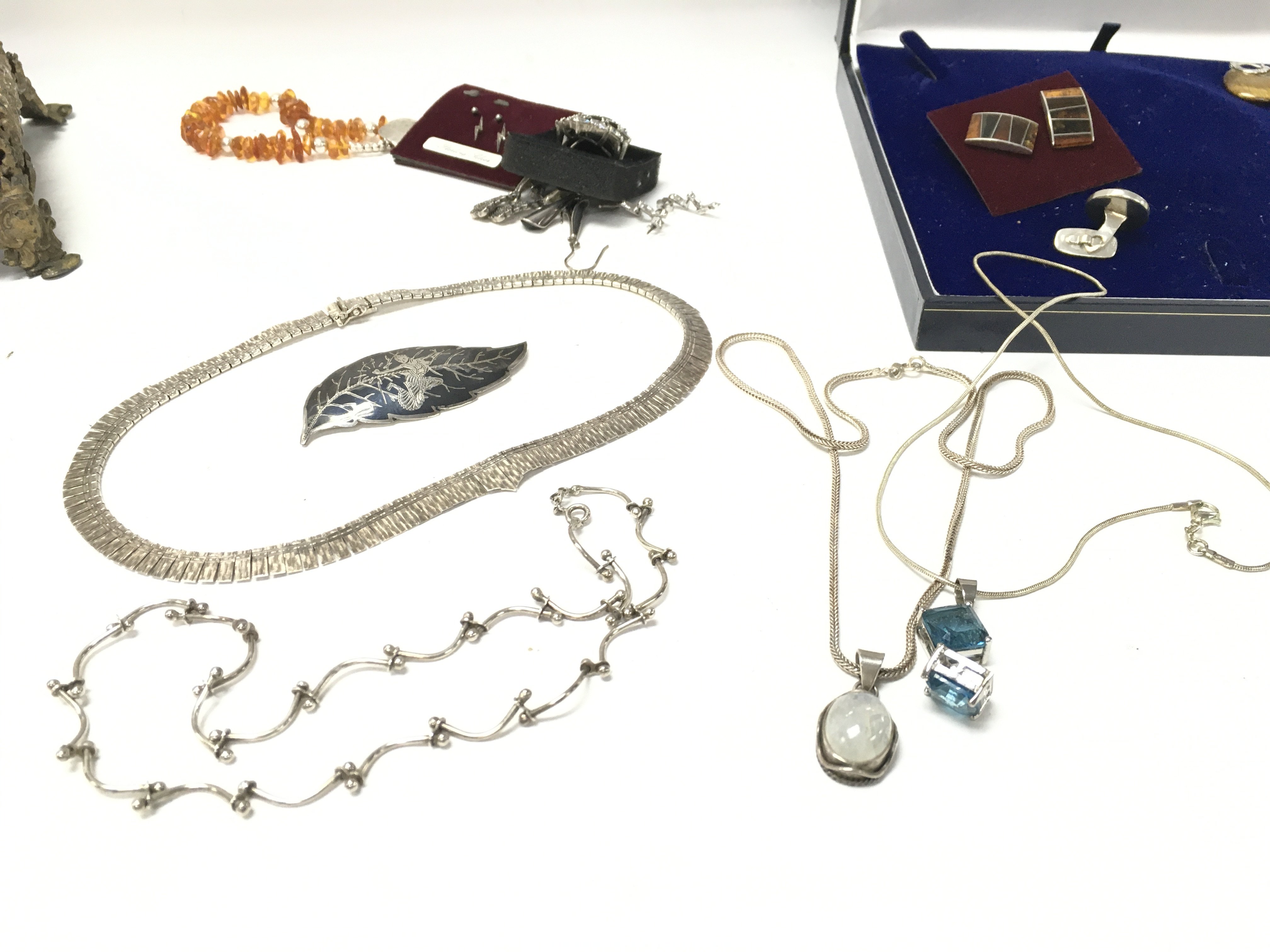 A mixed collection of silver costume jewellery including necklaces, earrings, a bracelet etc. Some items not silver. Postage category B