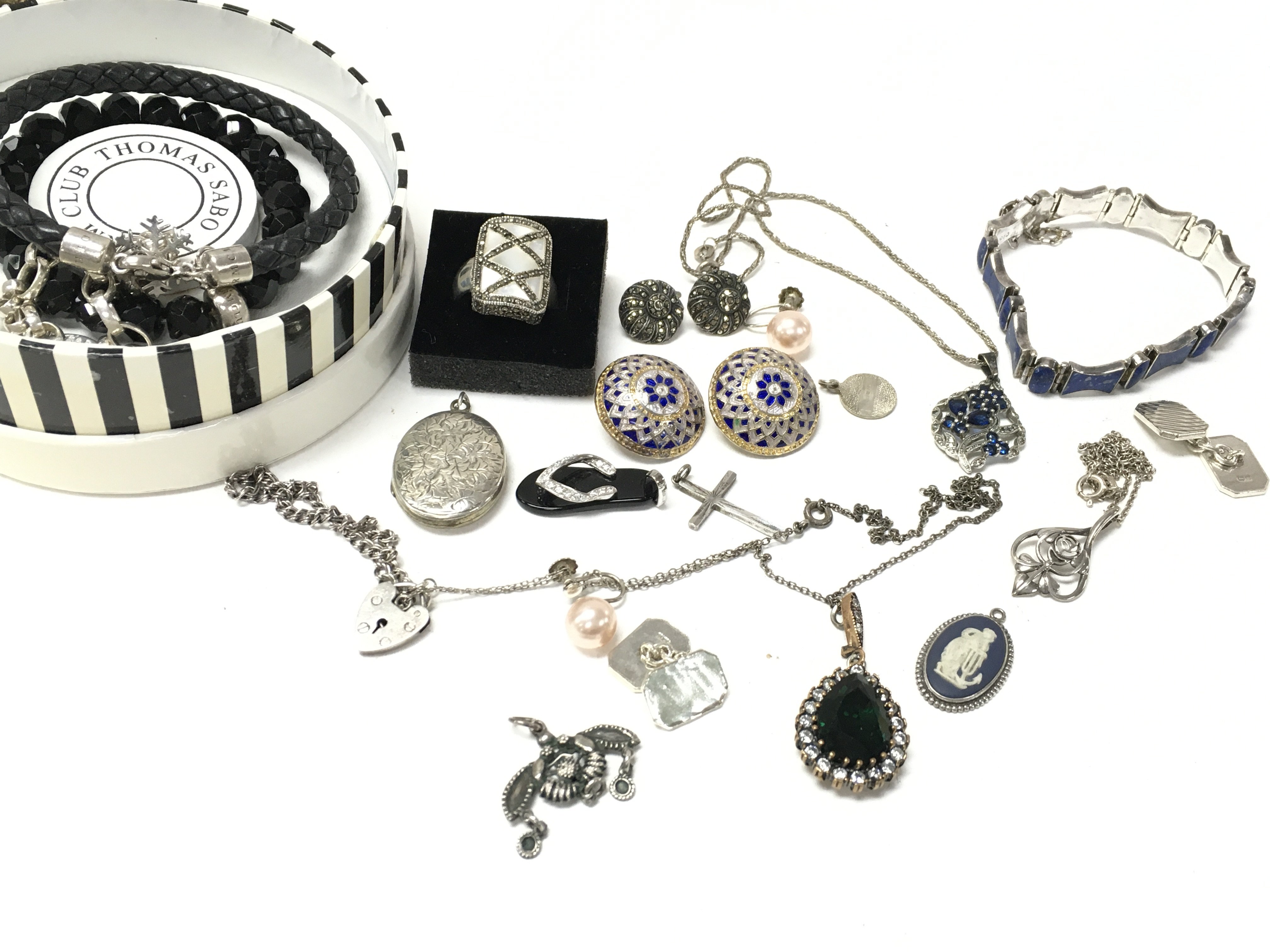 A collection of silver jewellery including necklaces, a ring, pendants, cufflinks. Postage category B