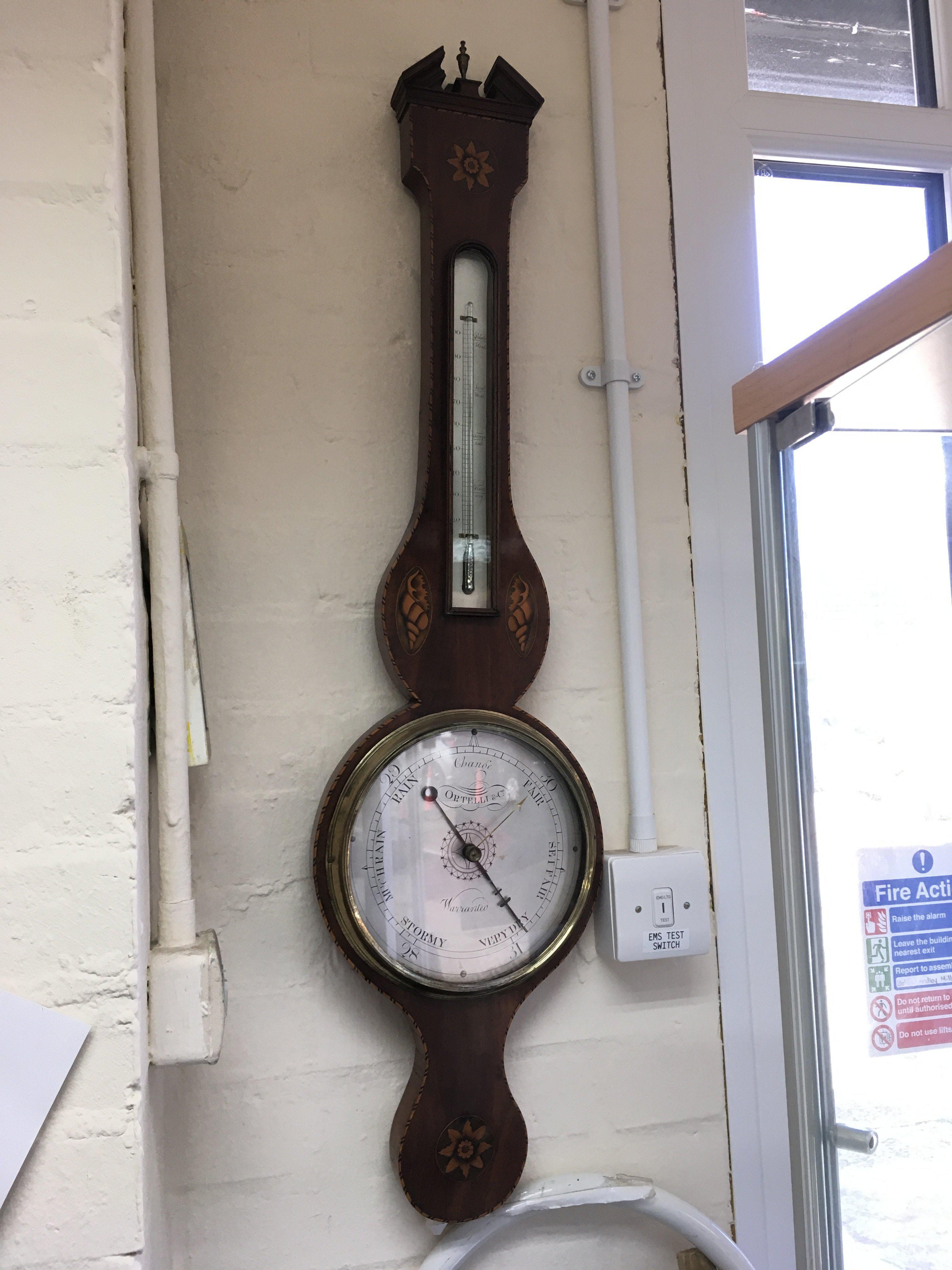 An inlaid mahogany wall barometer. Shipping category D.